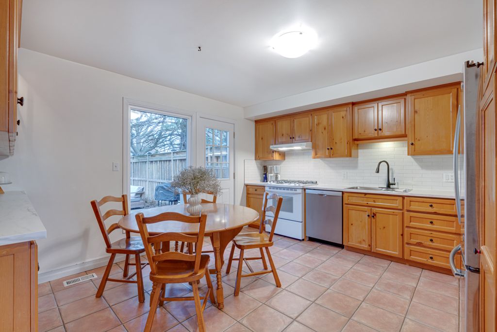 • Eat-in kitchen has stainless steel appliances and walkout to backyard.