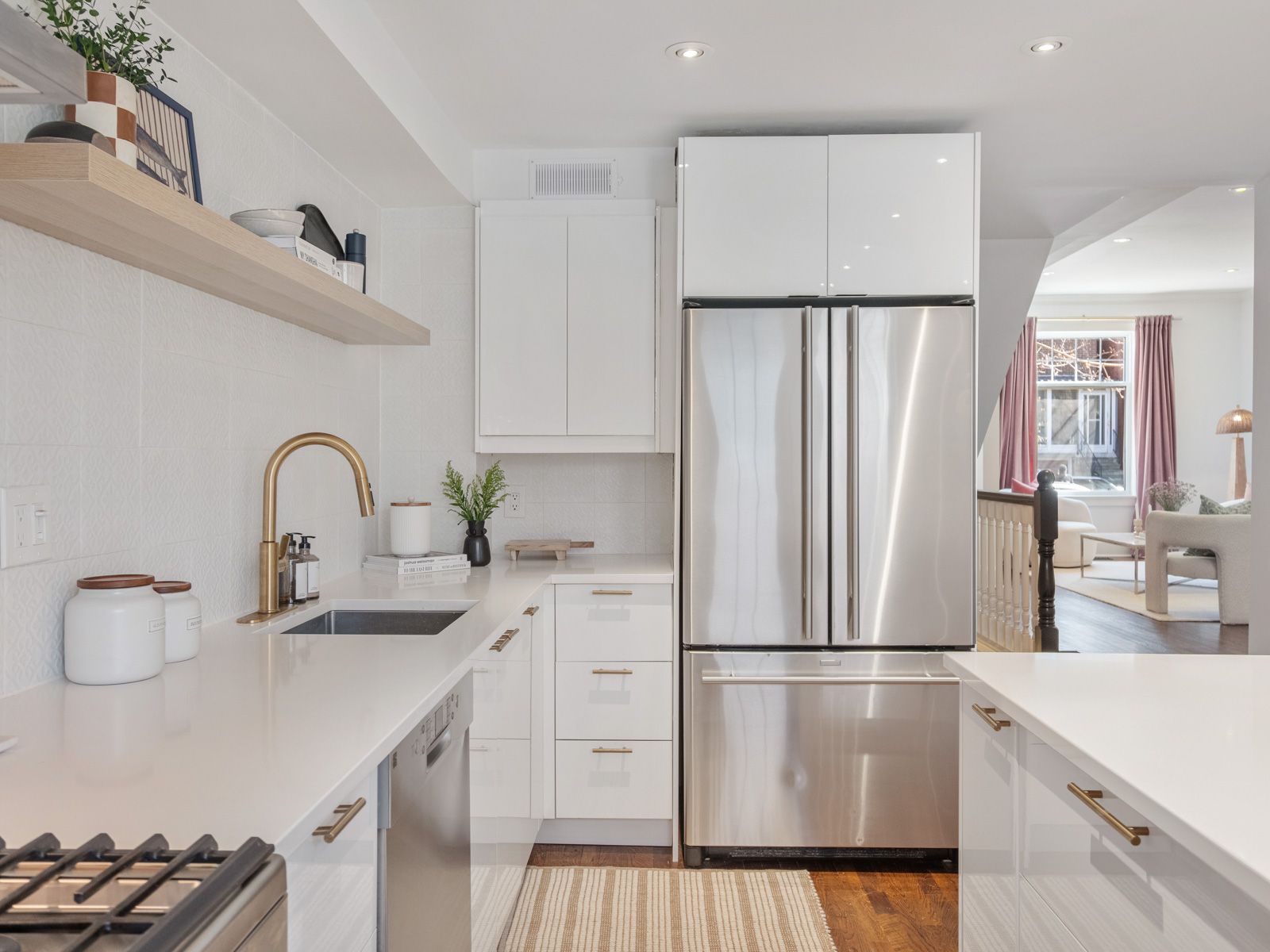 • Renovated kitchen features stainless steel appliances and quartz countertops.