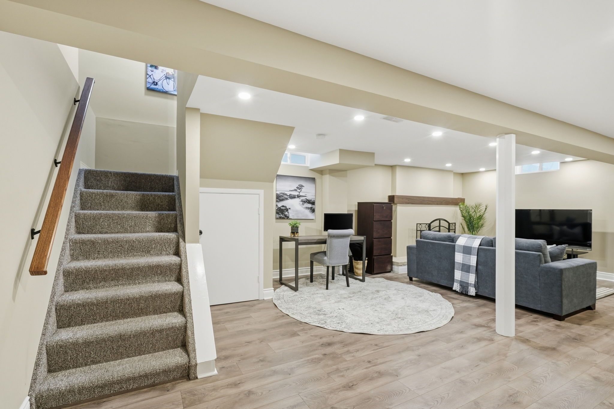 • Finished basement with cozy rec room for entertainment.