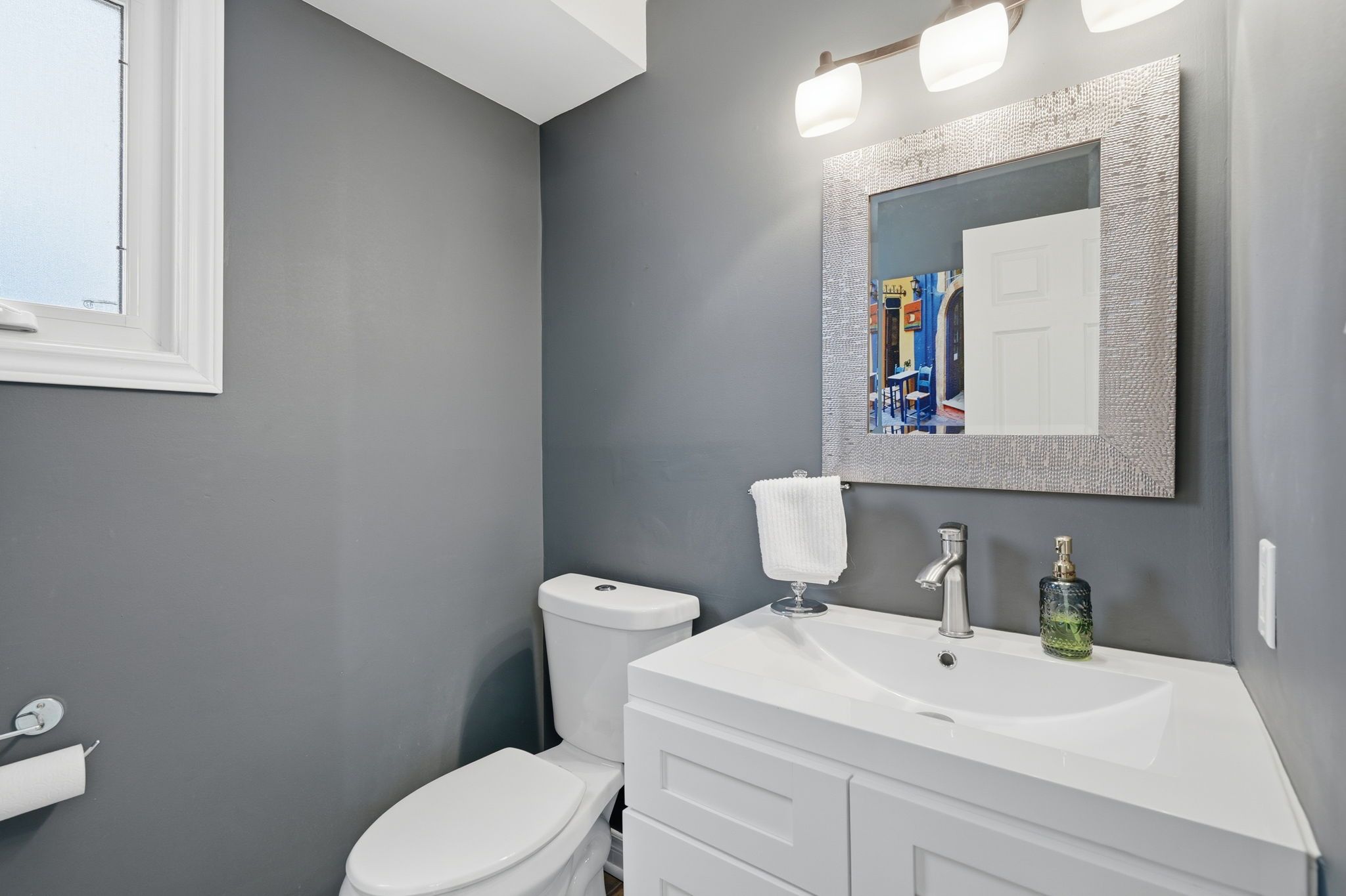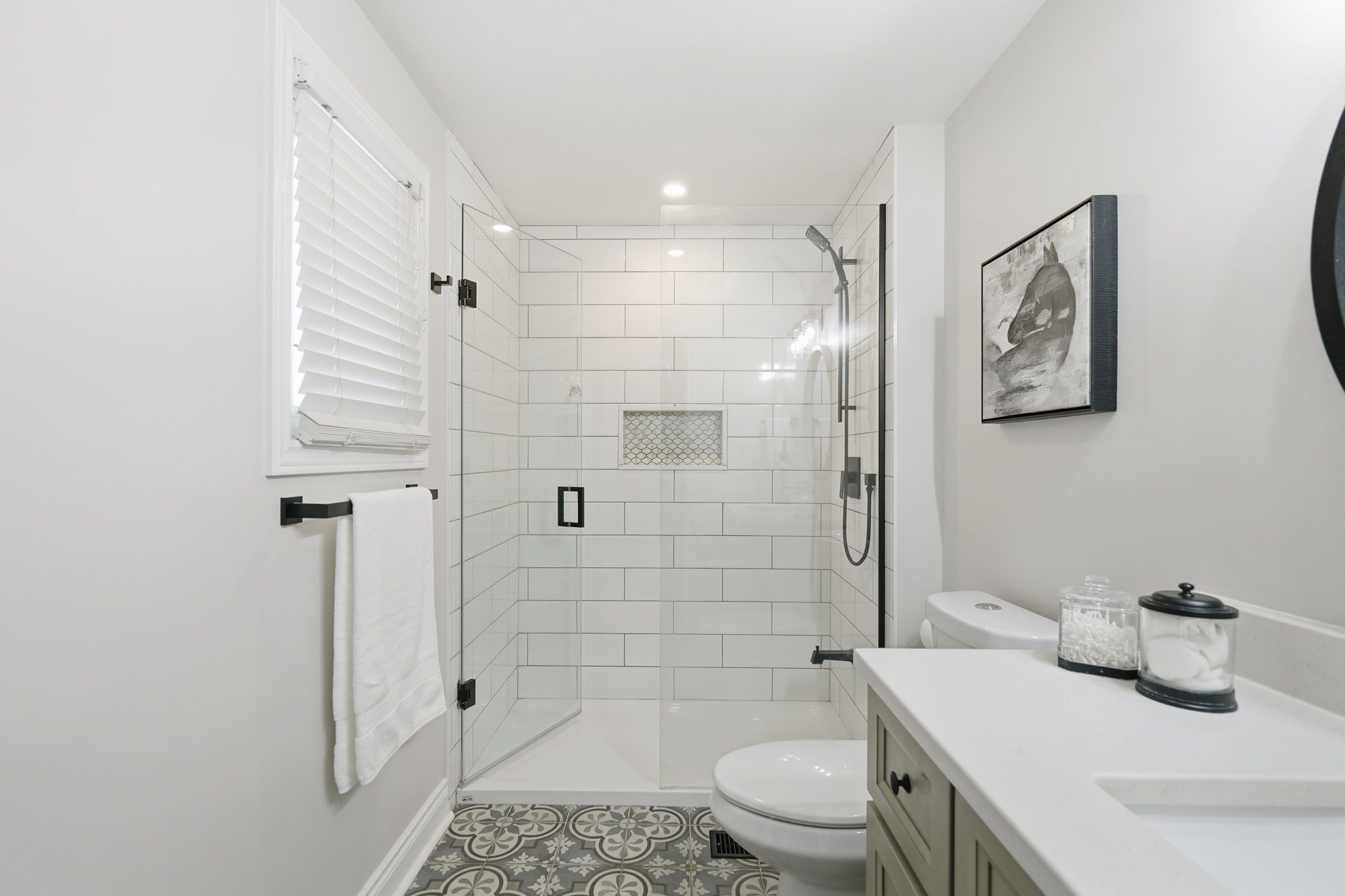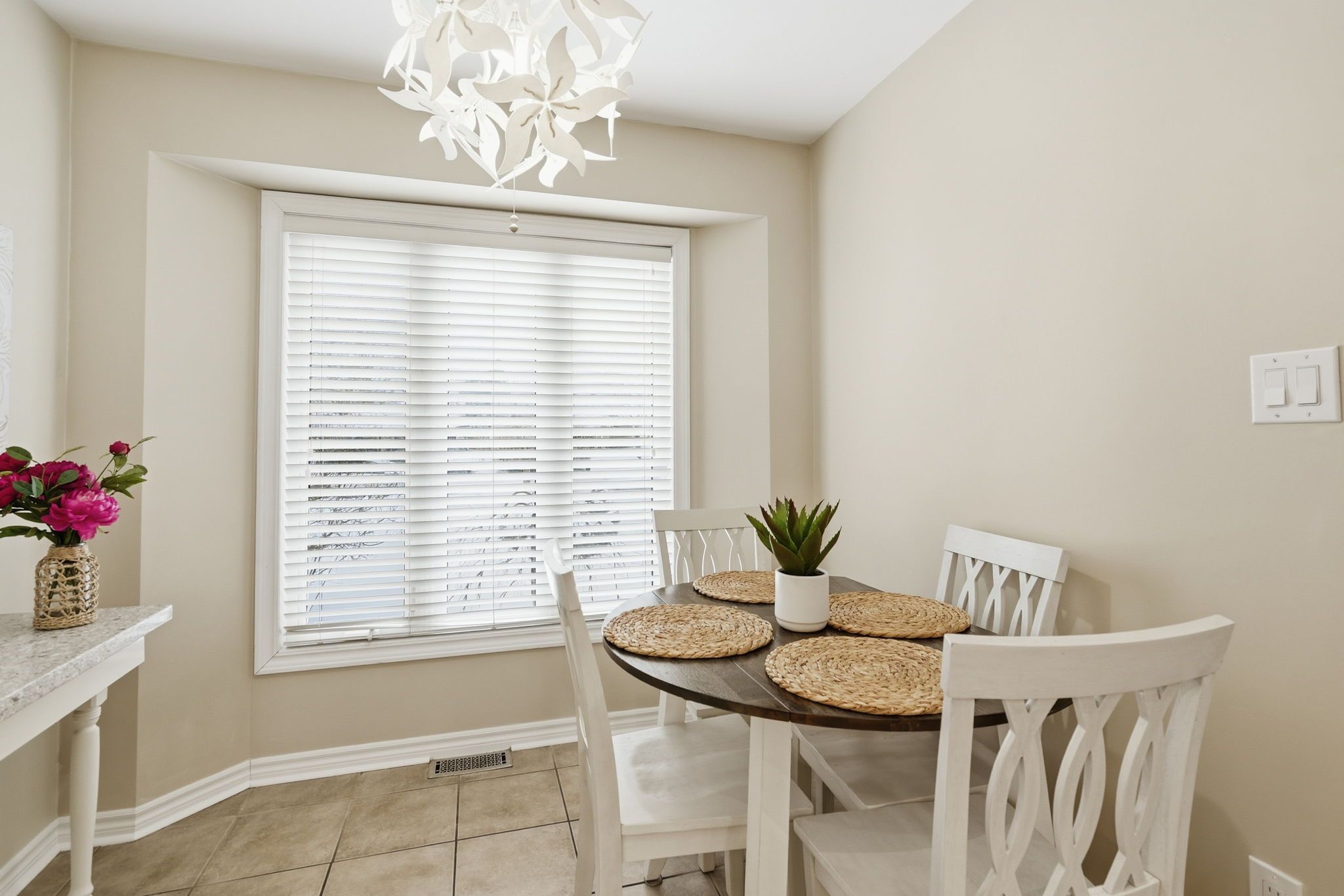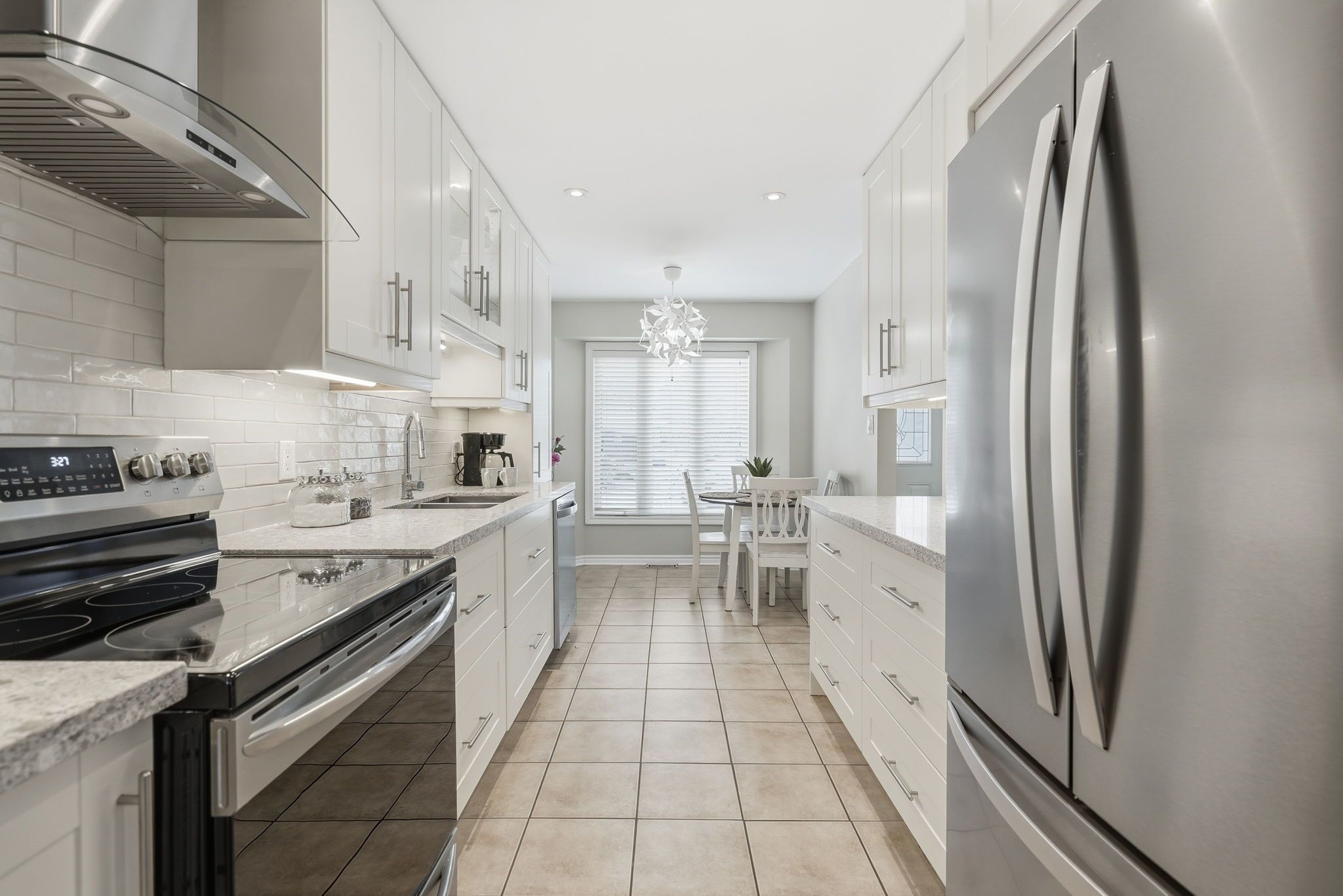• Bright kitchen with quartz countertops and stainless-steel appliances.