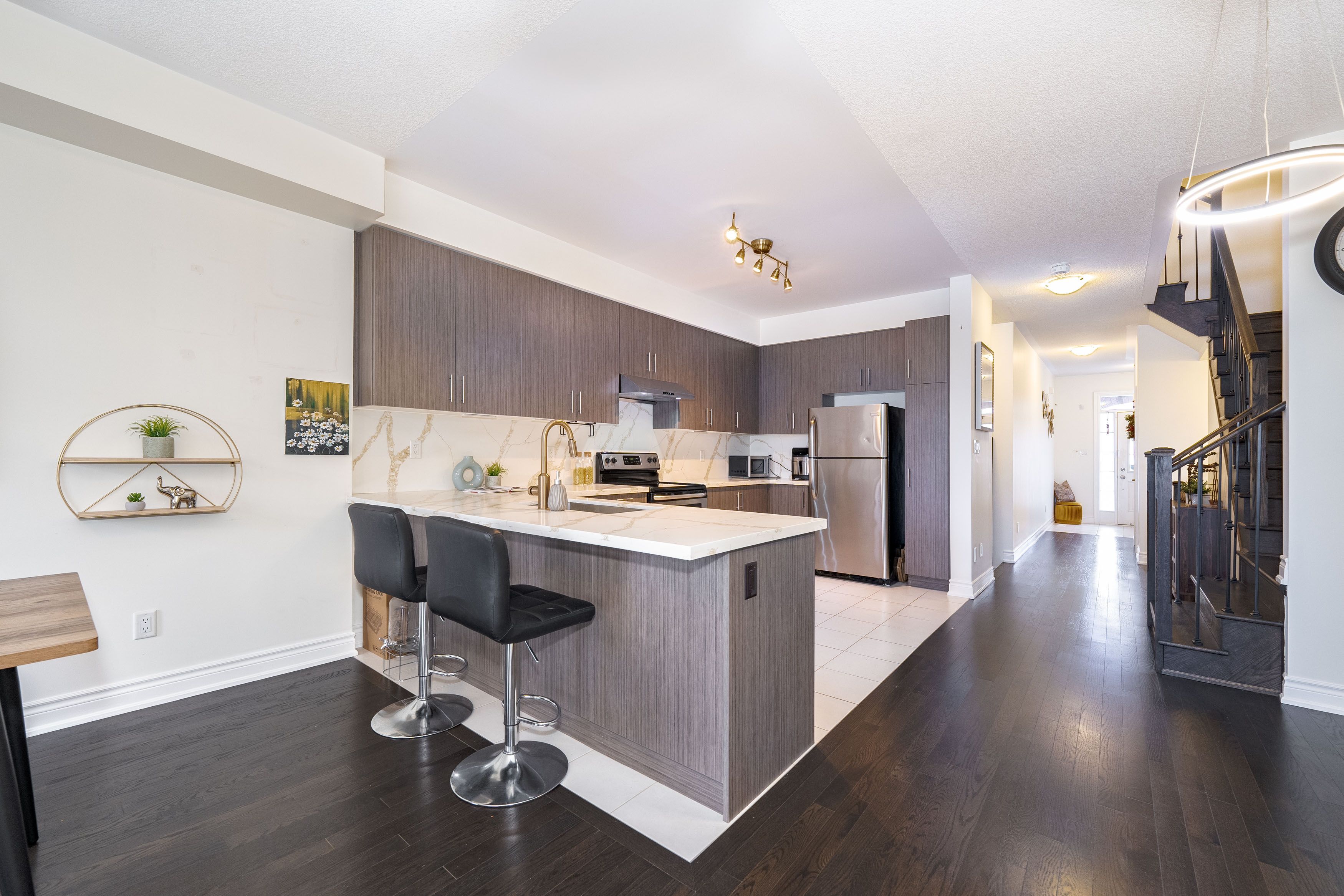 Your dream home awaits! This stunning 3-bedroom townhouse, with approximately 1800 sq. Ft. Of exquisite living space and breathtaking ravine views, offers the perfect combination of style, comfort, and practicality. Step inside to a bright and airy open-concept main floor, where soaring 9 ft ceilings enhance the sense of space and light. The walk-out basement opens to your own private, oversized lot-ideal for summer bbqs, outdoor entertaining, or simply unwinding in a tranquil setting. The master bedroom boasts sweeping ravine views and two generous walk-in closets, offering a peaceful retreat at the end of the day. Convenience is key, with direct garage access to the backyard and a spacious second-floor laundry room with large linen closet and cold room in basement. Located in a safe, family-friendly community, you'll be just a short stroll from top-rated schools, parks, scenic trails, costco, shopping malls, and a brand-new community centre. And with easy access to highway 404 and the go train, your daily commute will be stress-free. This home has been tastefully upgraded, featuring engineered hardwood floors on the second level, fresh designer paint, modern light fixtures, and a custom kitchen quartz countertop with a matching backsplash. It's the perfect place to call home, ready for you to move in and start living your best life.