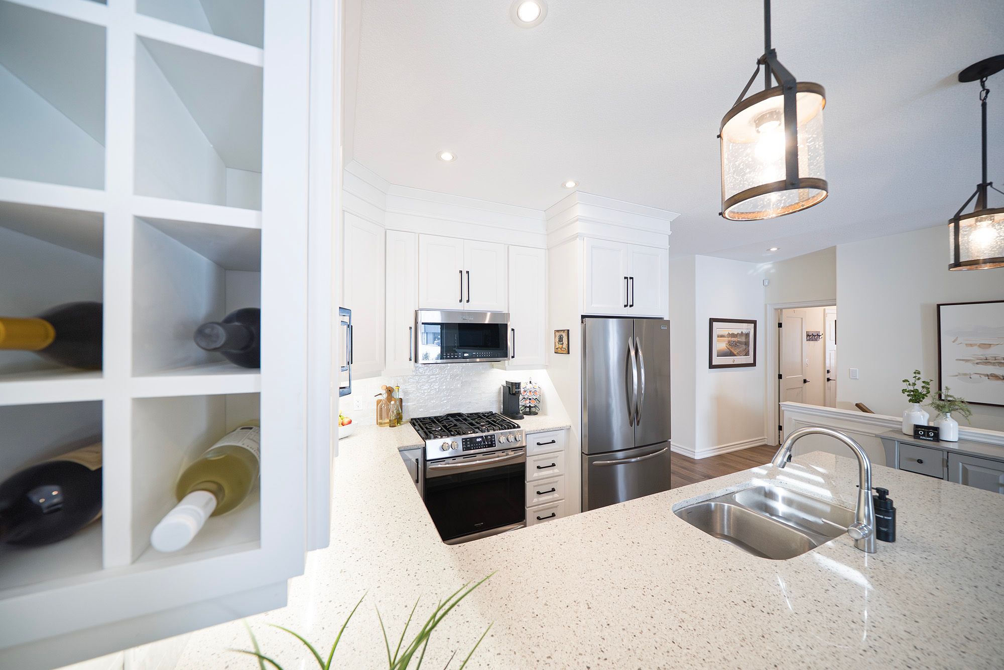 • Bright kitchen equipped with quartz countertops and stainless steel appliances.