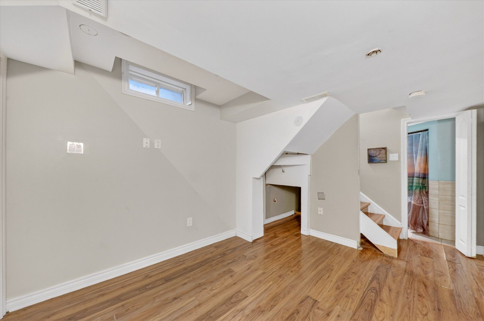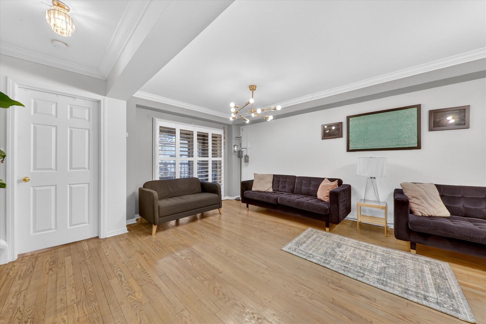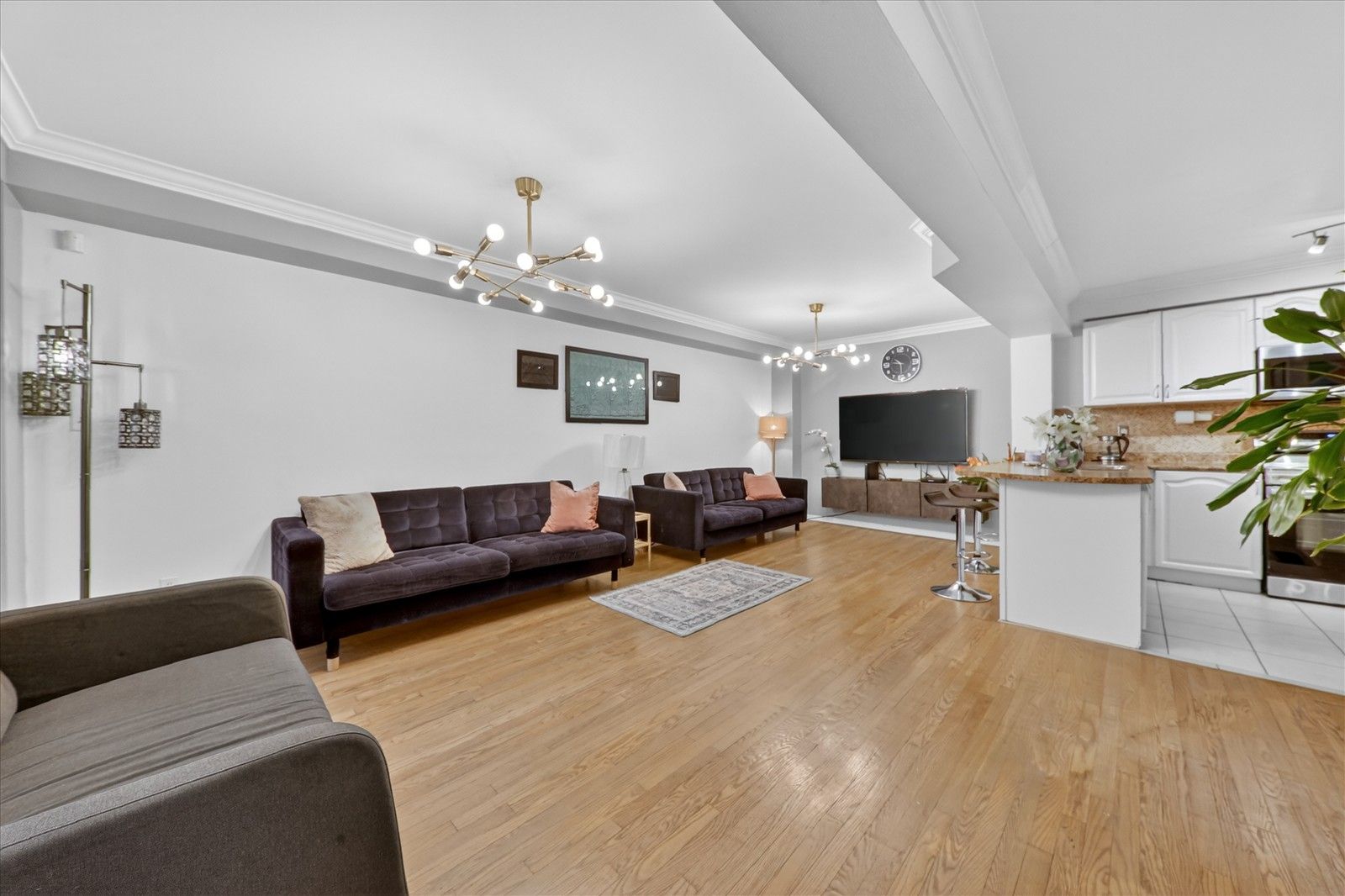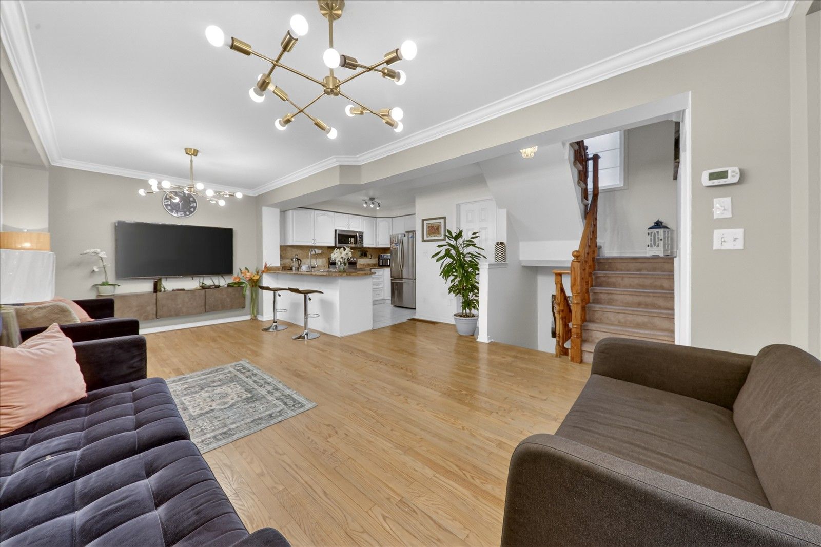 • Bright open-concept living space with hardwood and laminate flooring.