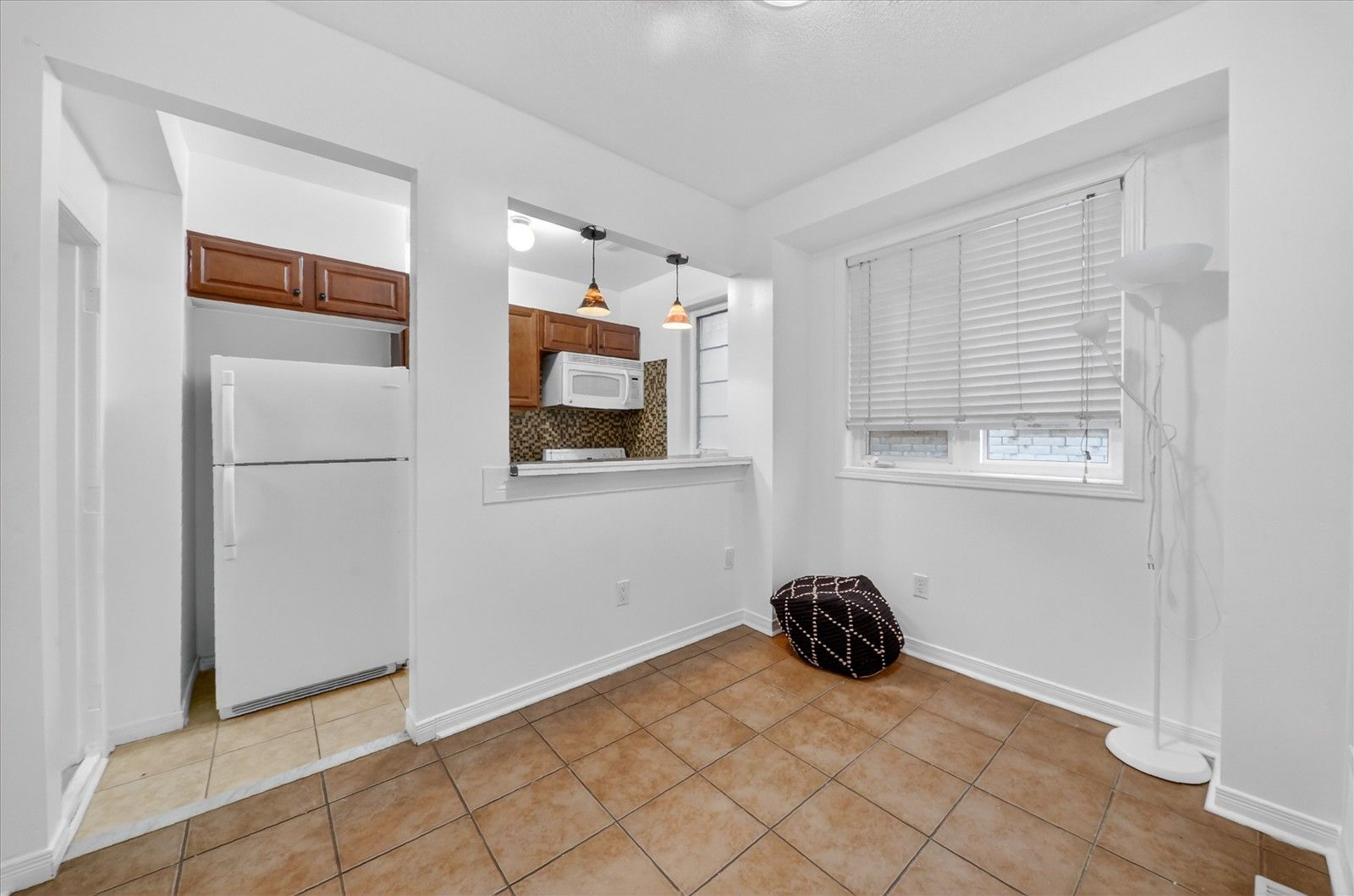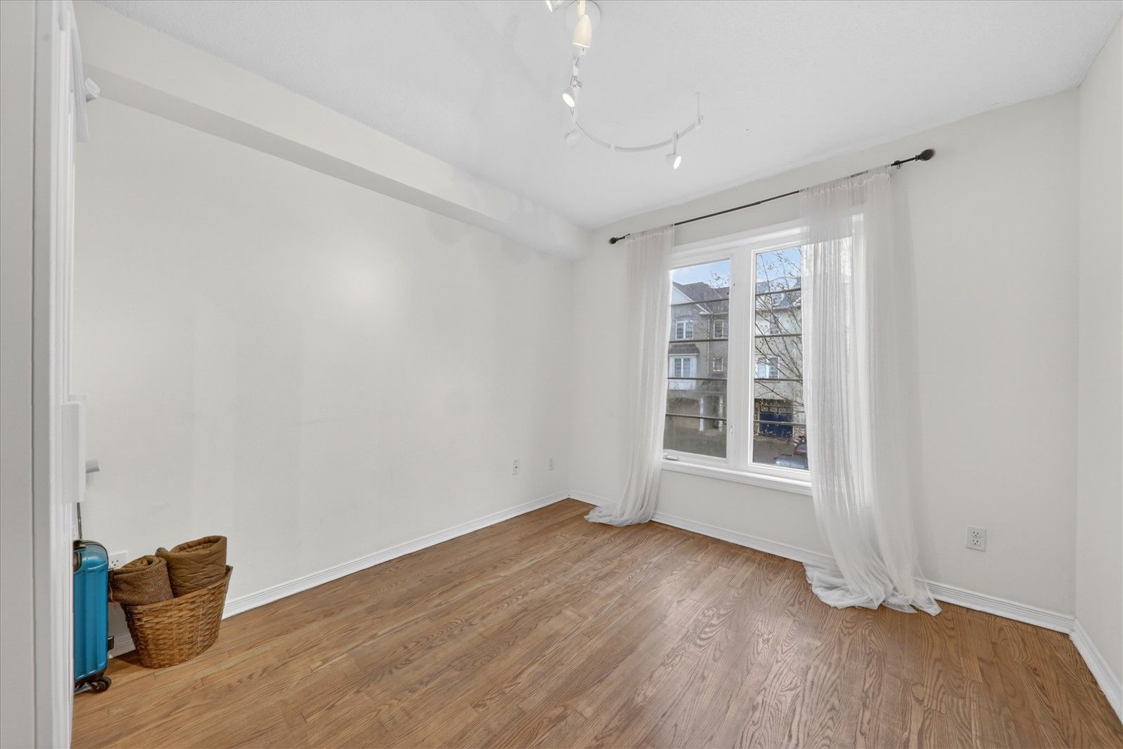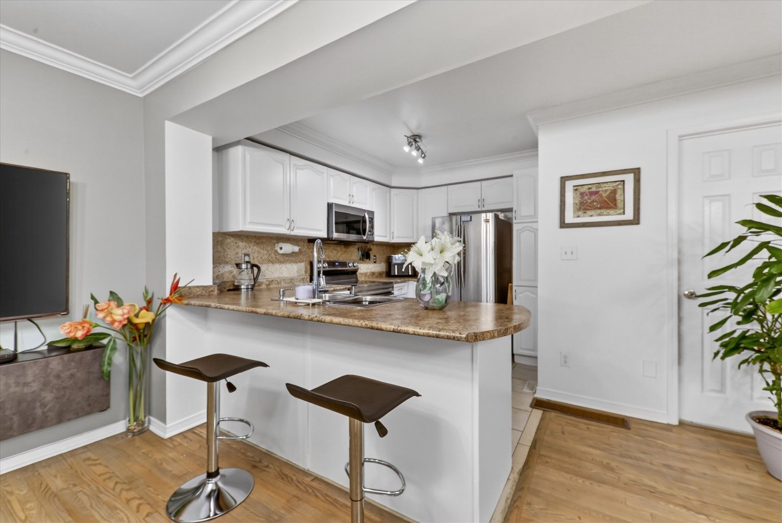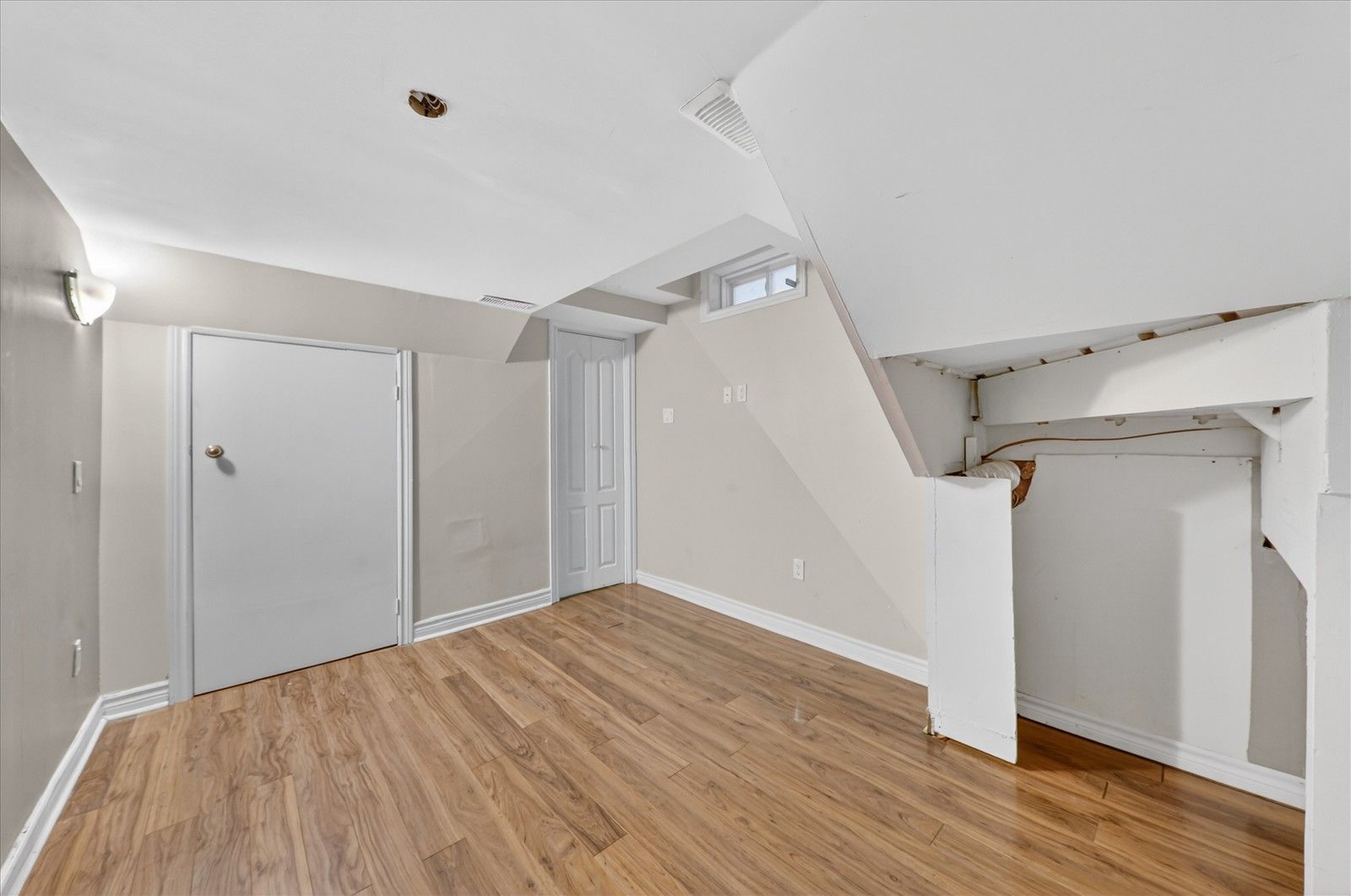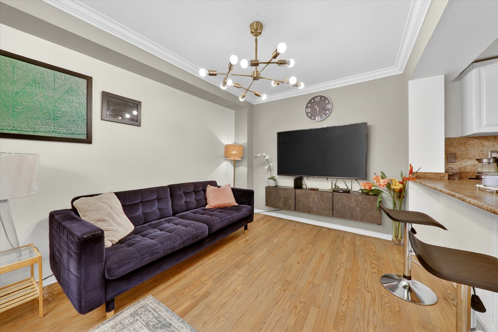 • Bright open-concept living space with hardwood and laminate flooring.