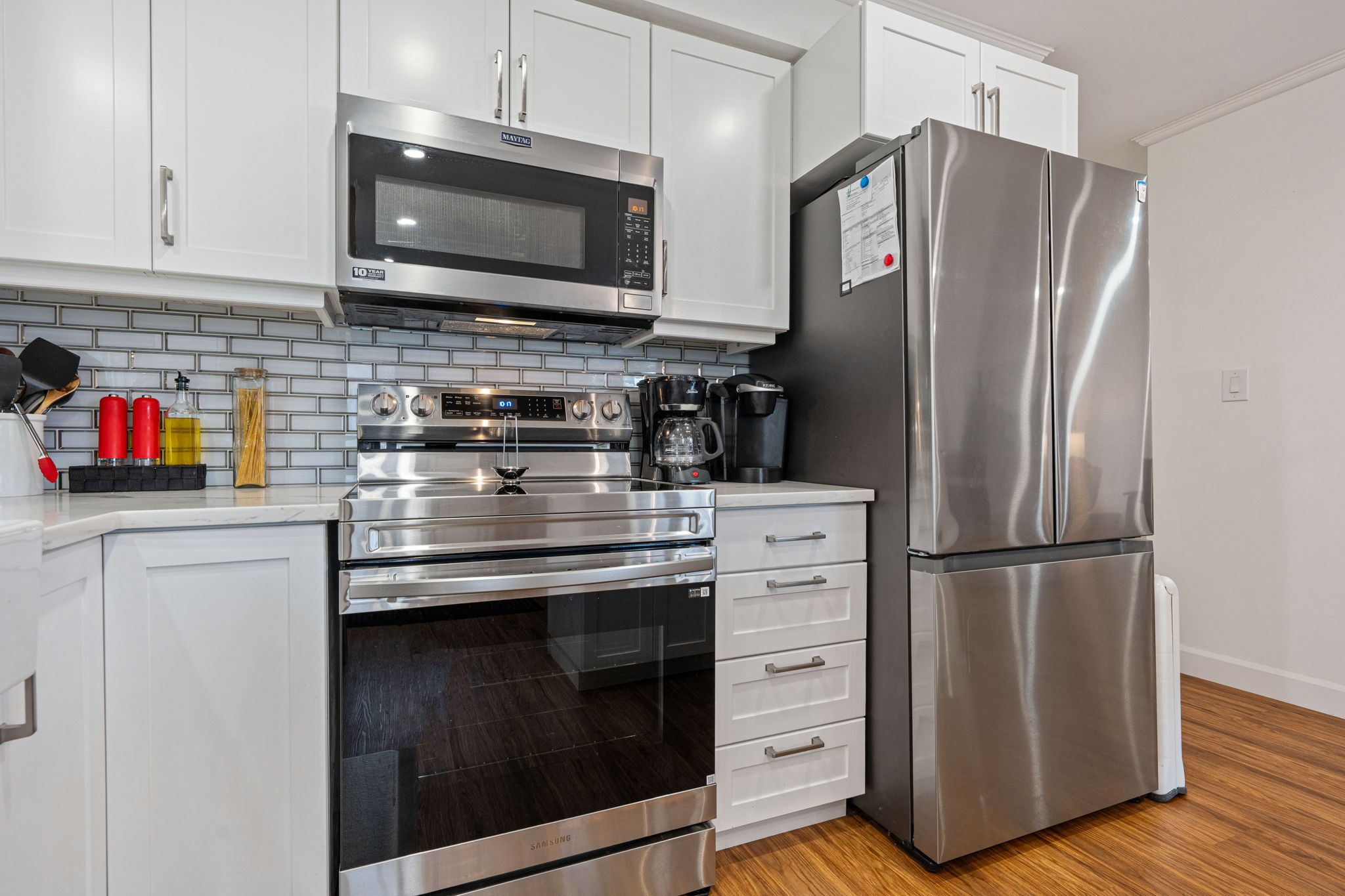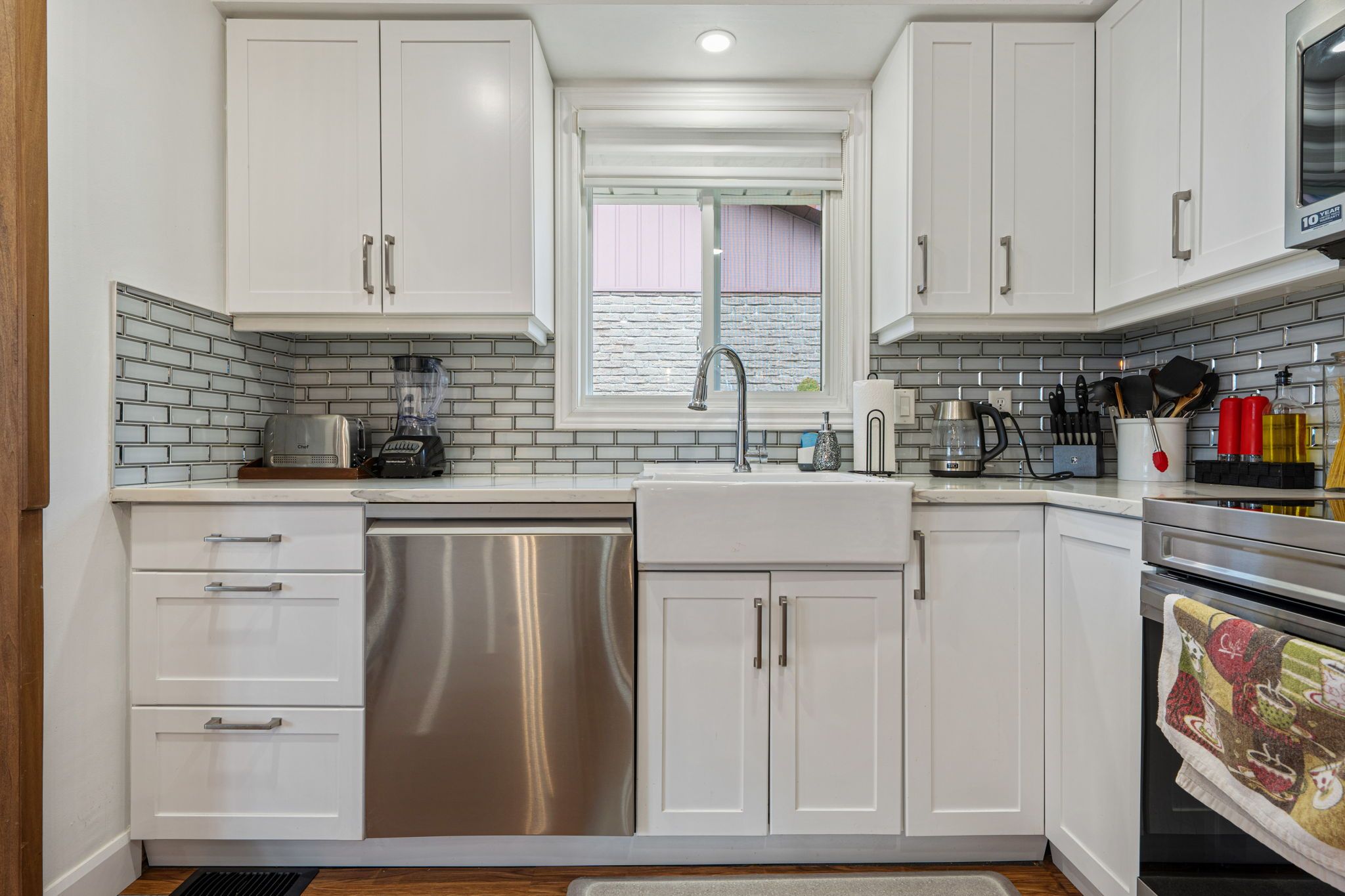 • Bright white kitchen featuring quartz countertops and newer appliances.