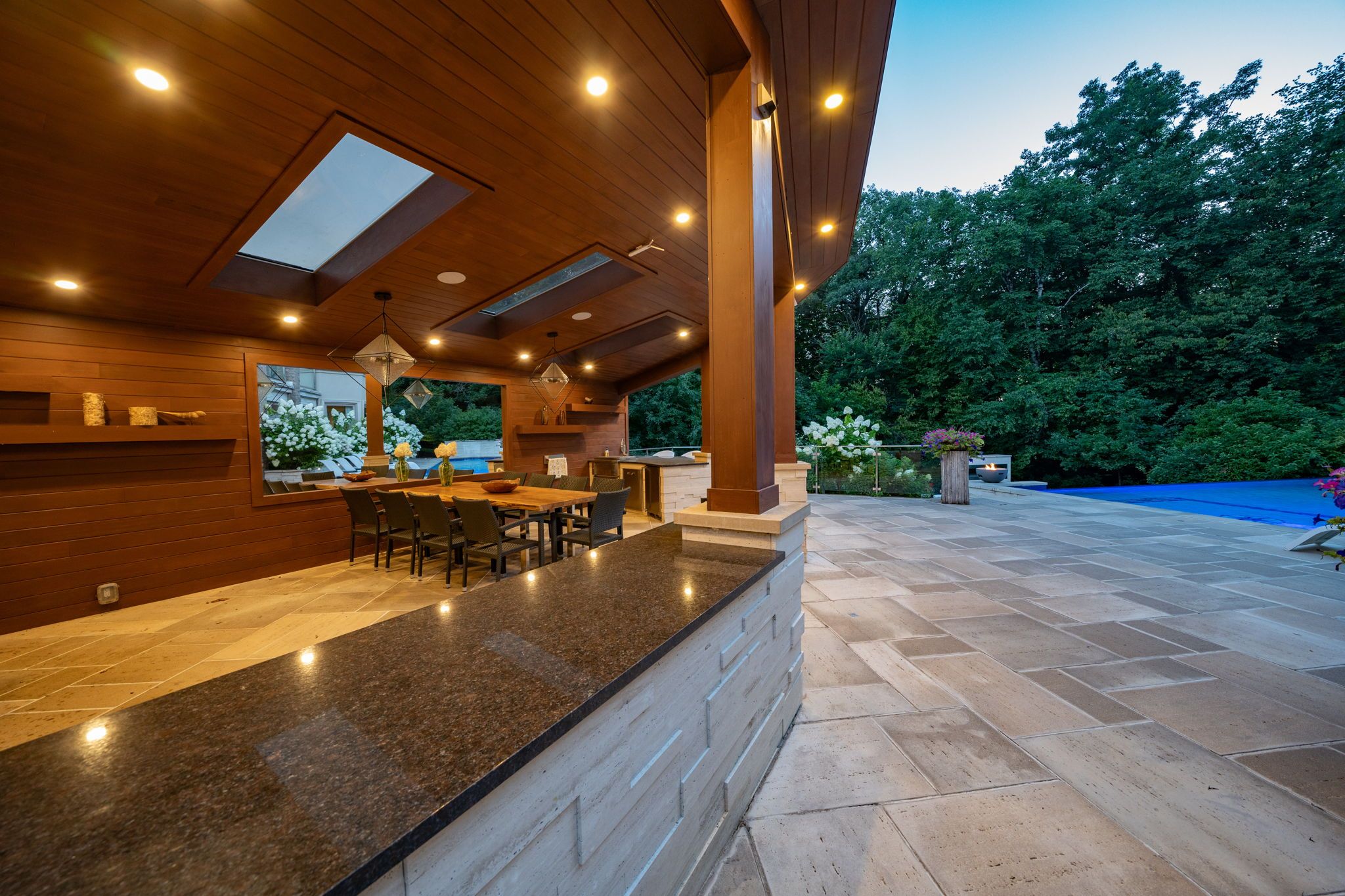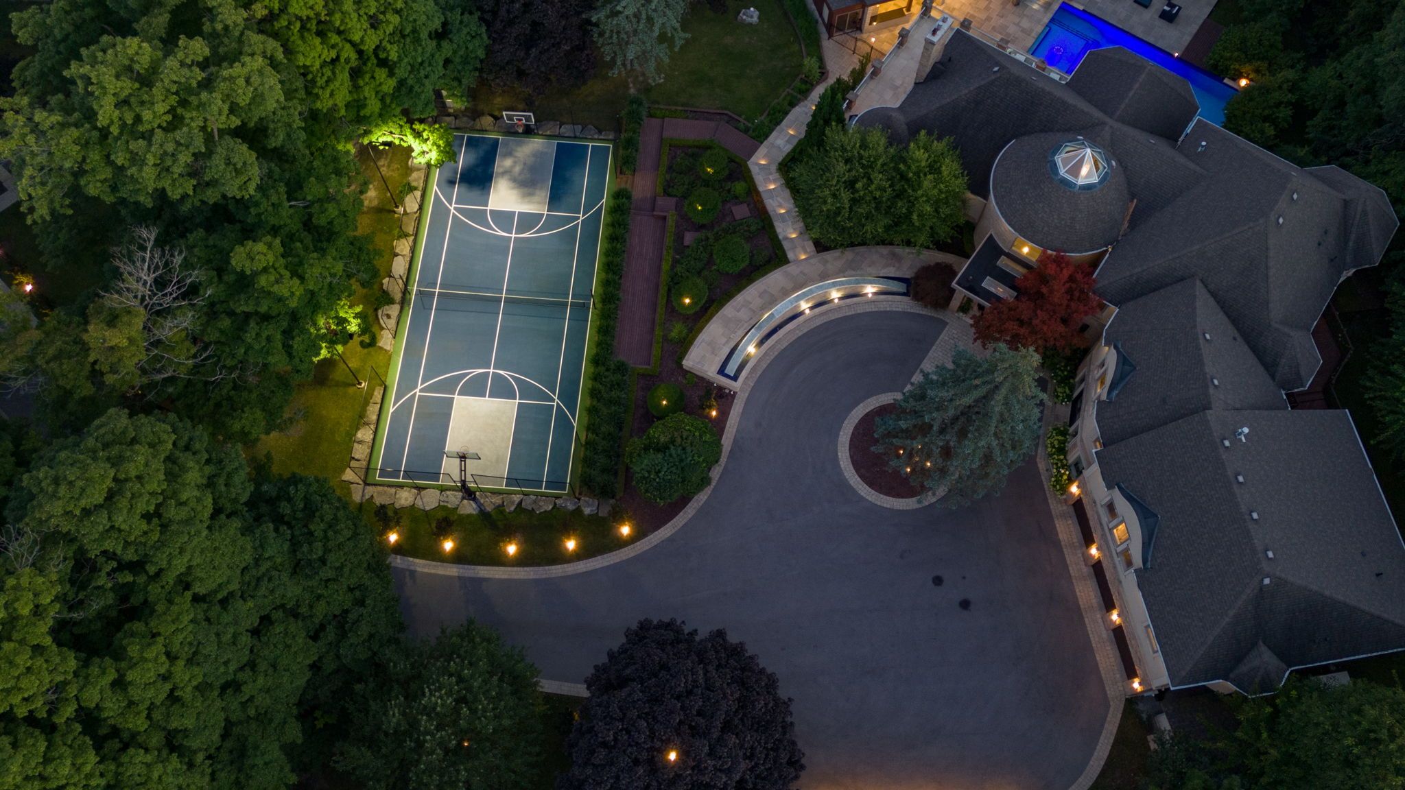 • Outdoor space featuring an infinity pool, sports court, and waterfalls.