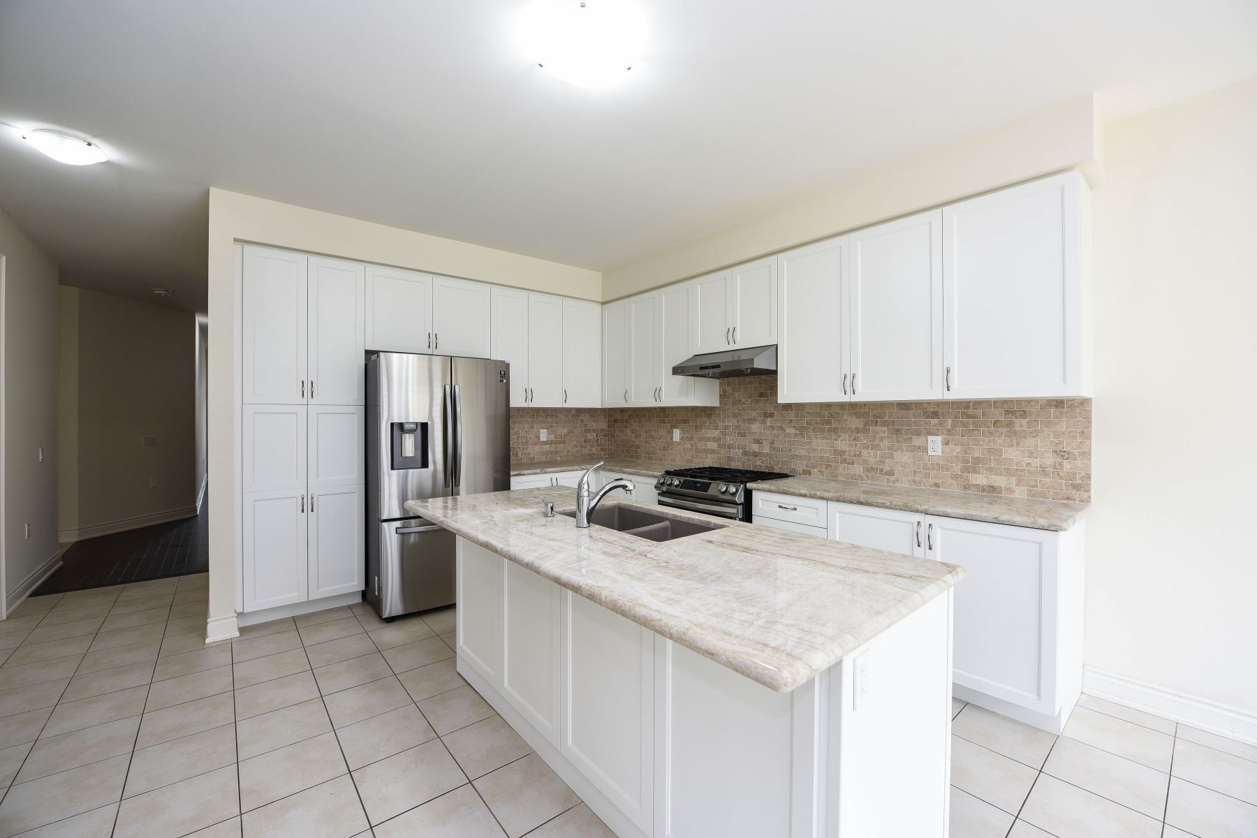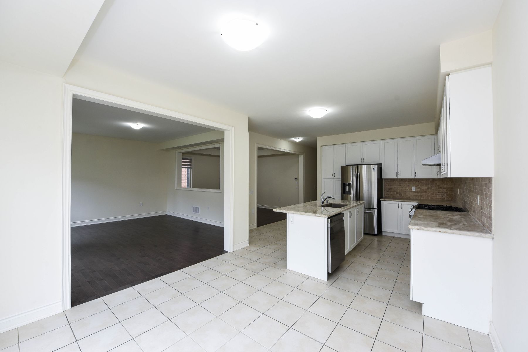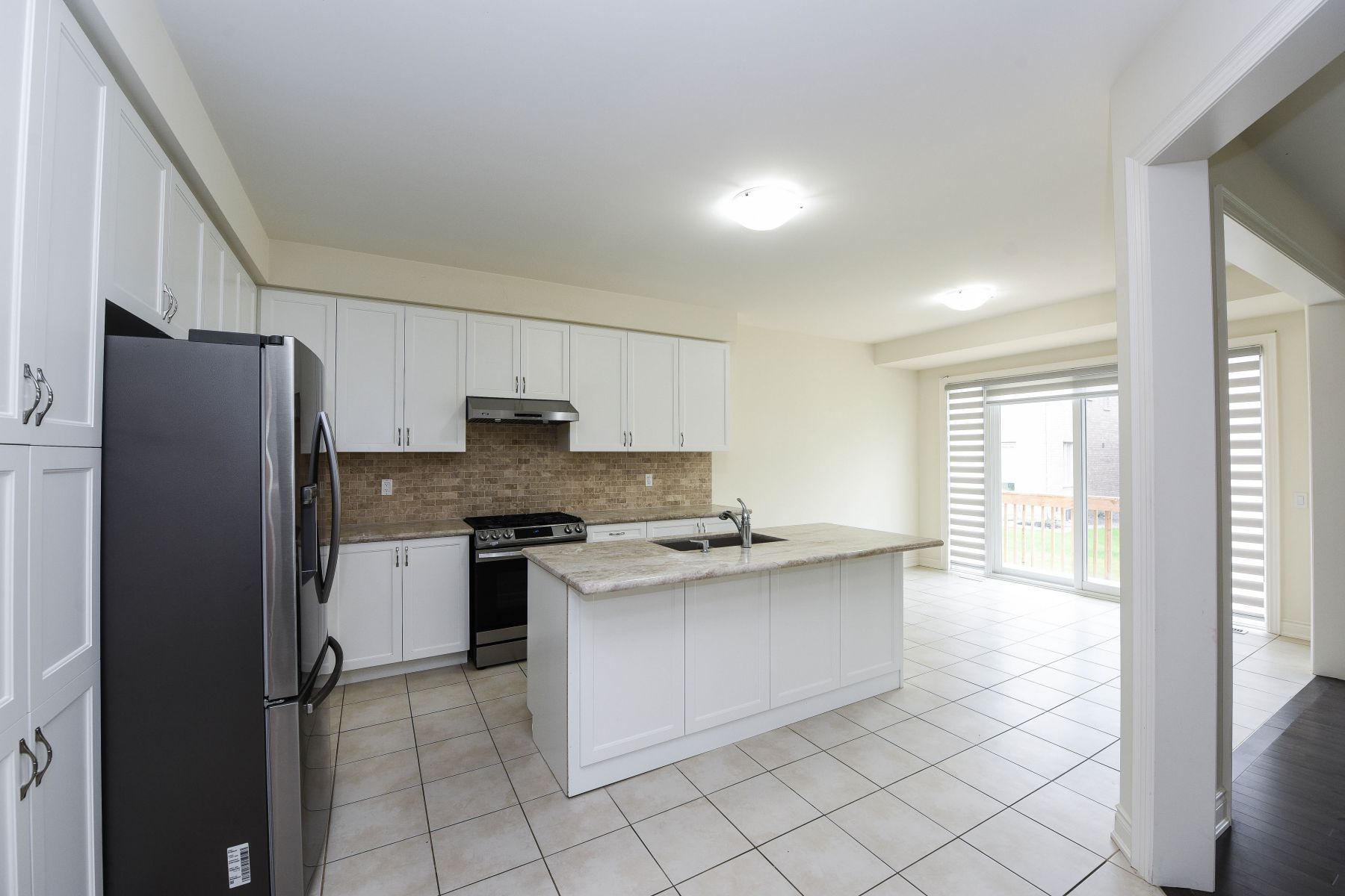 • Spacious kitchen with granite countertops and attractive backsplash.
