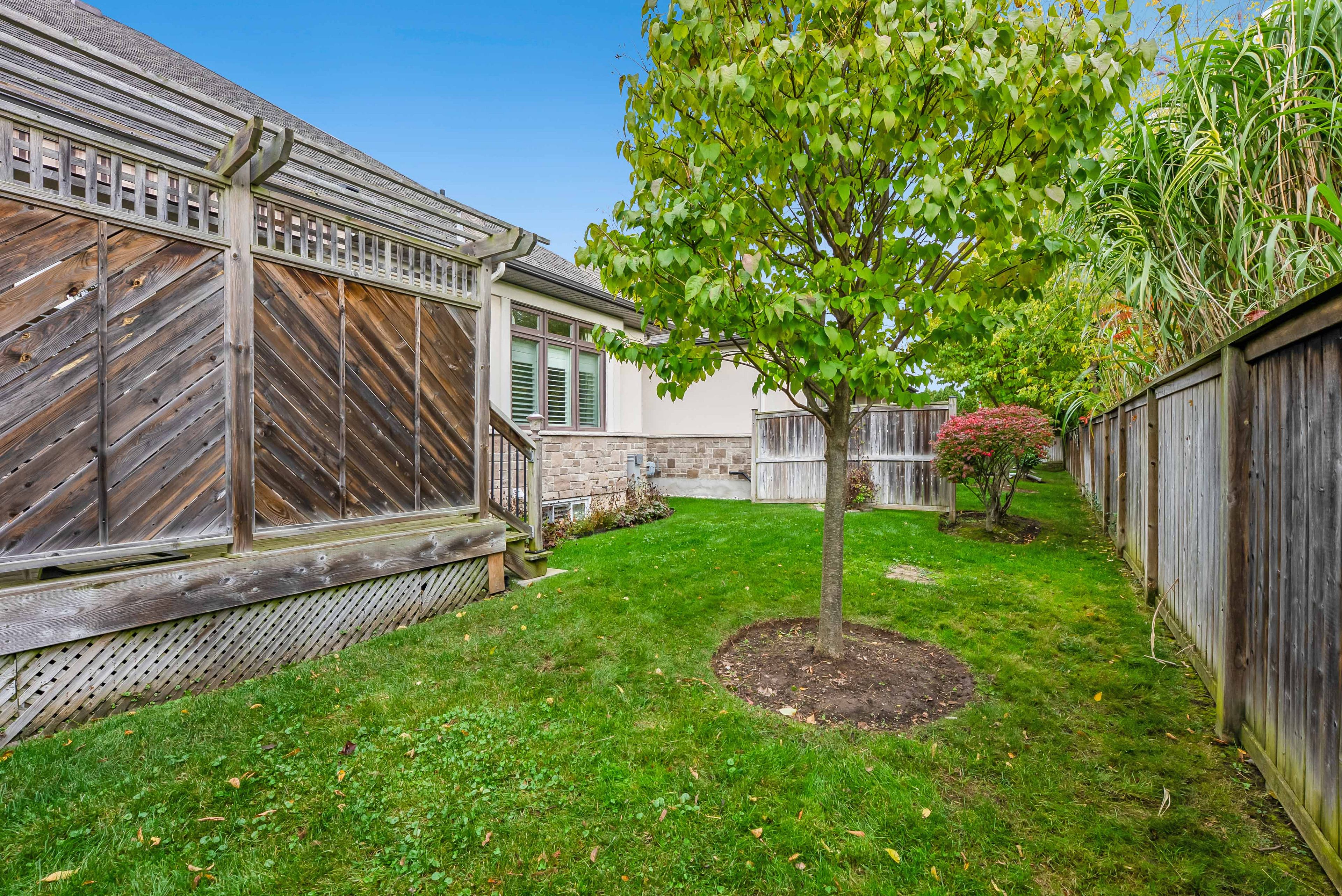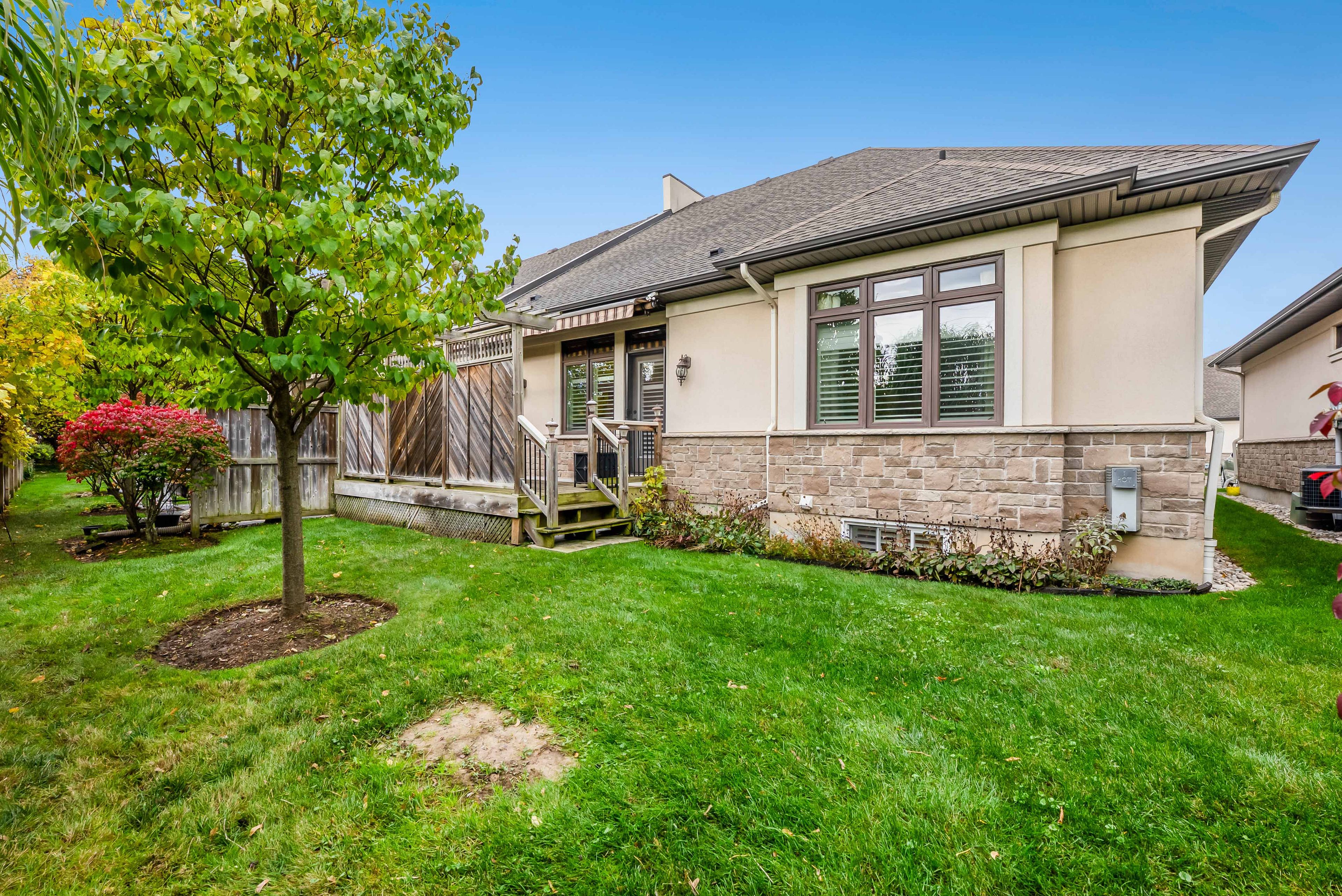 • Private deck overlooking green space, great for relaxation.