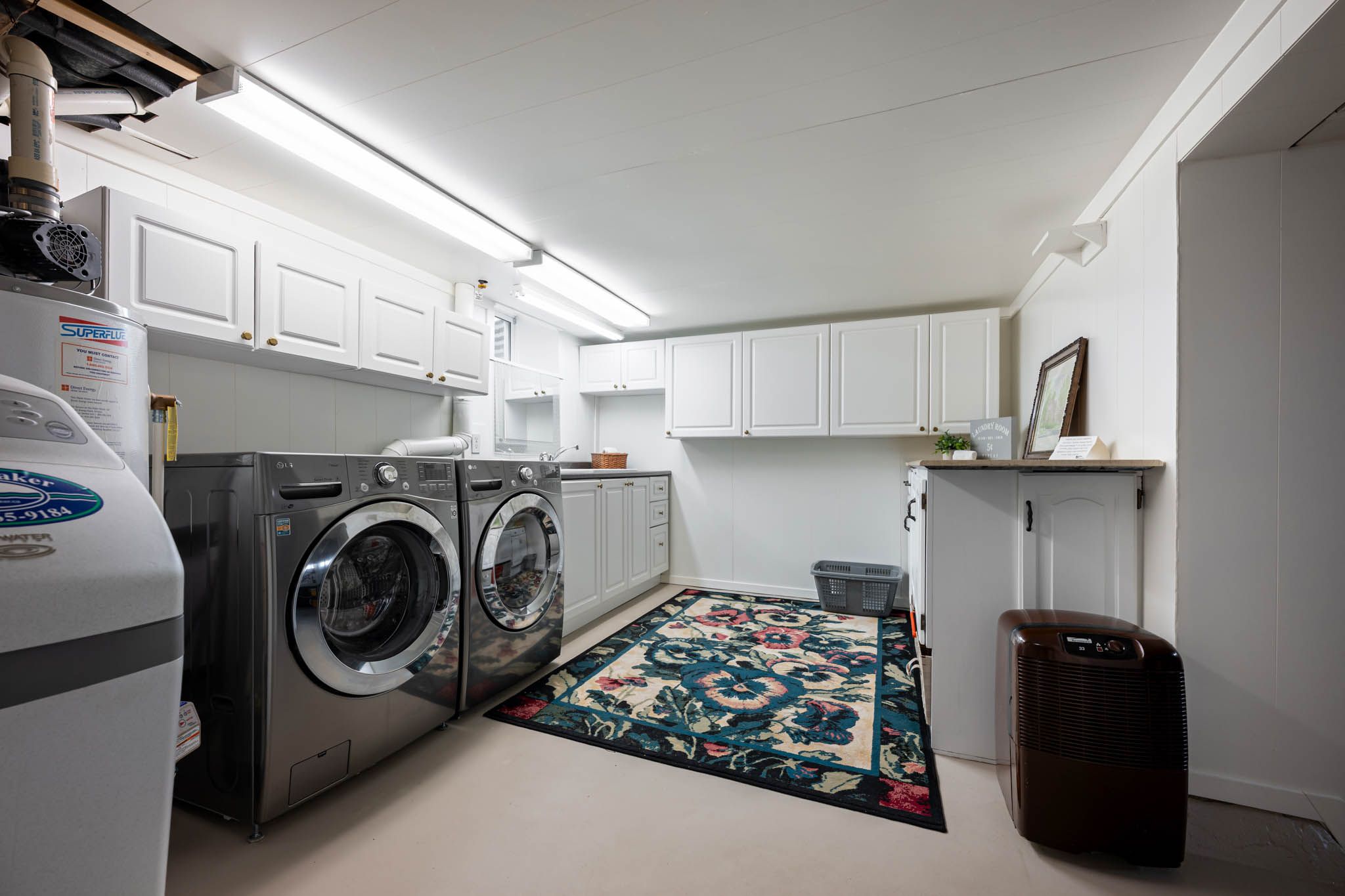 • Modern kitchen with quartz counters and covered back porch for outdoor dining.