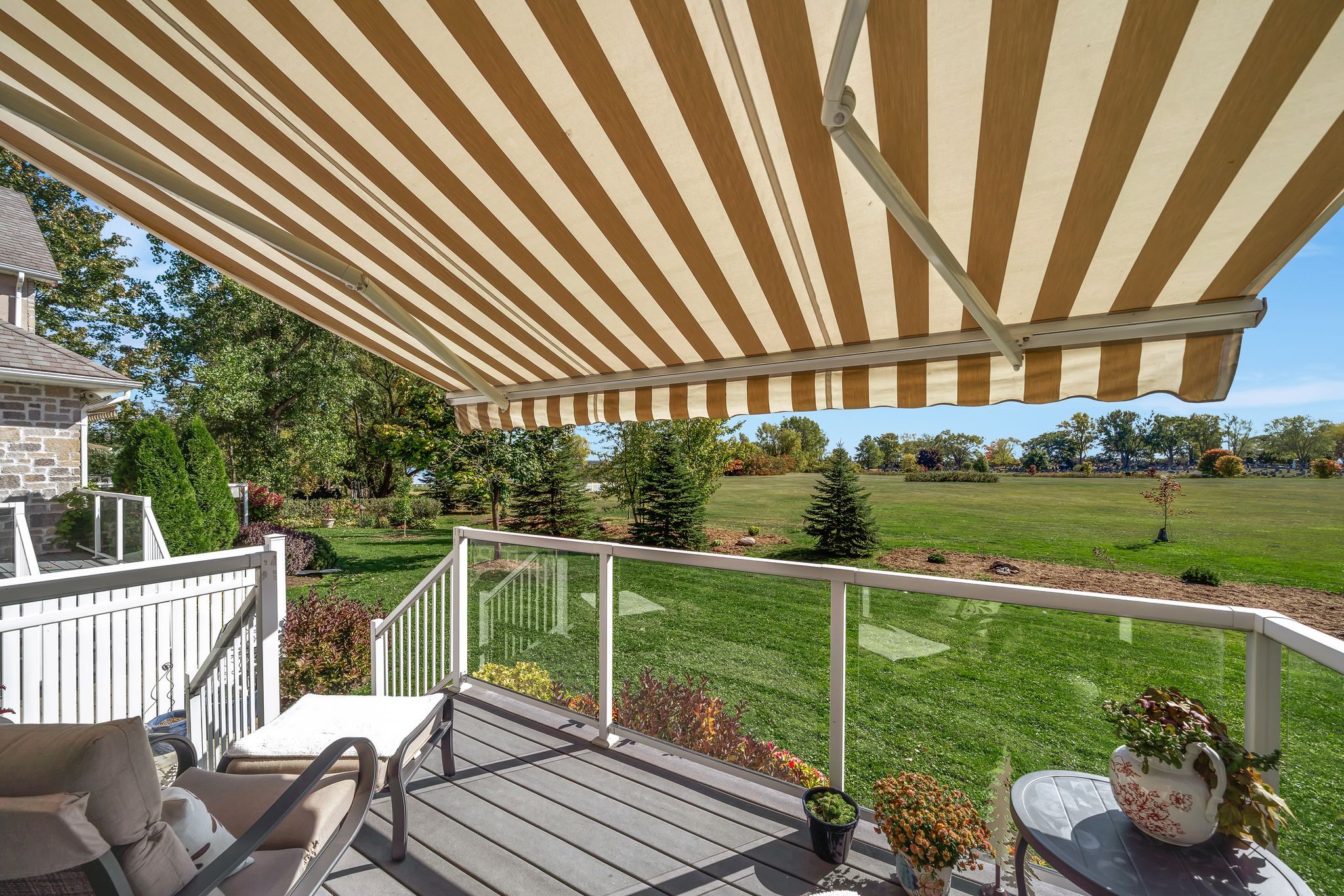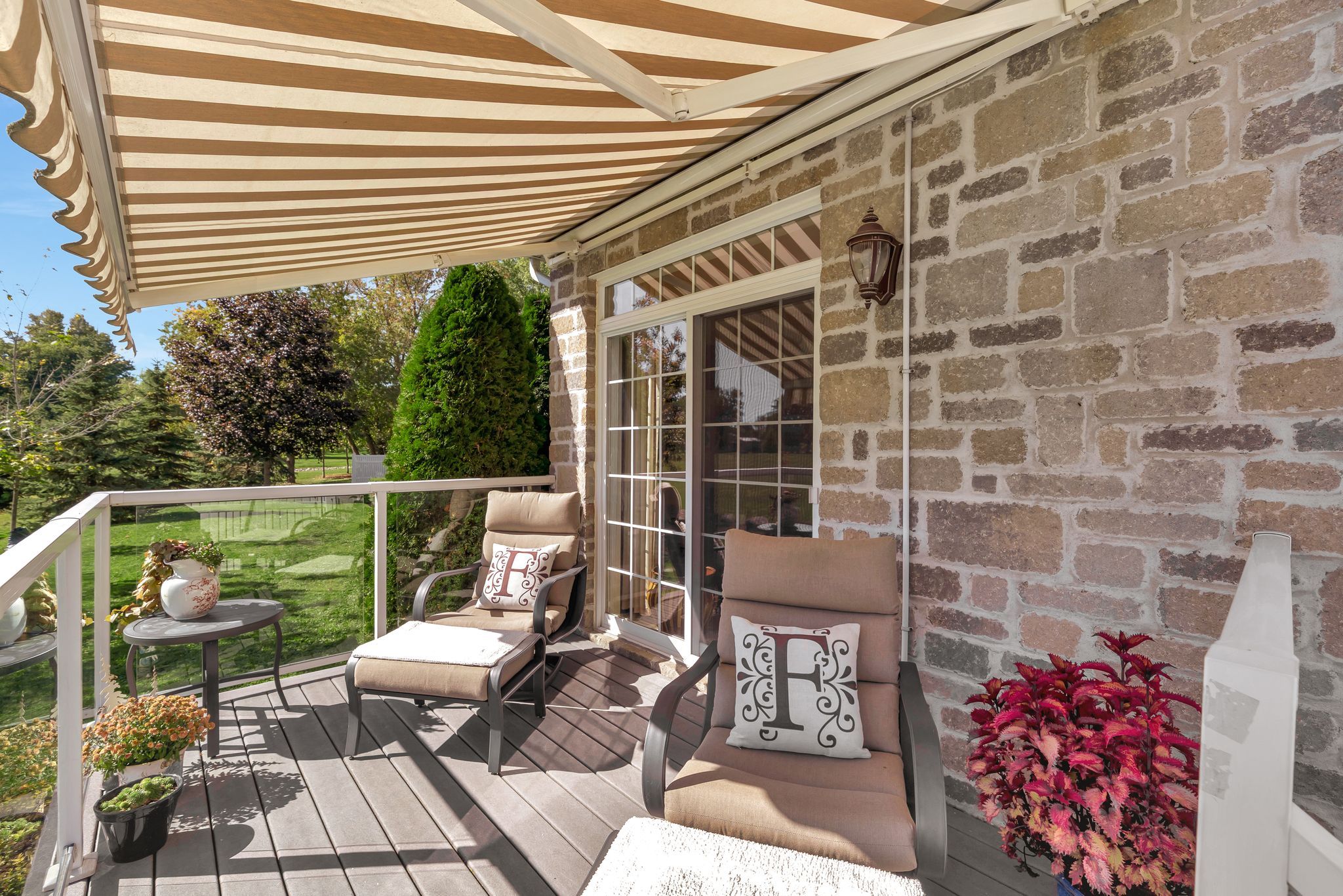 • Private deck overlooking lush green space for relaxing outdoors.