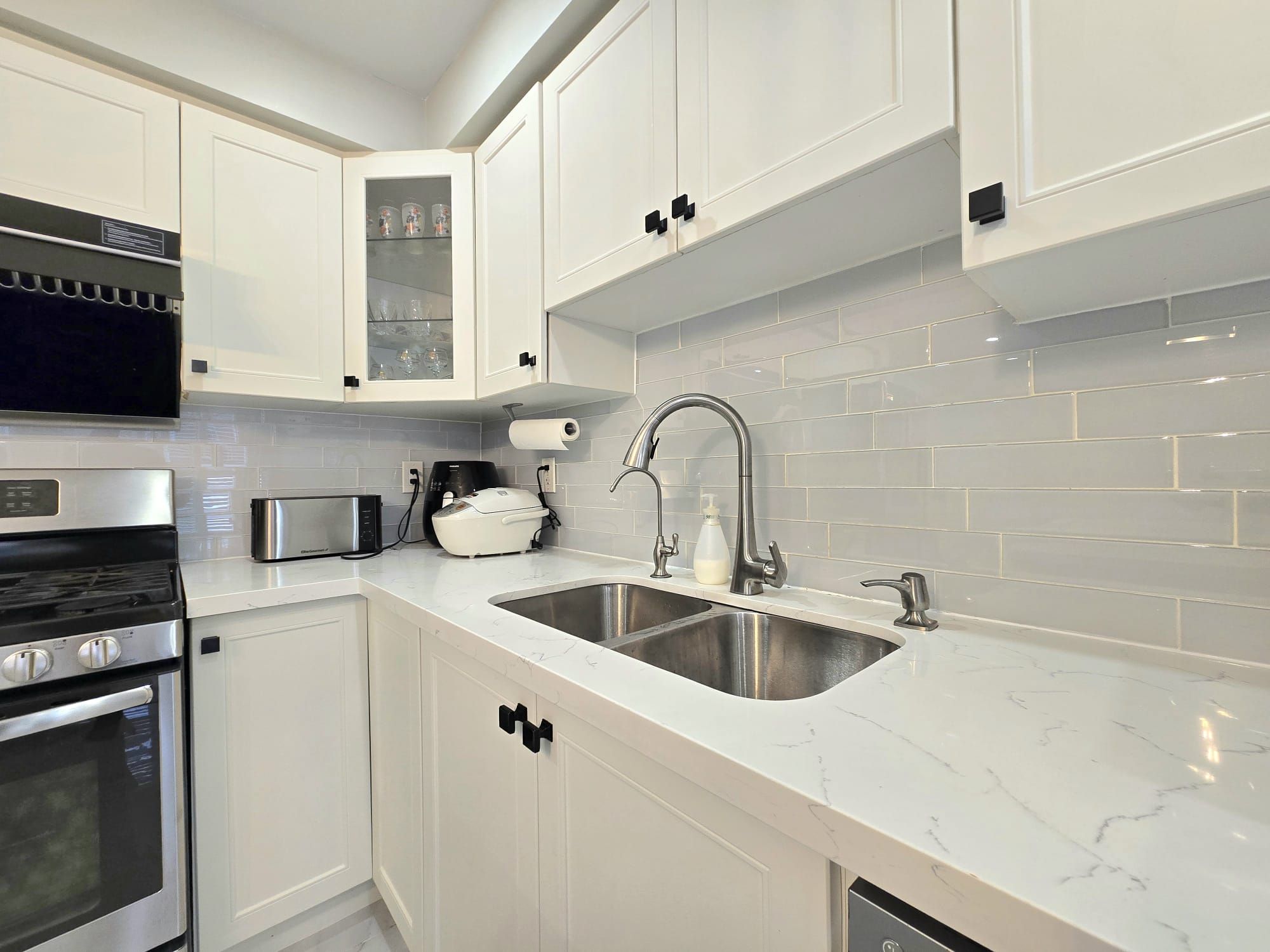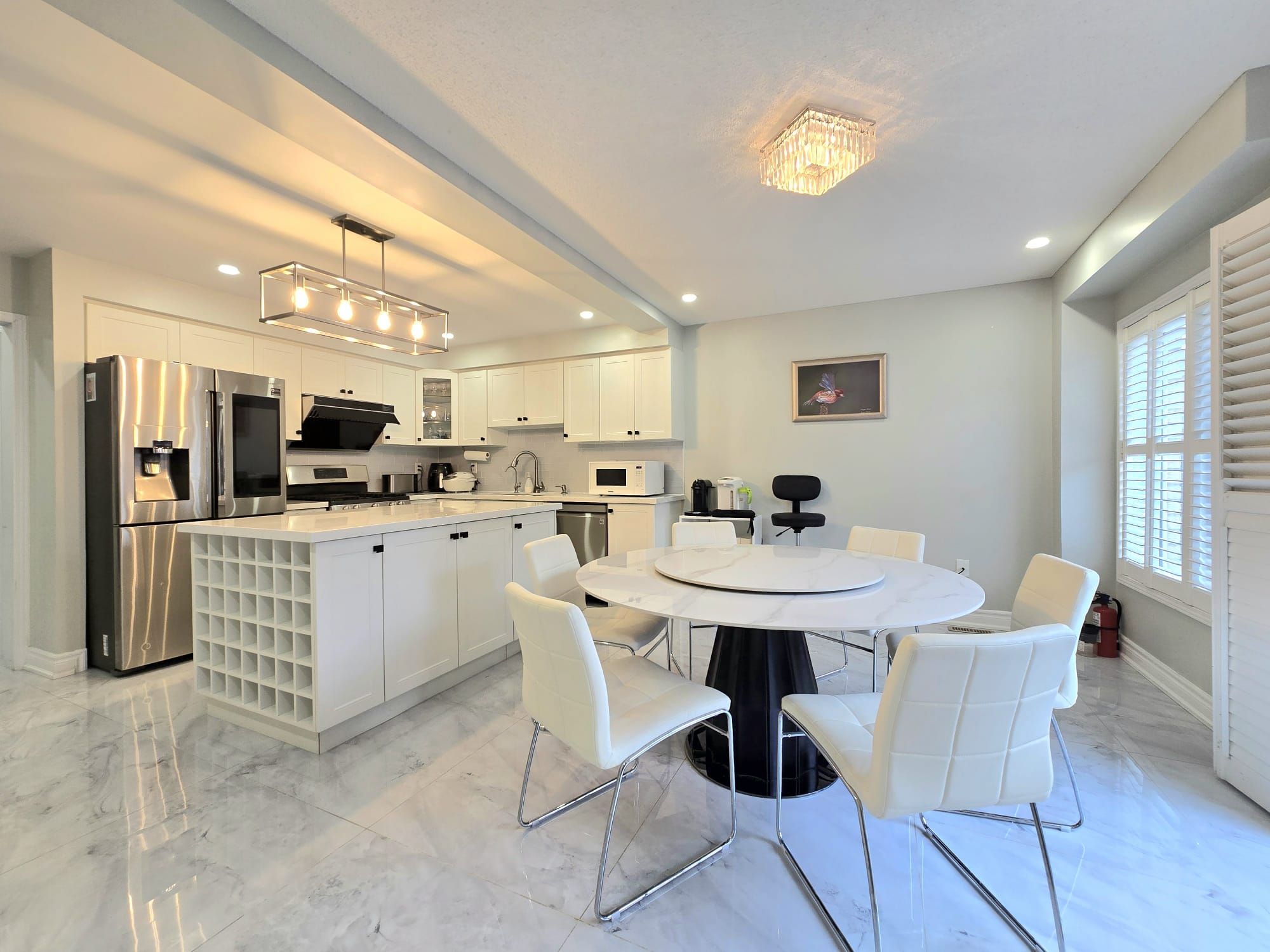 • Modern kitchen features stainless steel appliances and a center island.