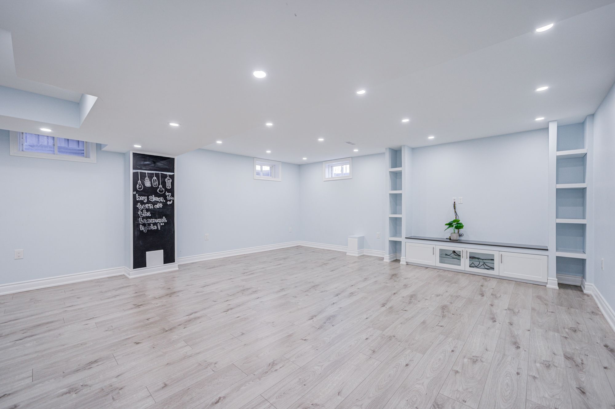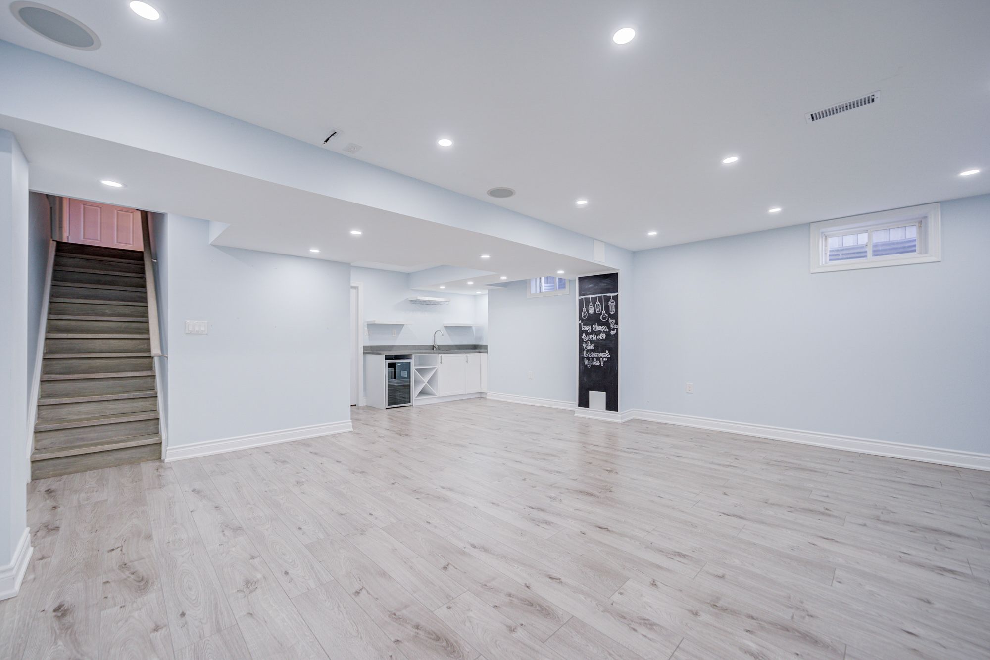 • Finished basement includes smart lighting and a wet bar for entertainment.