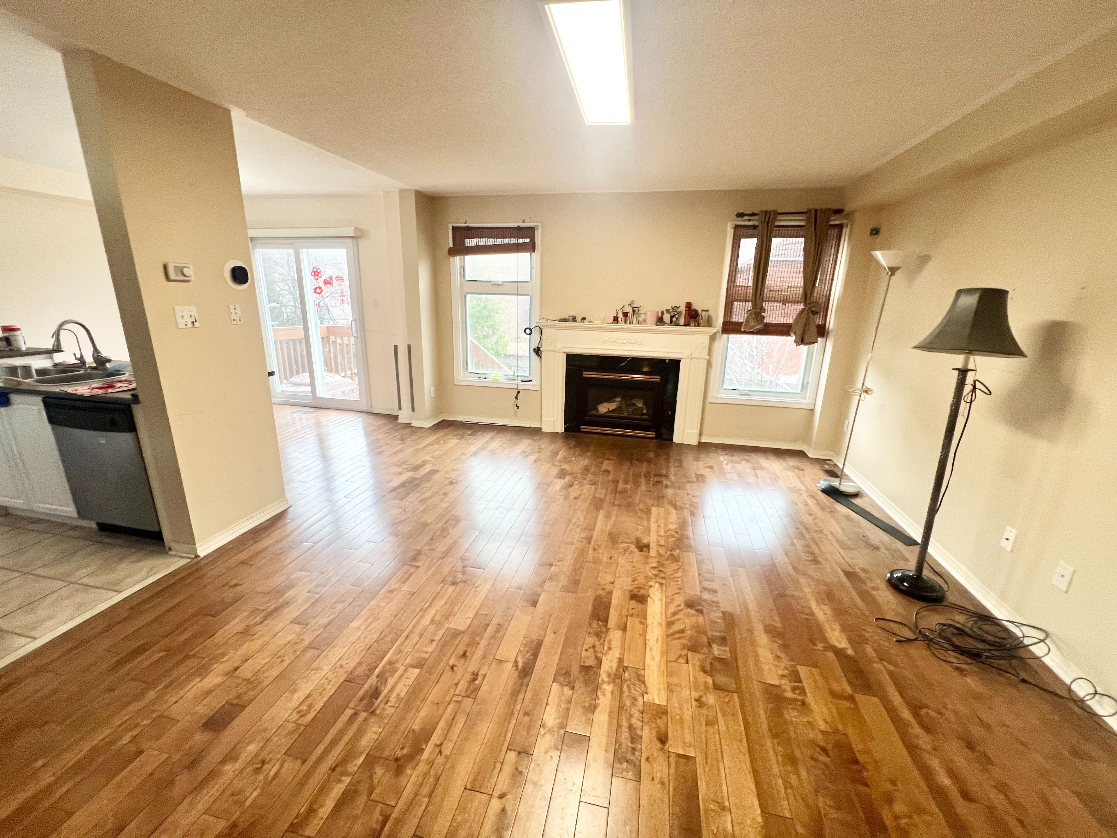 • Open concept design with hardwood flooring and gas fireplace.