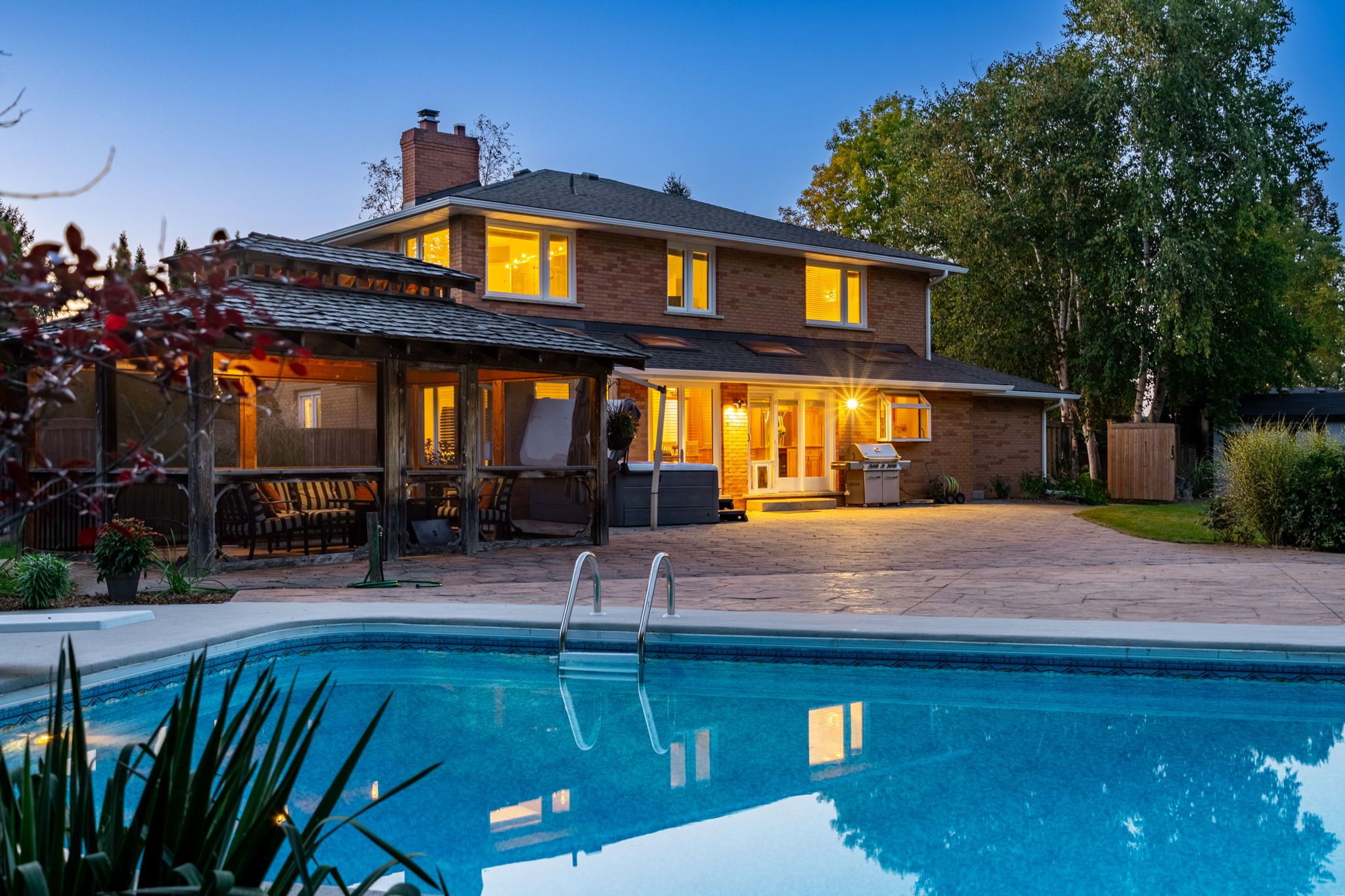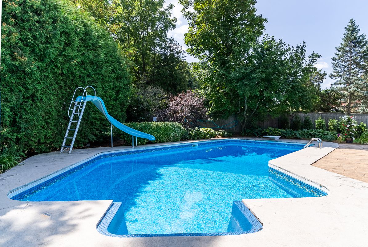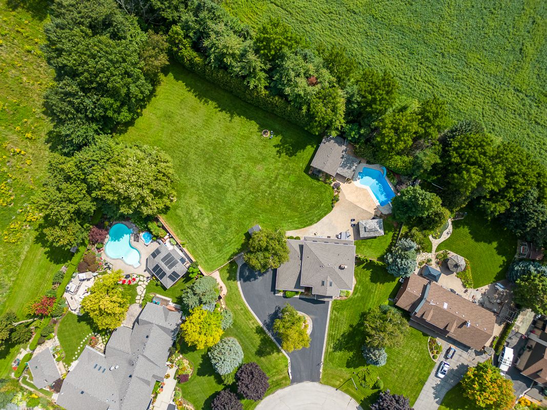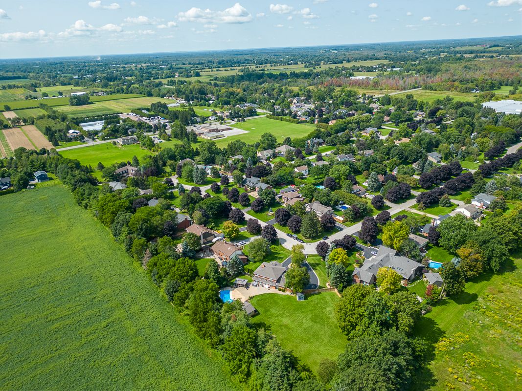 Situated on a quiet, beautifully manicured 0. 99-acre lot in one of the most exclusive enclaves in the area, this impressive two-storey brick estate immediately captures attention with its elegant curb appeal, circular driveway, and landscaped centrepiece. This home has it all, offering four bedrooms, four bathrooms and over 4000 square feet of living space. No rear neighbours, an inground pool, hot tub, workshop & gazebo with a natural gas fireplace outside. The backyard is flat, unobstructed and surrounded by trees. Plenty of useable space for entertaining, family games/events and a huge ice rink. Breathtaking foyer illuminated by cascades of natural light and a stunning centre staircase. Exquisite brazilian hardwood flooring flows seamlessly through the formal dining and entertainment spaces, where a natural gas fireplace adds a warm, ambiance ideal for both grand entertaining and intimate gatherings. The custom kitchen is a masterpiece of craftsmanship, featuring cherry maple oak soft-close cabinetry, under-cabinet lighting, heated floors, granite countertops, skylights, and a toe-kick central vacuum for effortless living. The step-down living room features large windows overlooking the private back yard, pot lights through-out and gleaming hardwood floors. The expansive primary suite impresses with two walk-in closets, custom built-in wall-to wall cabinetry, and an elegant ensuite featuring dual vanities and a walk-in shower. The fully finished basement features a spacious recreation room, a bathroom, a private office, an oversized storage room, and a separate walk-up staircase leading directly to the garage. Nestled in a prime location just five minutes from waterdown, this location offers unrivaled access to excellent schools, parks, trails, golf courses, and fitness centers, a rare setting where every lifestyle amenity is within easy reach, yet the surroundings remain serene and exclusive.