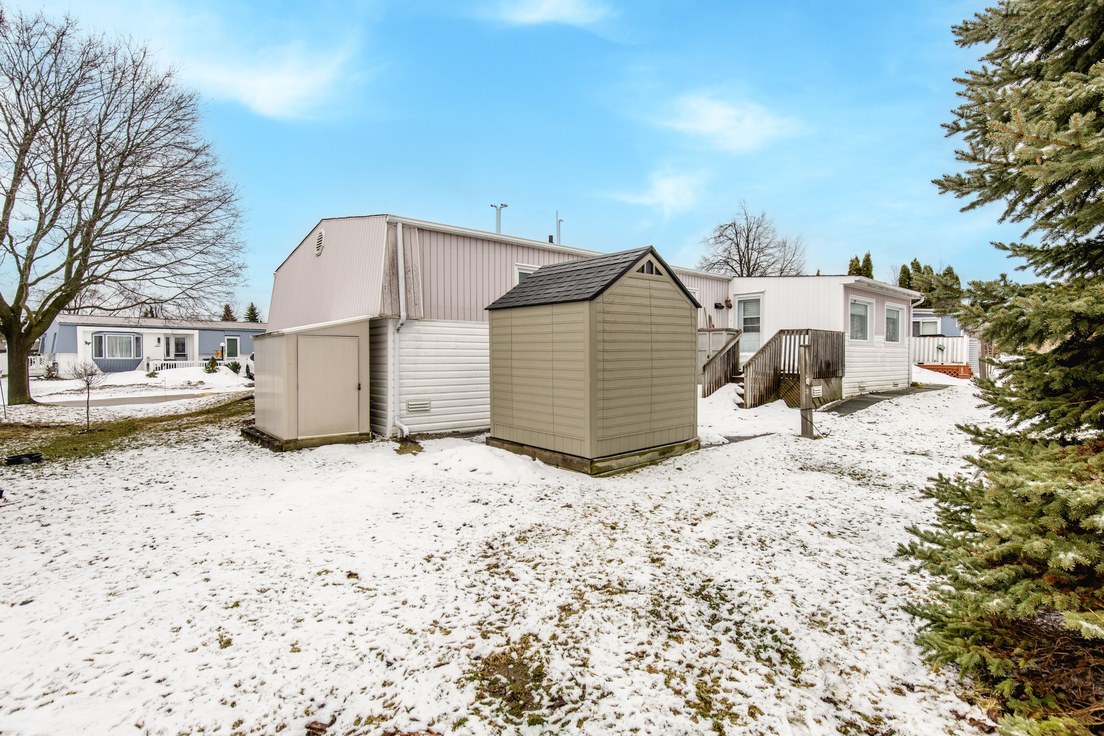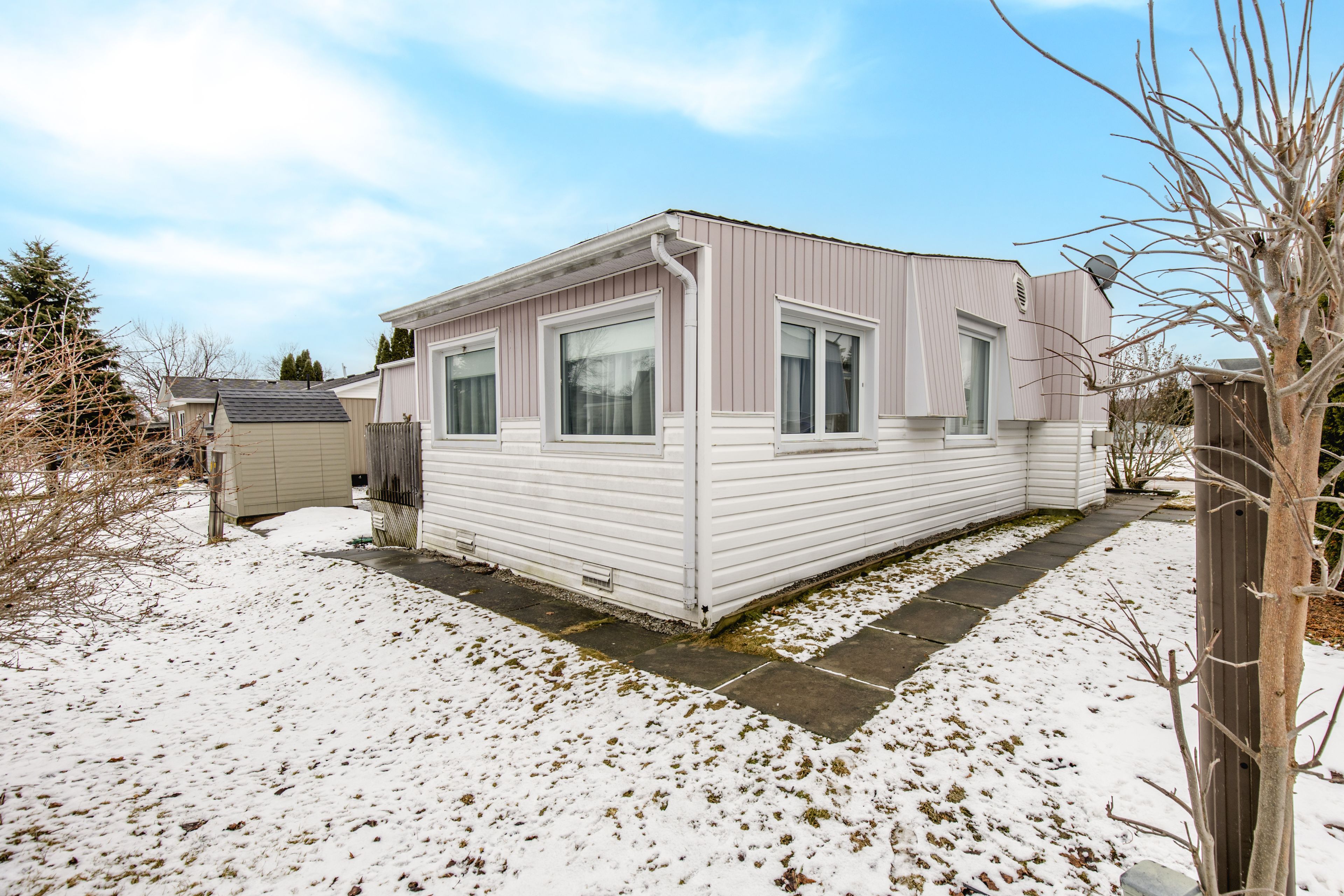 Monaco model i offering 2 bedrooms, with the primary bedroom offering a 3-piece ensuite. The main bathroom features an accessible shower for added convenience. Enjoy a covered front deck complete with a shade screen. Inside, you'll find hardwood flooring, a formal dining room, and a large kitchen with ample cabinetry. The bright family room offers a walkout to the deck and patio. Additional features include three storage sheds, shingles replaced in 2009, and a furnace and central air system updated in 2014.