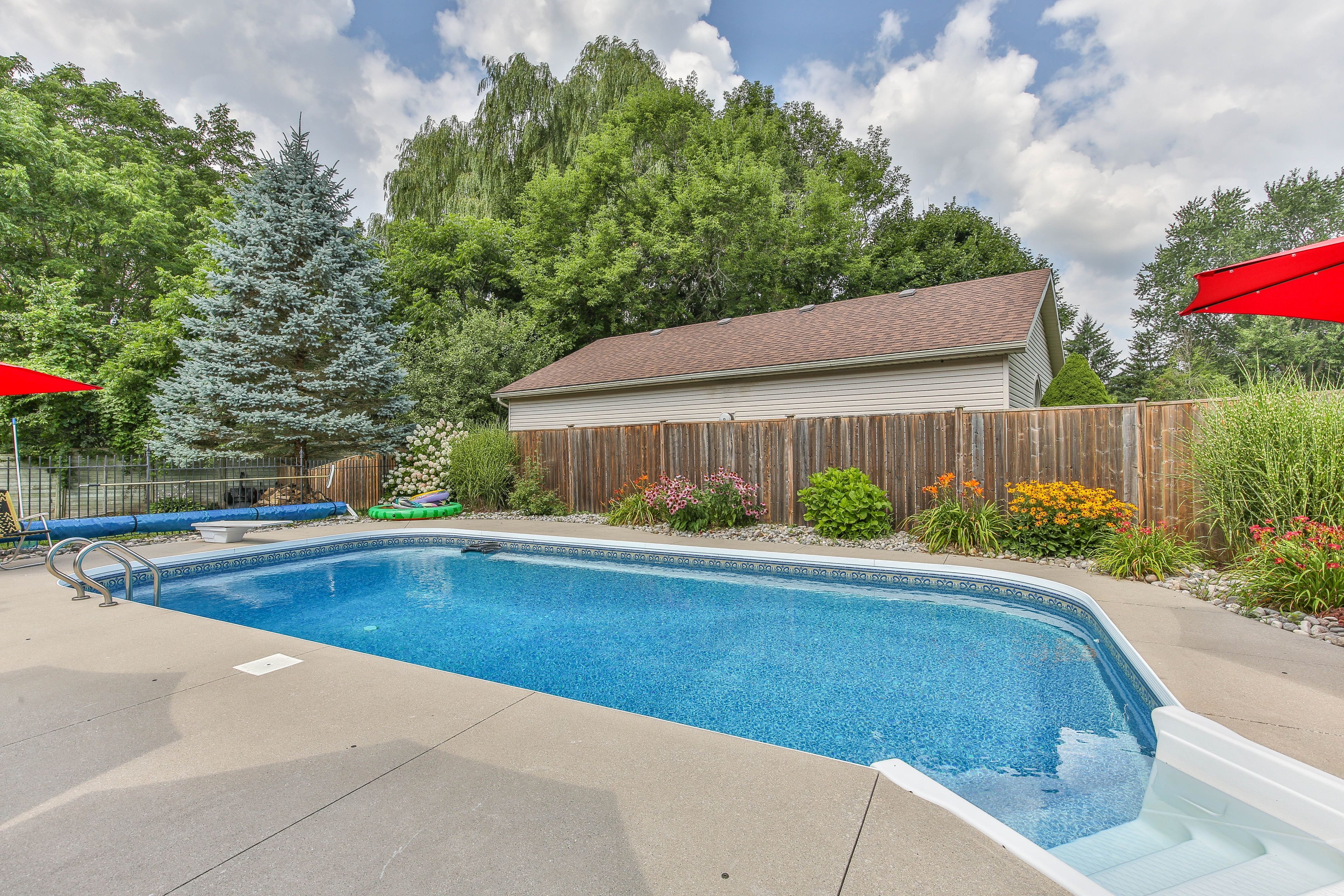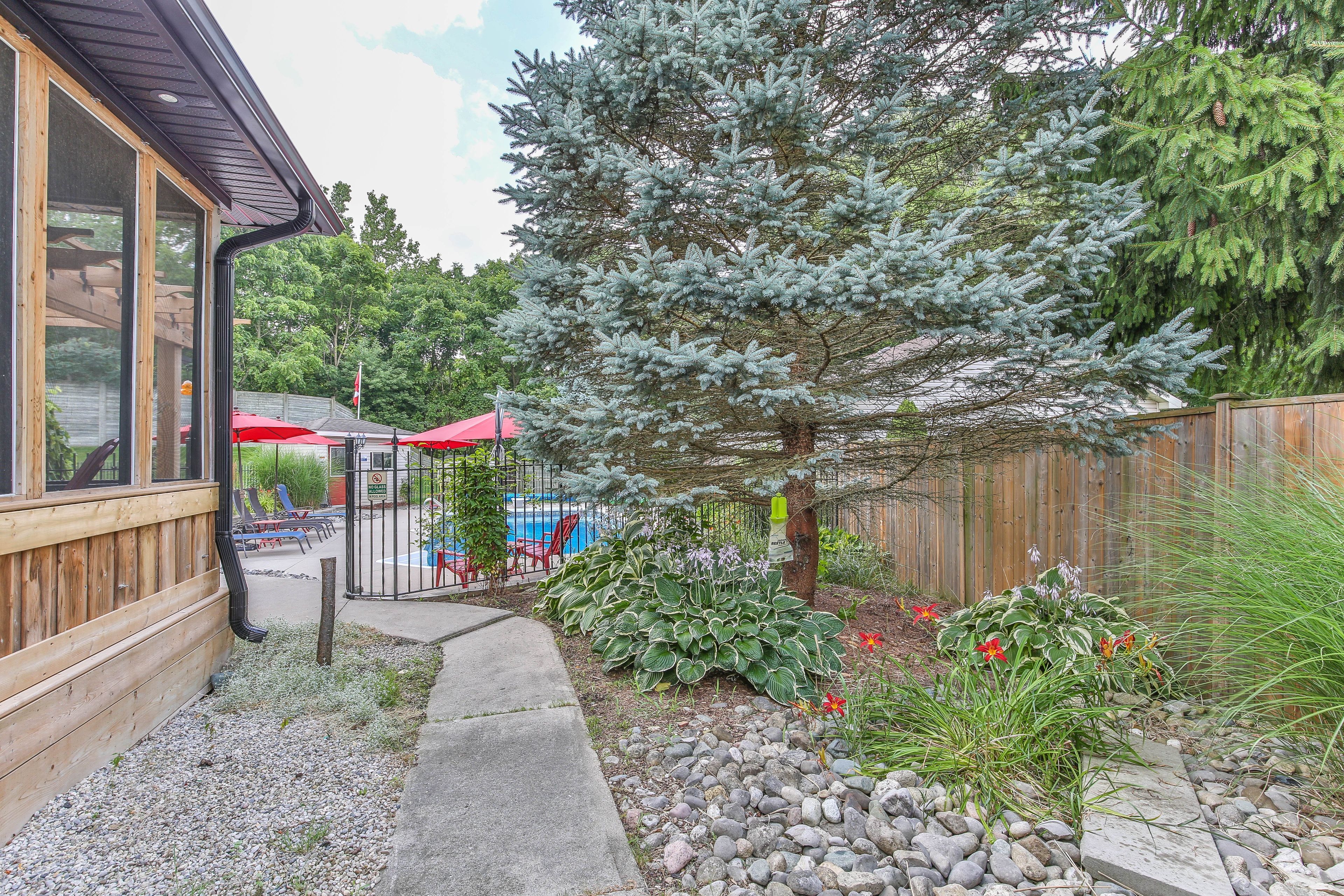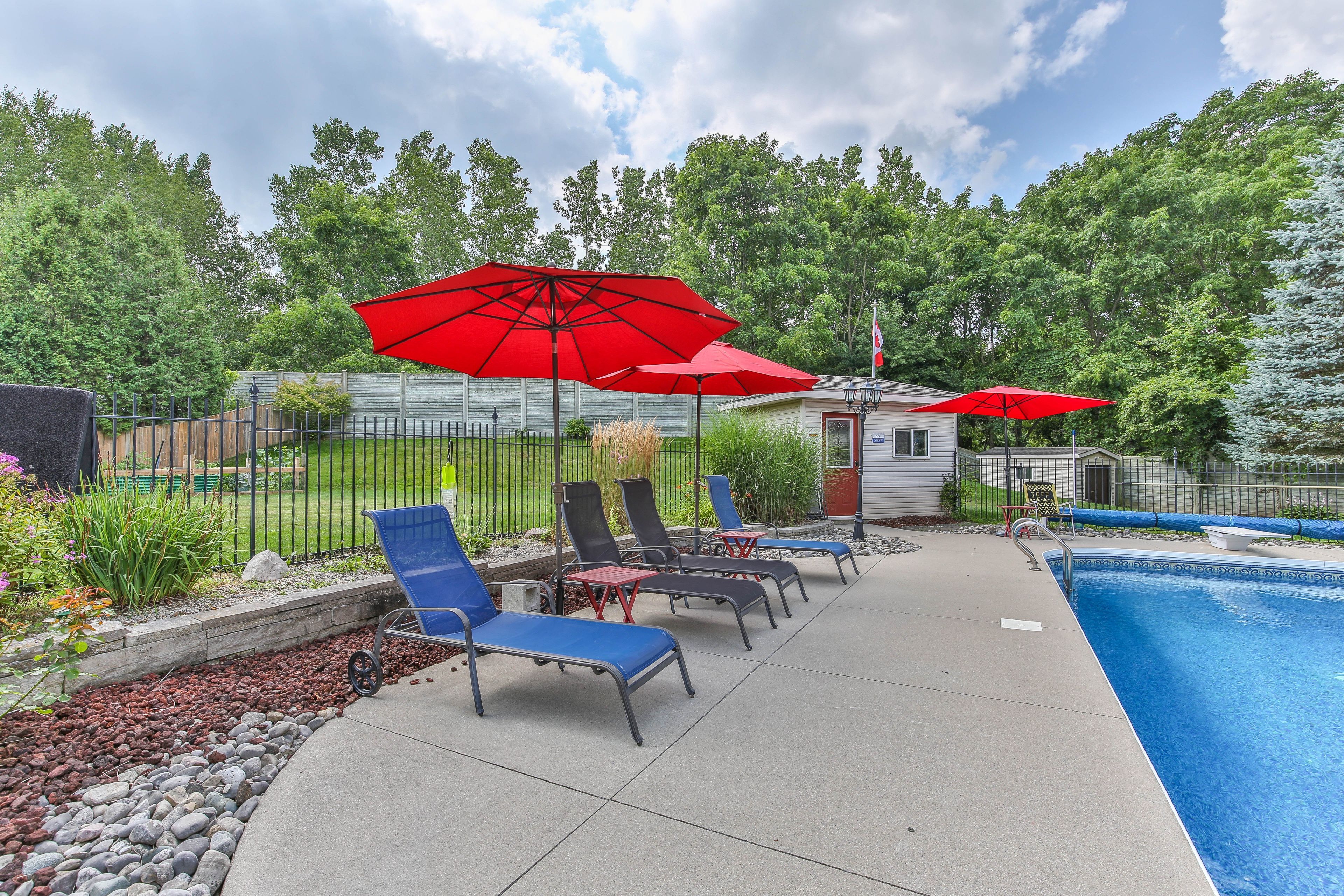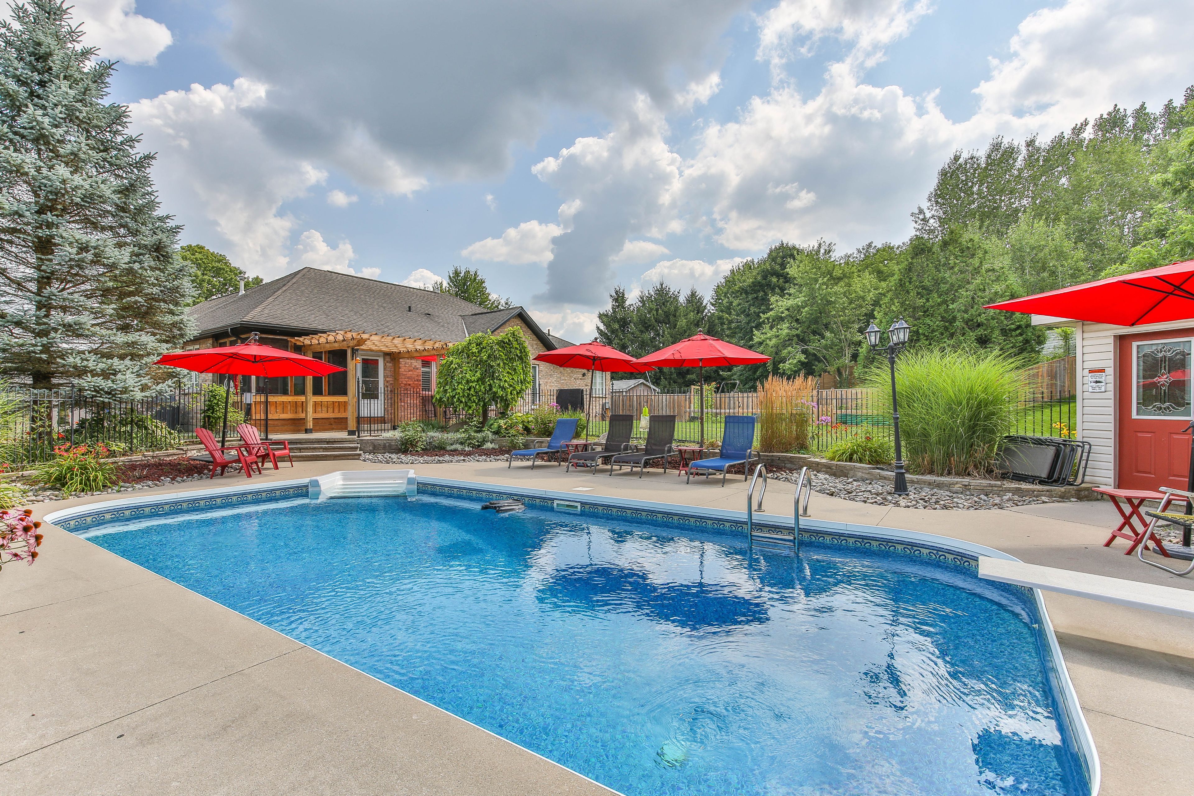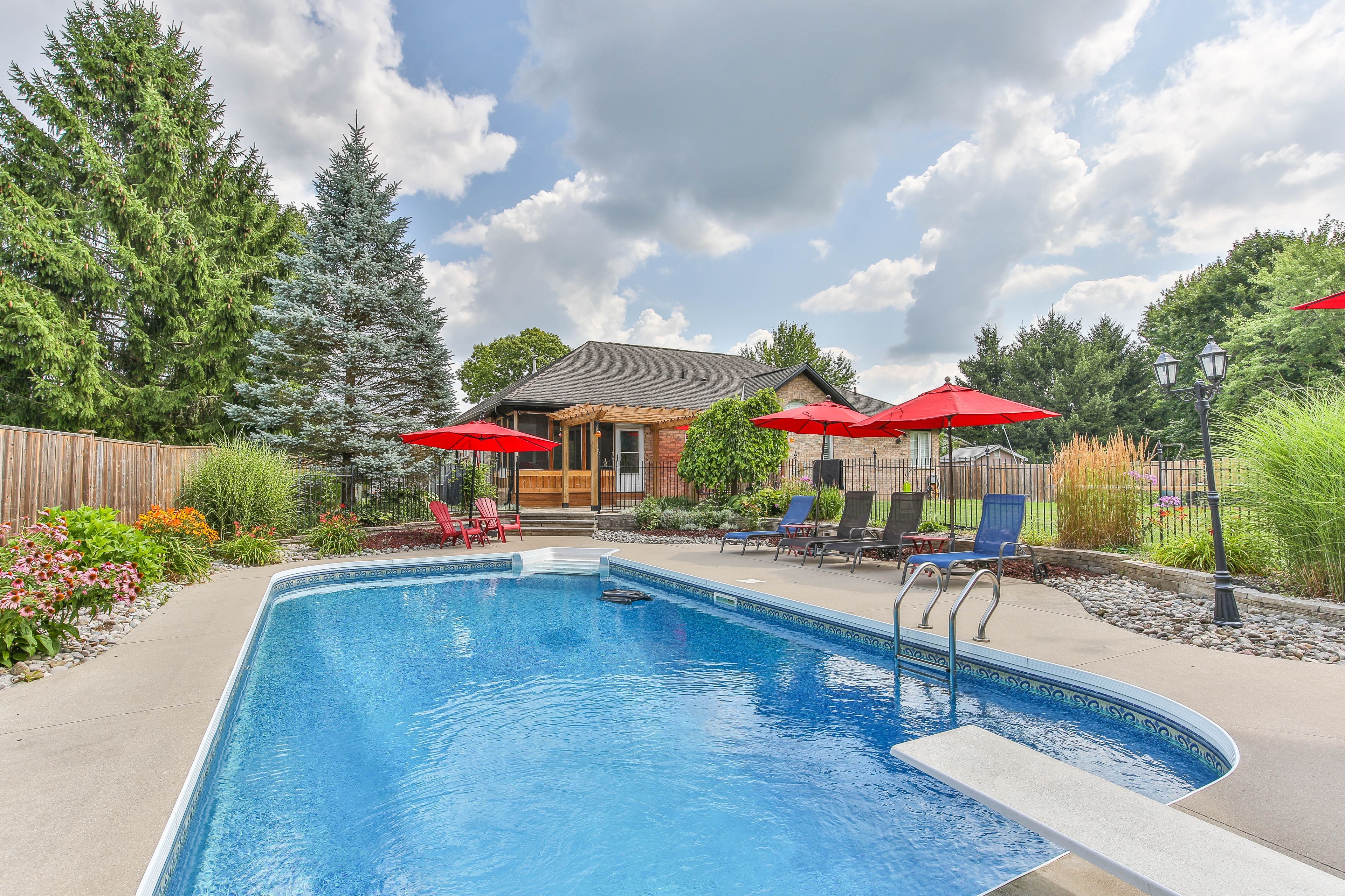 Rare find! This 1802 sq ft bungalow nestled on a 0. 443 acre pie lot (no back neighbours) comes with 2 primary bedrooms with ensuites and walk-in closets plus a basement walk-up to the garage- perfect for a future in-law suite! Main floor has a bright living room with fireplace, hardwood floors and california shutters, formal dining room and updated kitchen with granite counters, gas stove, large eat-in area. The mudroom off the 23. 6 ft wide garage can be a future main floor laundry room with butler sink. The sunroom is off the kitchen and is screened in for all hours of use and opens to the backyard oasis! The in-ground heated pool can be used from april to october, the pergola and concrete patio offer plenty of entertaining space. For the avid gardener- there's a large fenced garden area. Both sides of the house offer extra storage space and plenty of room for backyard access and private bbqing space. Primary bedroom has a walk-in closet and 3 pc ensuite with glass and tile shower and granite vaniety. Main bath tub and surround just replaced in 26' with a cheater door to the 2nd bedroom. Downstairs has a 24. 8x18. 4 2nd primary bedroom that includes: a gas fireplace, 99 sq ft dressing room plus walk-in closet, 4 pc ensuite with double sink vanity with granite counters, tile walk-in shower. Family room has a pool table (negotiable) and bar. Utility room has 2 laundry sinks and laundry room. Bonus storage room off the hallway has an owned water softener. Cold room has extra storage space.