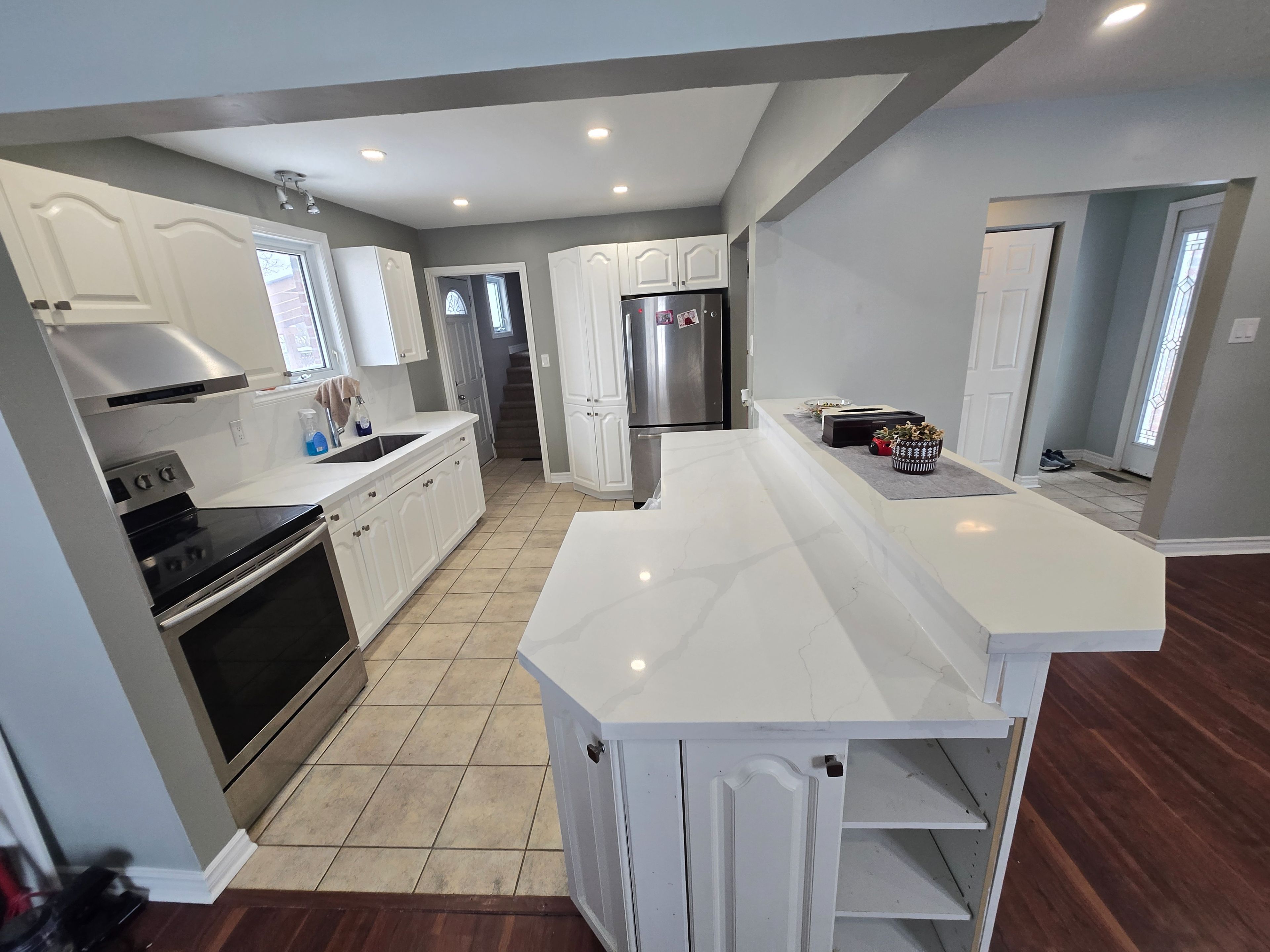 • Bright kitchen with stainless steel appliances and a large breakfast bar.