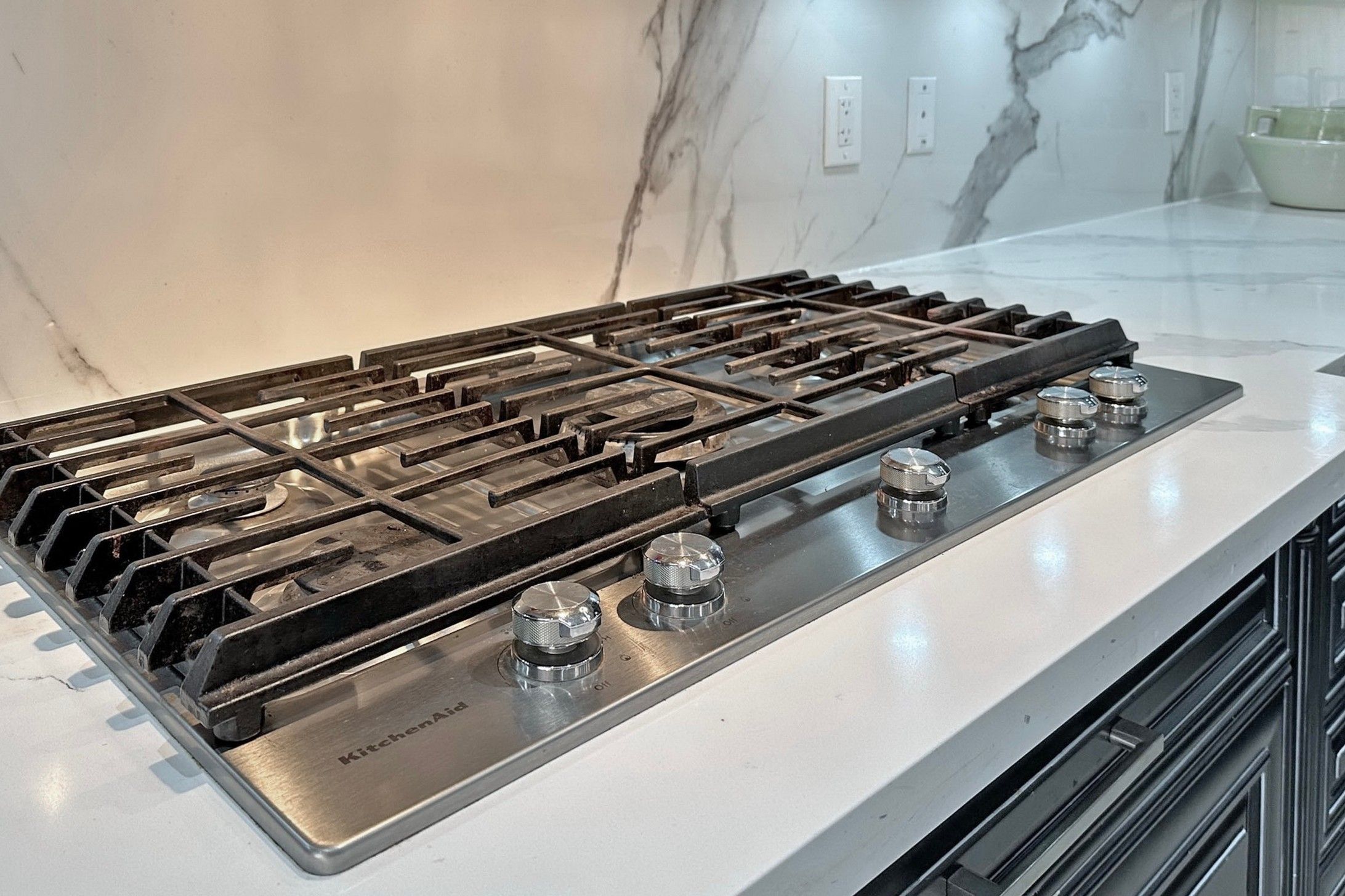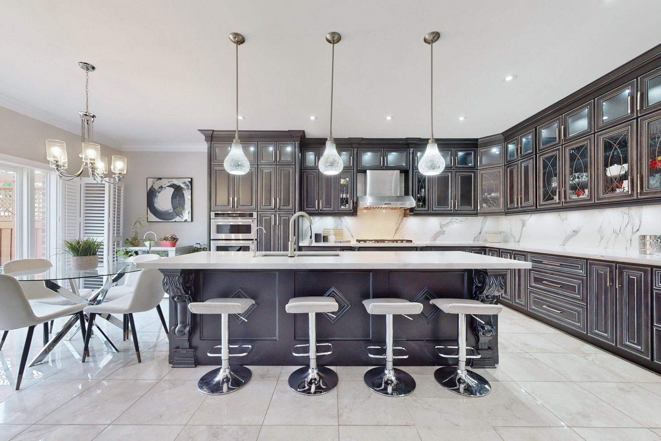 • Custom kitchen features tall cabinetry and quartz countertops.
