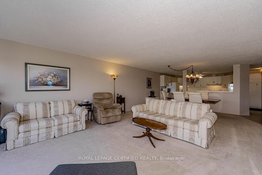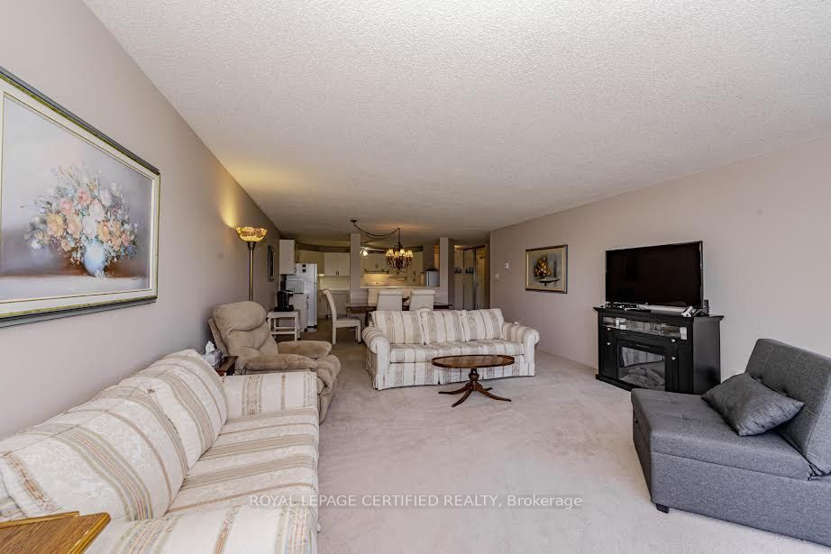 Welcome to this spacious 2-bedroom executive condo designed for both comfortable family living and friendly entertaining. This unit is large and filled with natural light. The bright open concept living/dining room are an entertainers dream that offers scenic unobstructed views from the floor to ceiling windows allowing you to watch the park fireworks and park events as they occur. The recently updated kitchen offers lots of cupboards and storage that is open to the dining area. The primary bedroom is a comfortable haven. The washer and dryer are well hidden in the closet space as you walk towards the primary bath. The second bedroom is a great large space that offers great storage. Beautiful views from every window in this unit, and much lower condo fees & lower property taxes than a 3bdrm unit in the complex. Newer ac units, cordless blinds, kitchen/bath/hall flooring 2023, washing machine 2023. The building has a water softener system and they offers many social activities: bingo, euchre, pot luck events, coffee socials, group chair exercise, fully stocked library/games room.... Etc. Extra parking is available. Centrally located and walking distance to riverside park (which also has electric car chargers), senior ctr and bistro, community swimming pool, easy access to all major roadways, close to hospital, great amount of shopping and restaurants within a five minute drive. Updated cabinetry, freshly painted, carpets have just been steam cleaned, so this unit is ready for your personal touches! Motivated seller