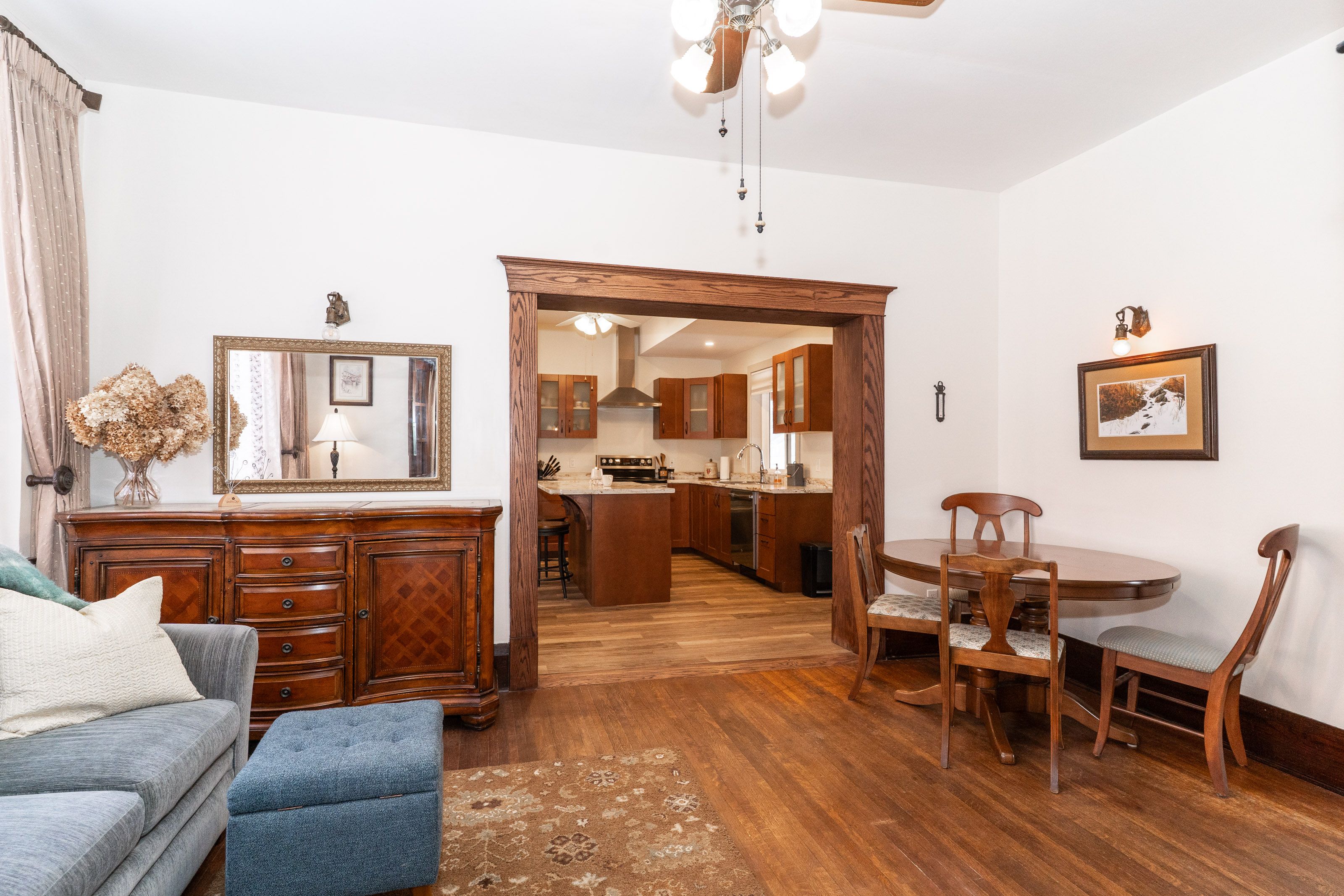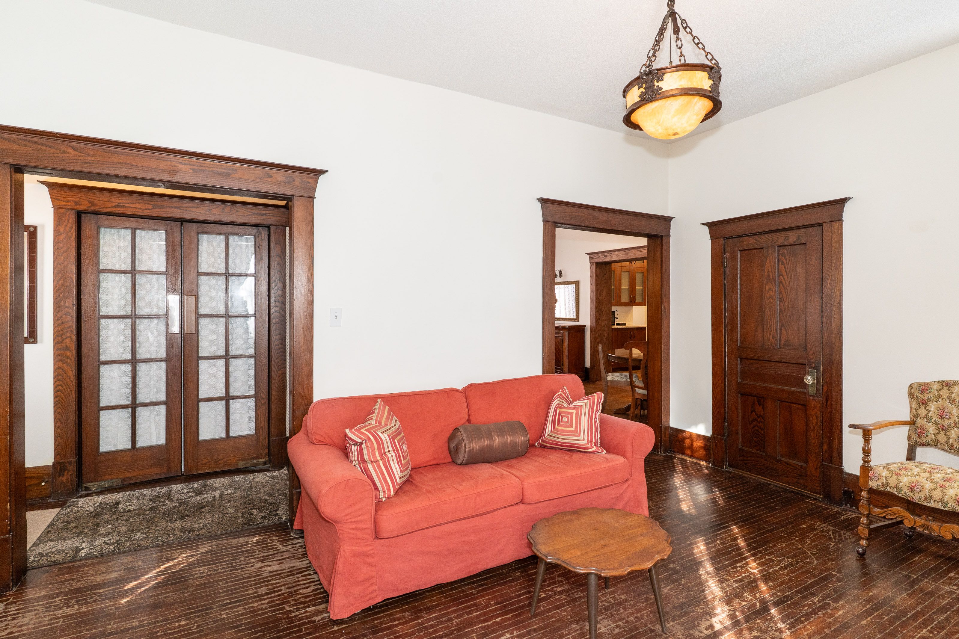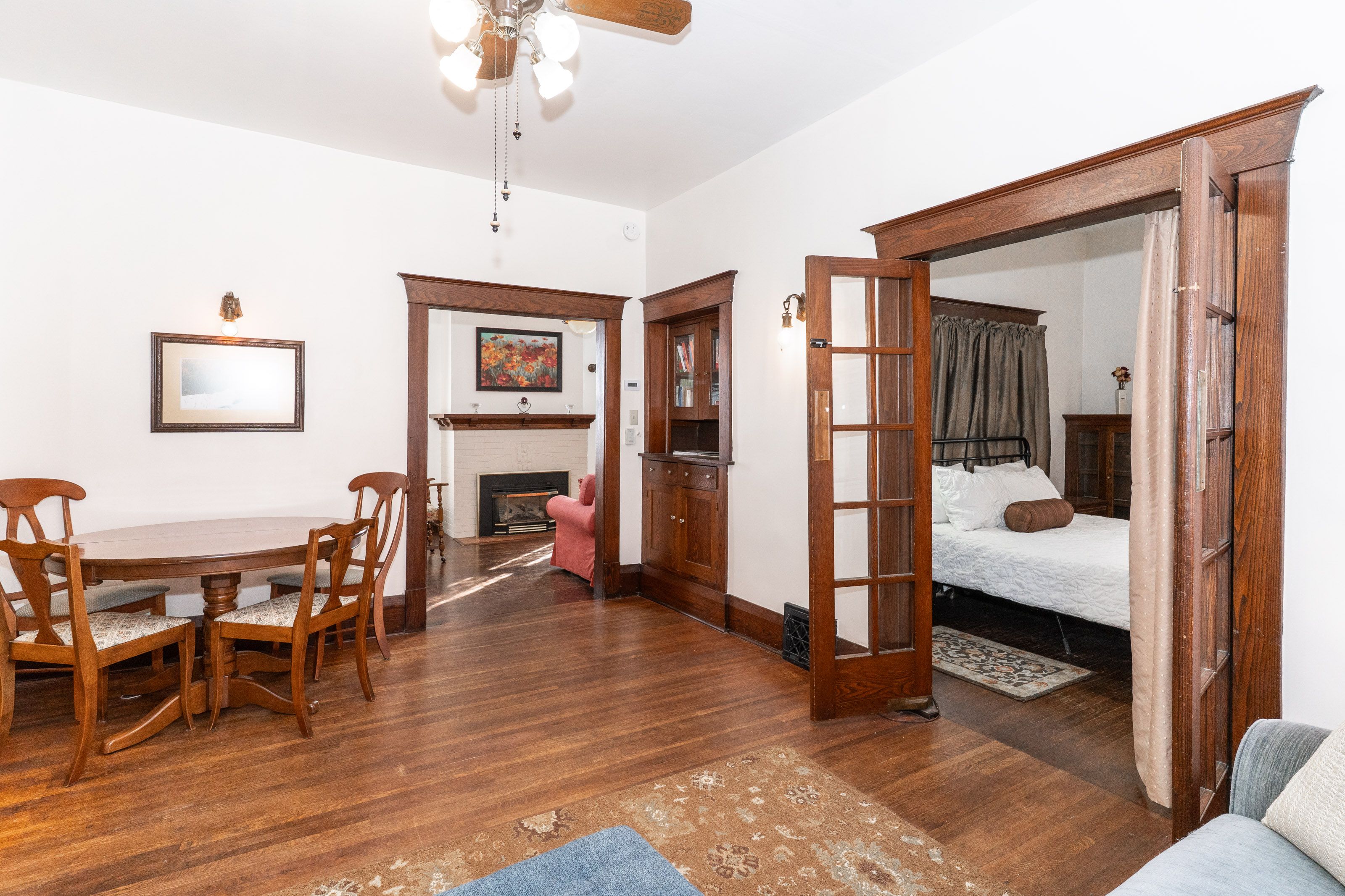 • Spacious layout with 9' ceilings, antique built-ins, and gas fireplace.