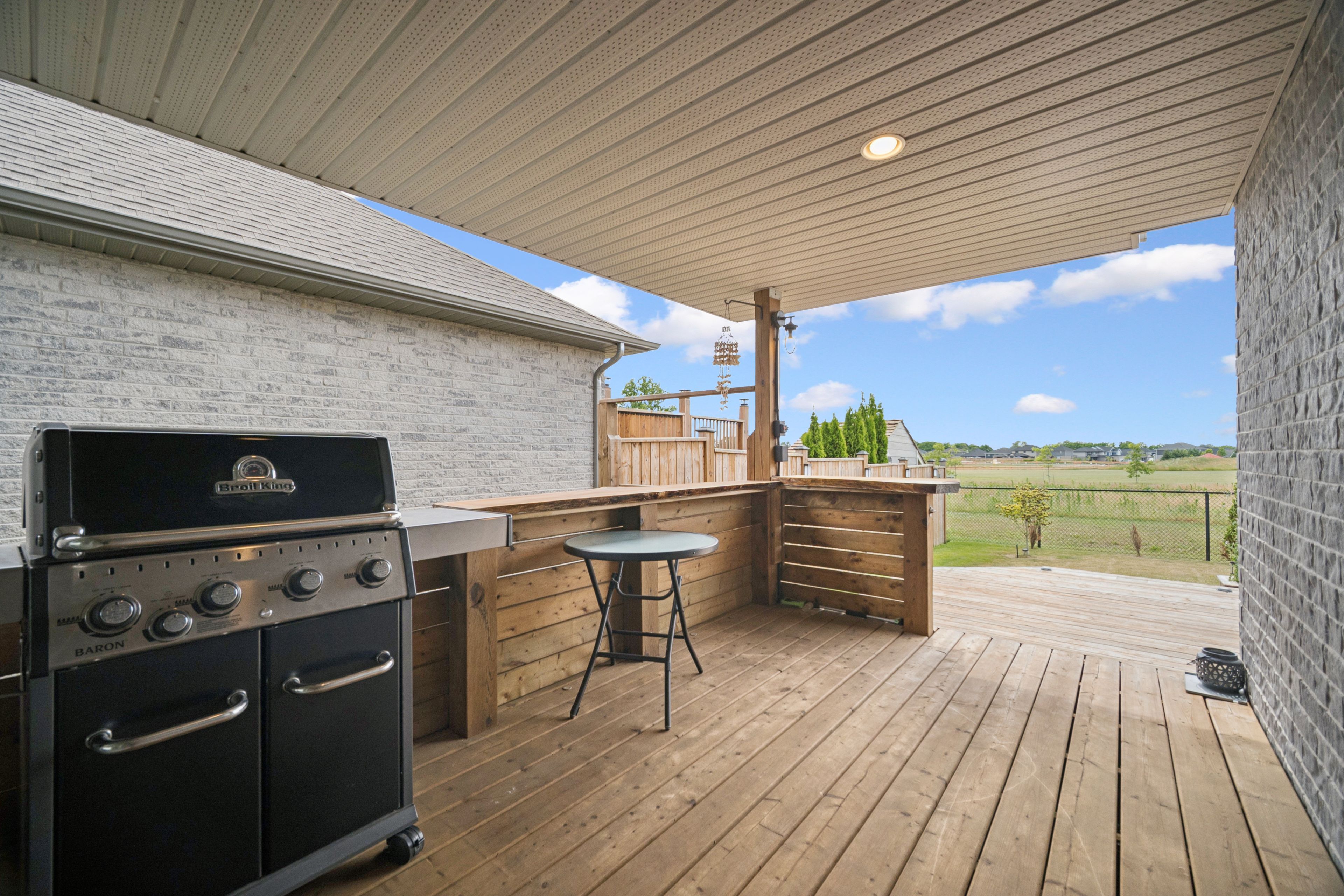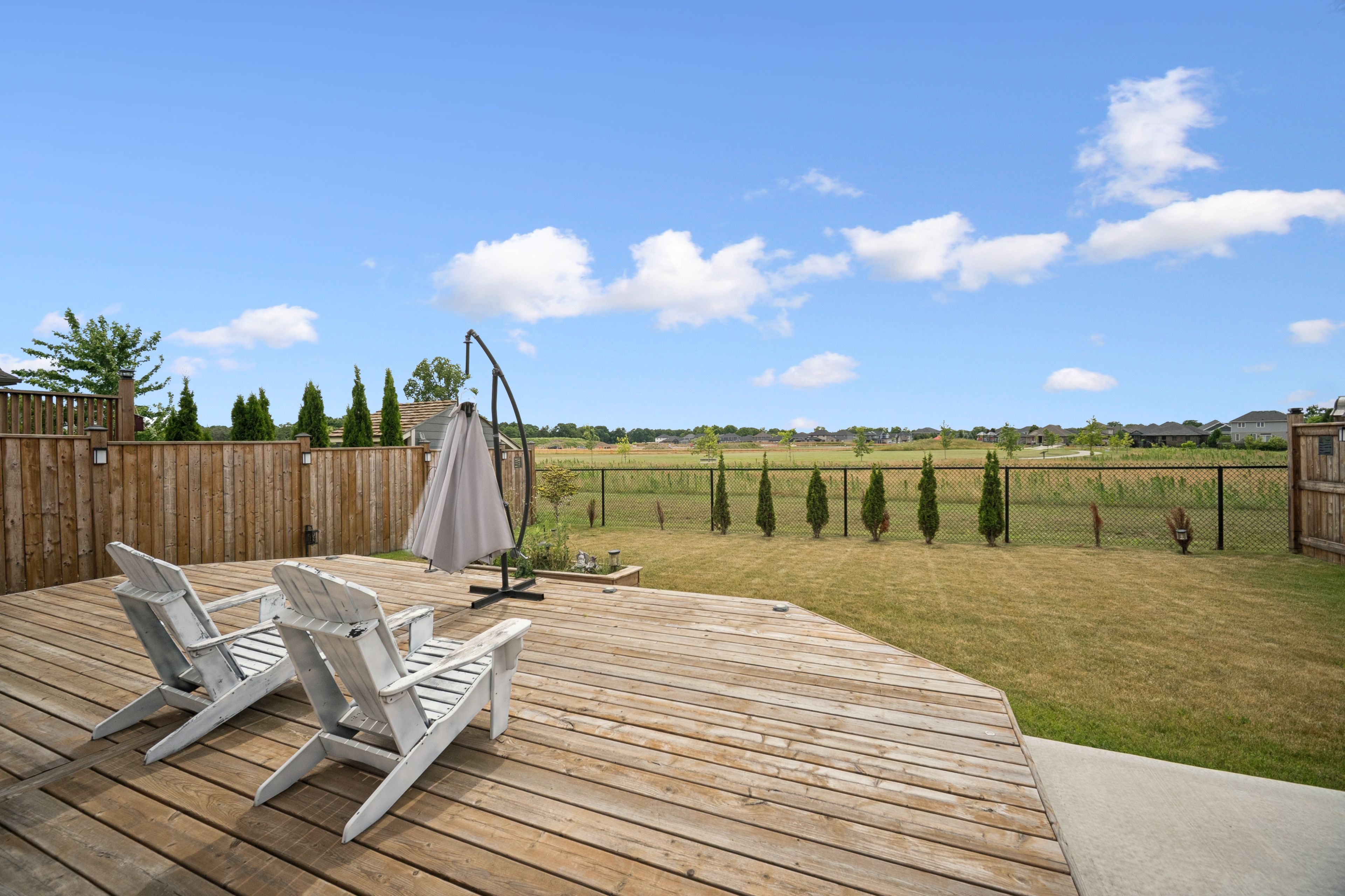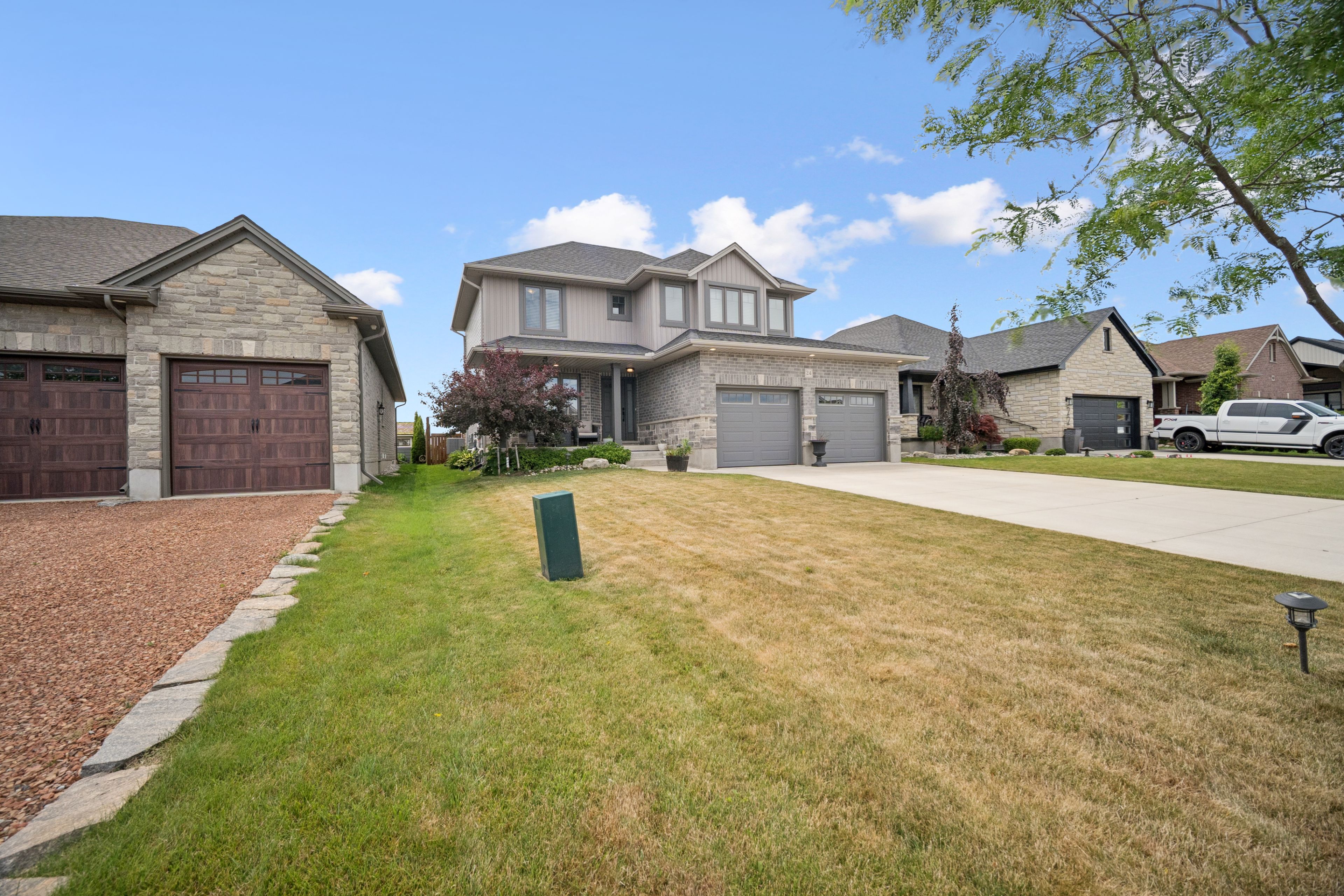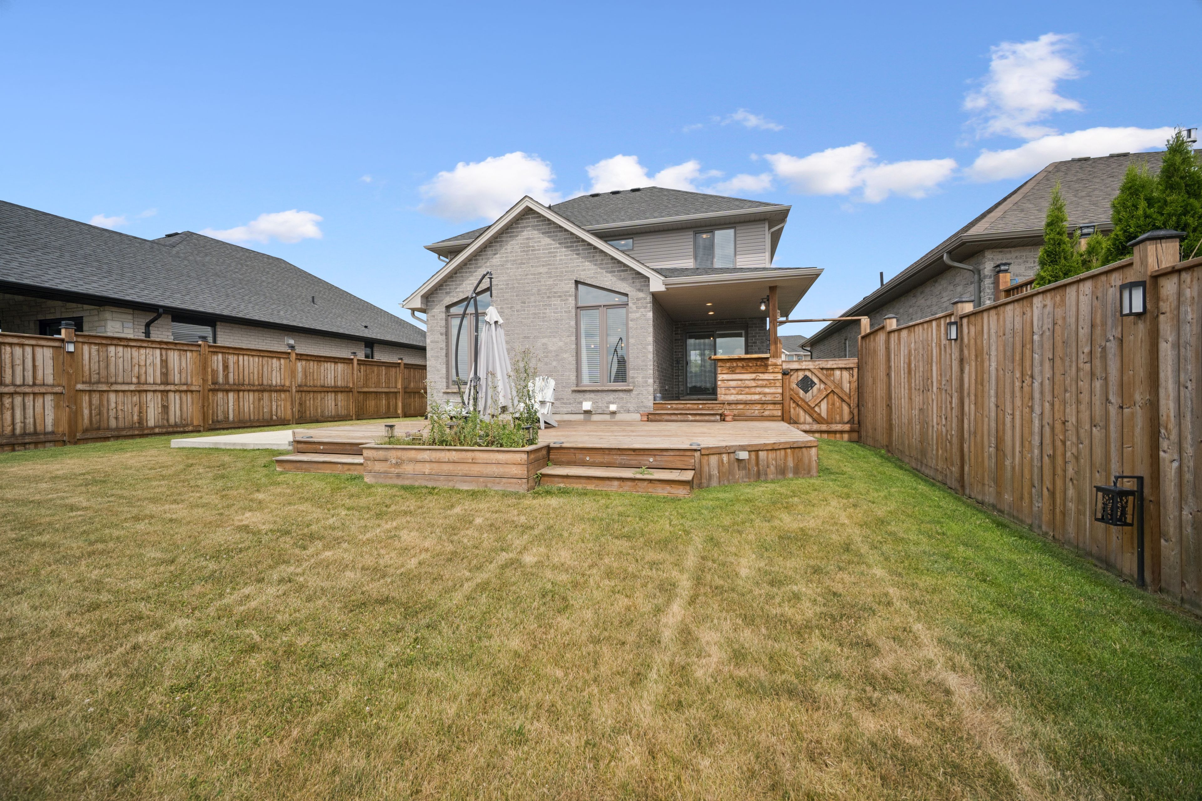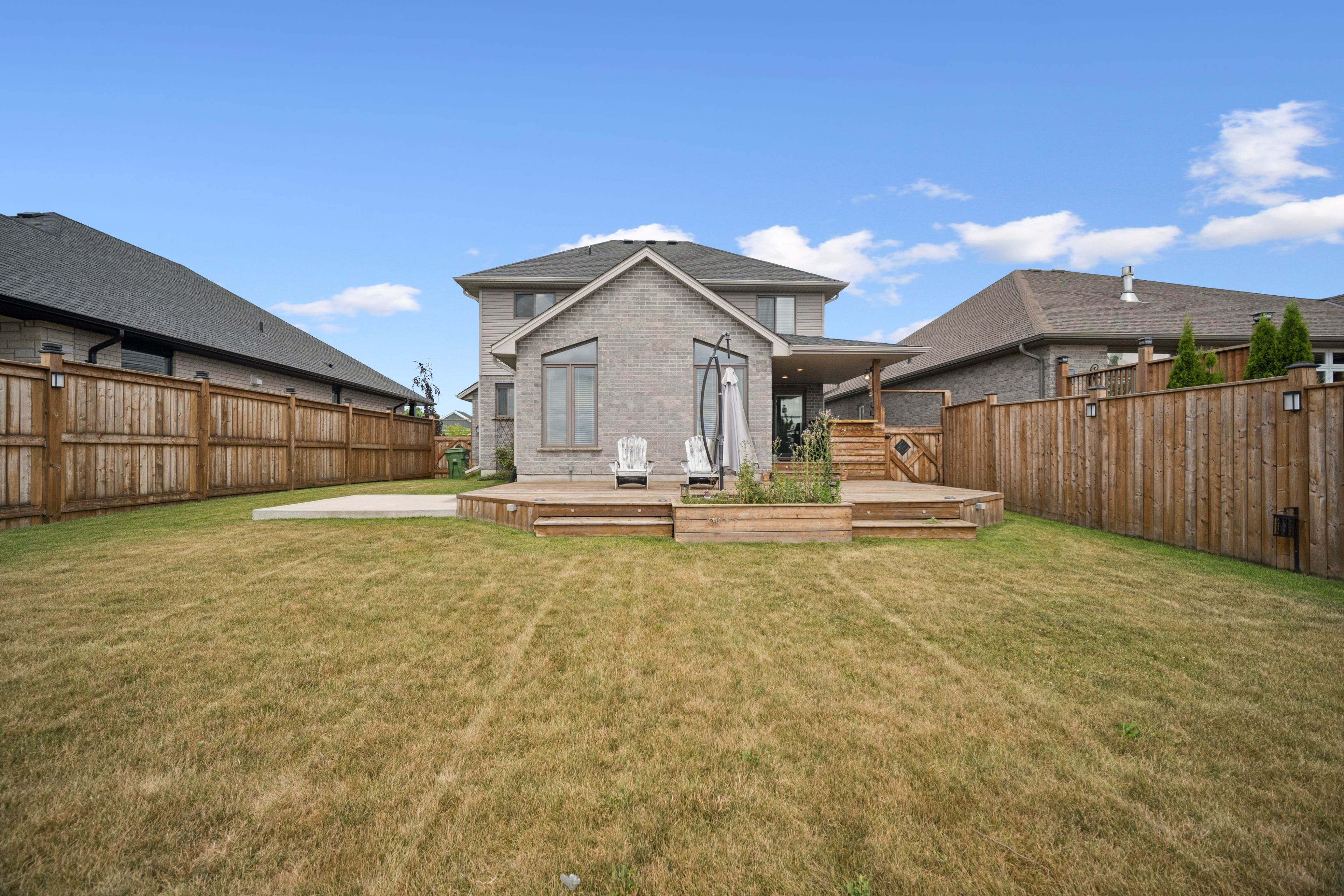 Welcome to 24 oakmont - a stylish and spacious 3+1 bed, 2. 5 bath home on a premium lot backing onto green space/parkland in the sought after shaw valley community. This custom built mp home blends function and flair with a concrete driveway, covered front porch, and beautifully landscaped yard. The entertainer's backyard features a two-tier deck with ambient lighting, a live-edge bar in the covered area, and gas bbq hookup. Inside, enjoy an open concept main floor with vaulted ceilings in the living room, spacious dining room with access to the yard, a bright gcw kitchen with quartz counters, island, backsplash, pantry and a cozy living room with electric fireplace. The main floor office, stylish 2 pc bath and access to the garage complete the main level. Upstairs offers a laundry room, two spacious guest bedrooms, a 4pc bath, and a serene primary bedroom with walk-in closet and spa-like ensuite with glass shower and freestanding tub. The finished basement includes a rec room with 8'2" ceilings, an extra bedroom, rough-in bath, and storage. Steps to daycare, close to port stanley and a quick commute to london and the 401.
