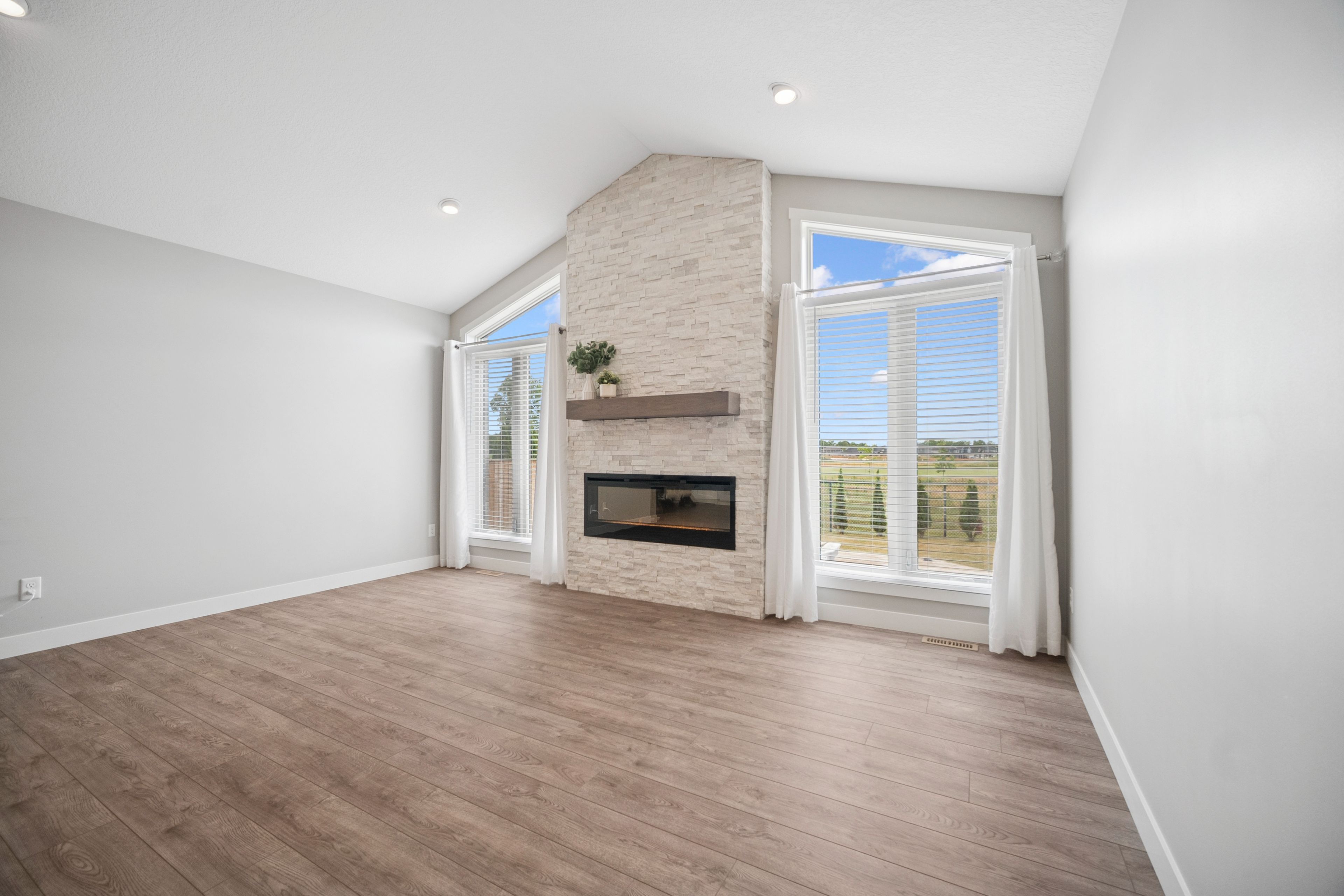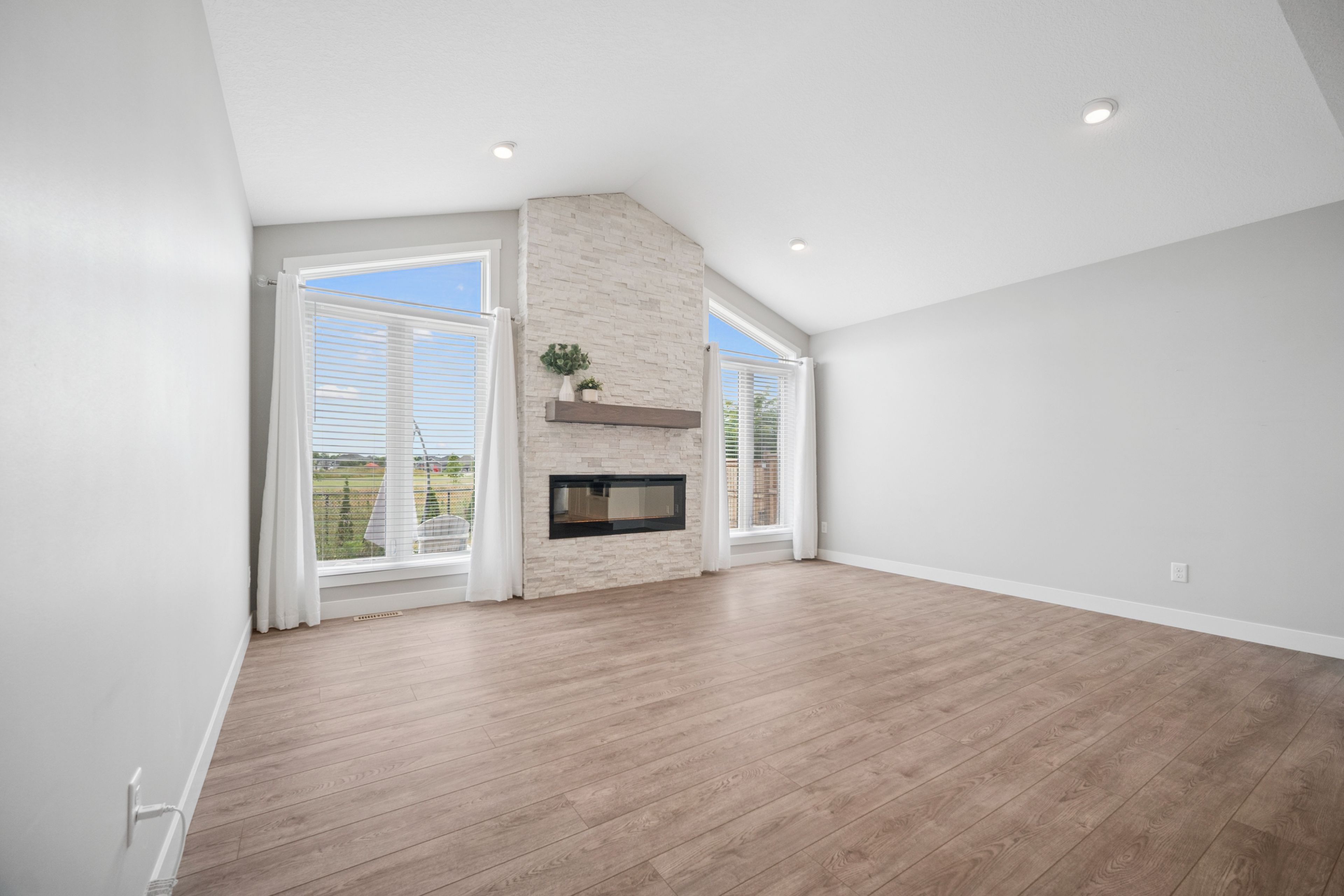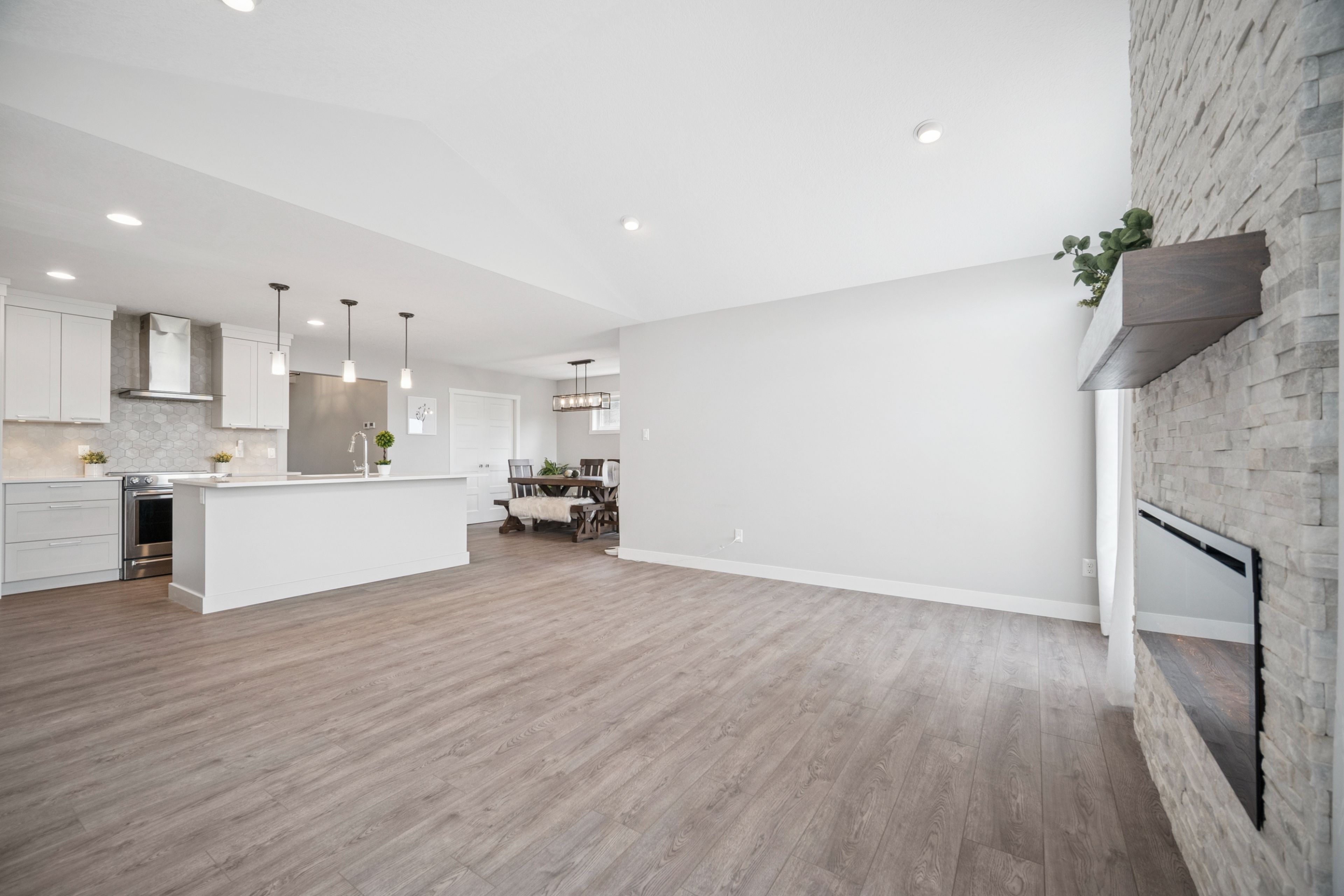 • Open concept main floor with vaulted ceilings and cozy electric fireplace.