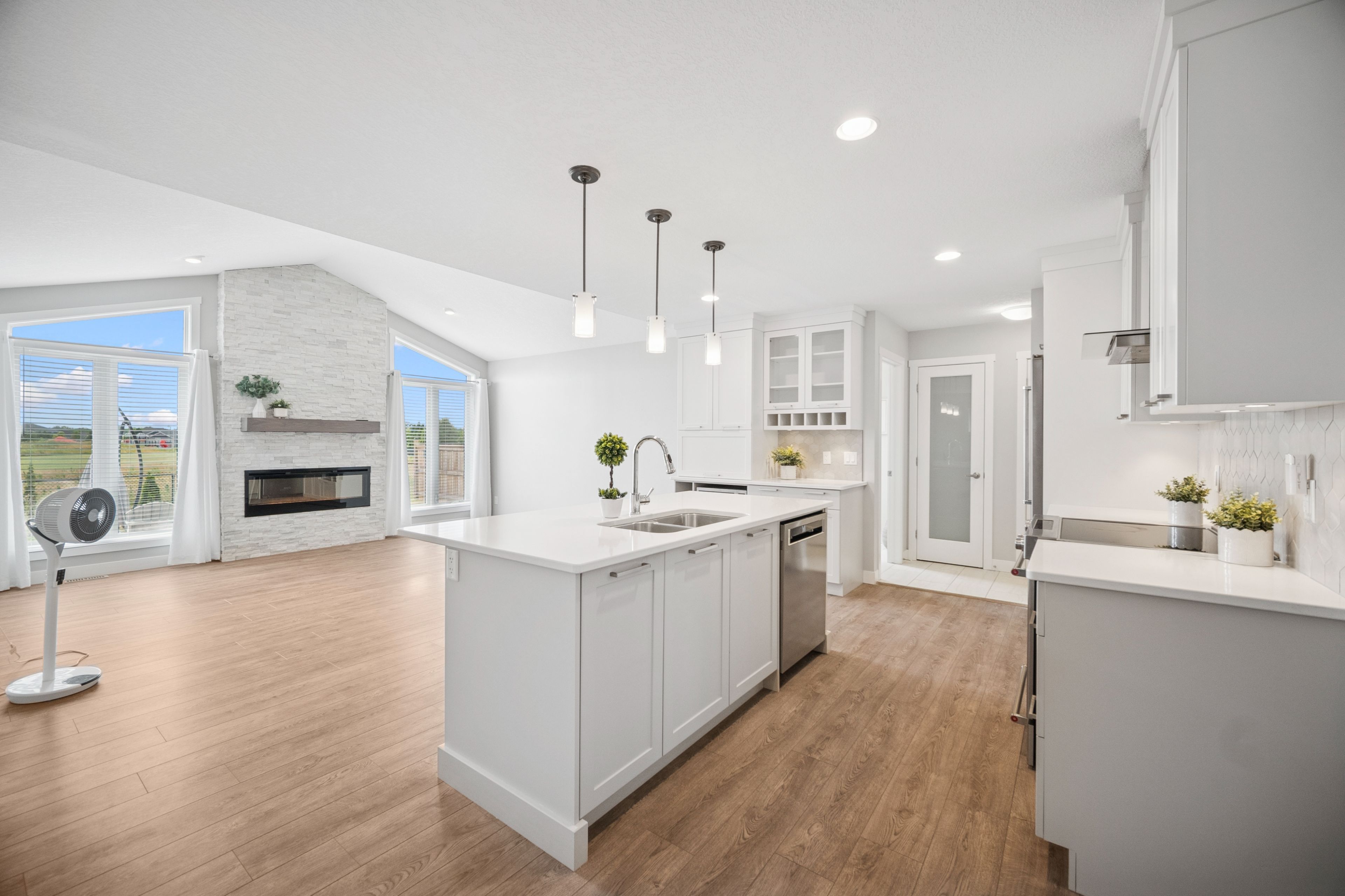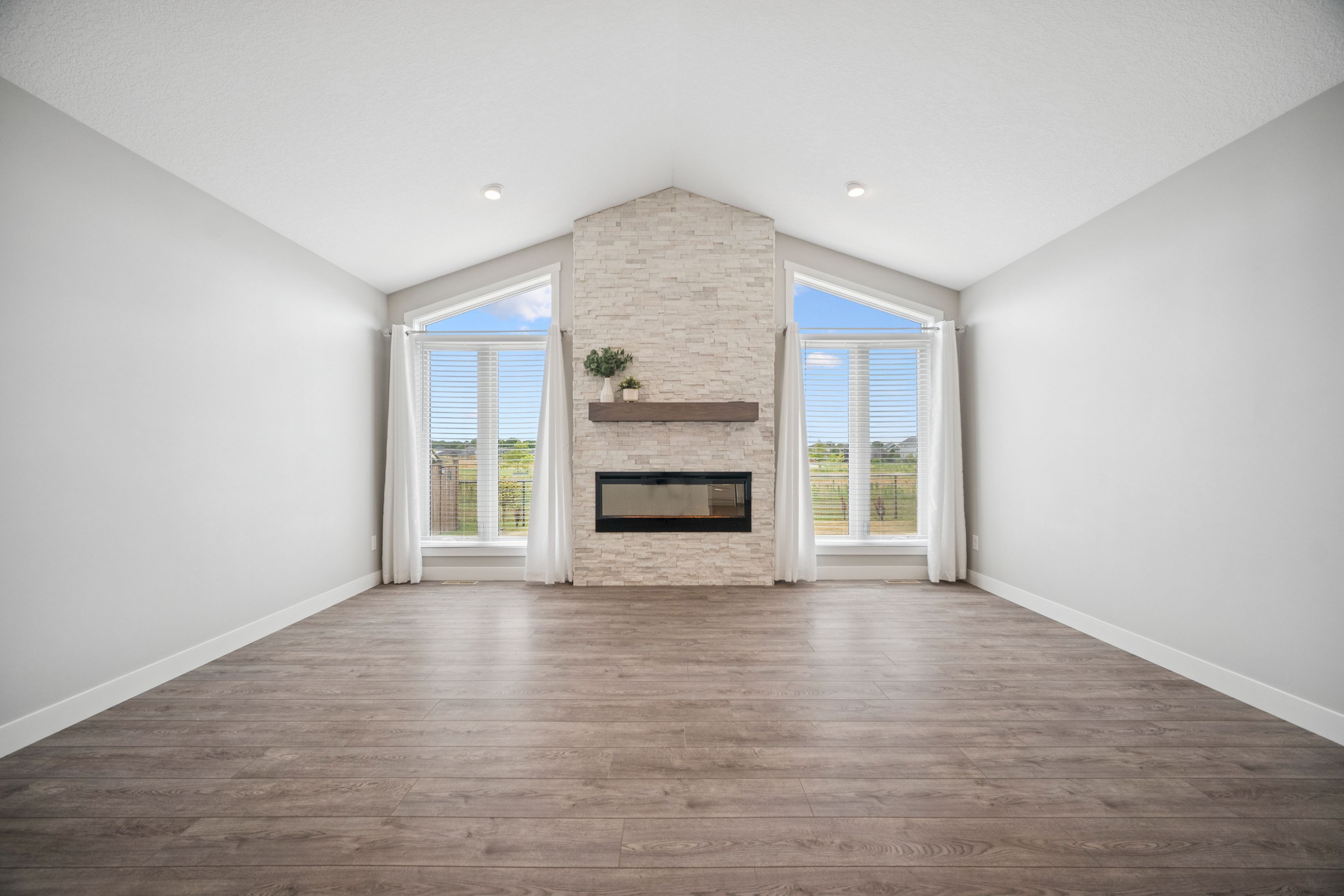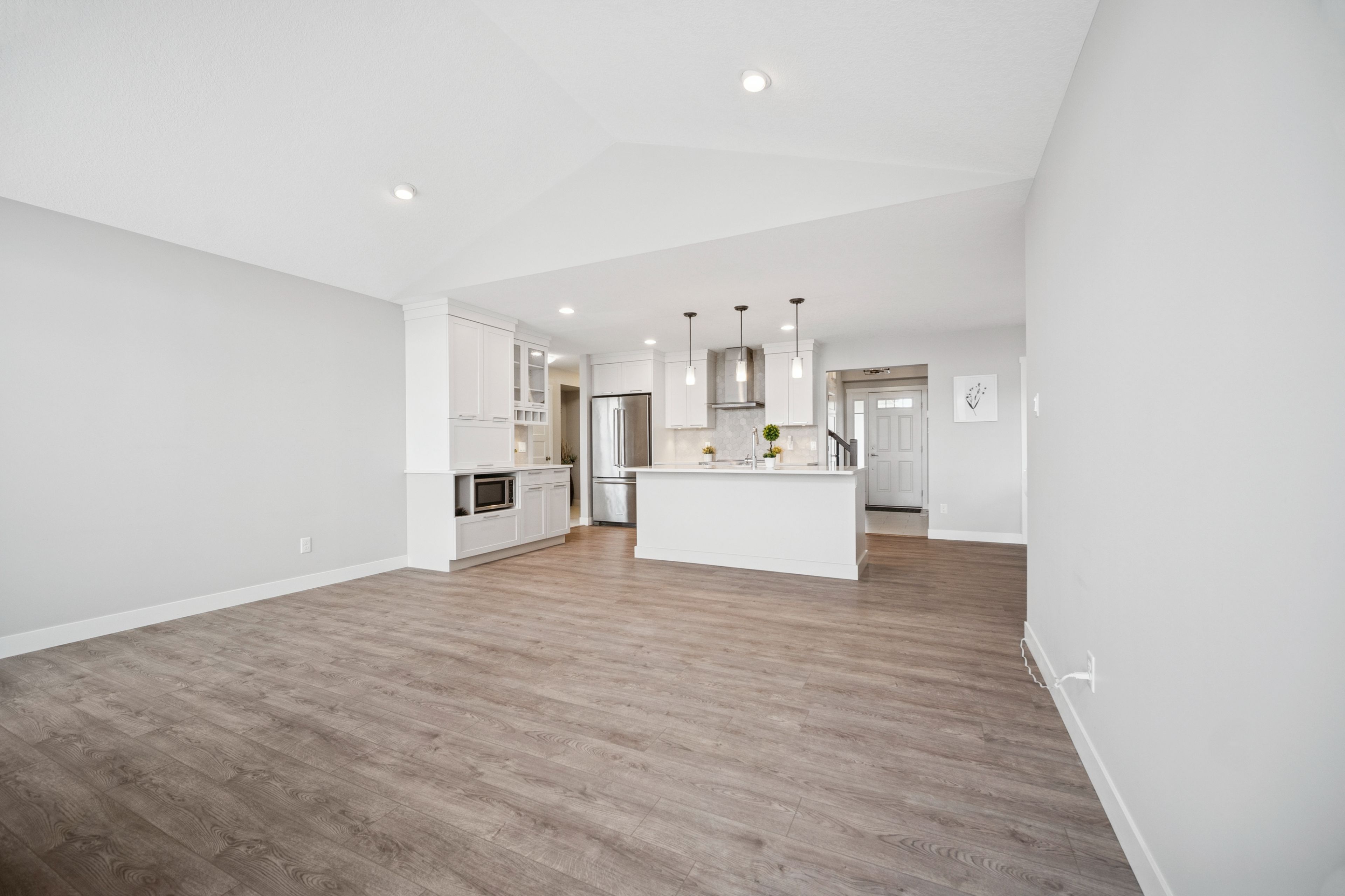 • Open concept main floor with vaulted ceilings and cozy electric fireplace.