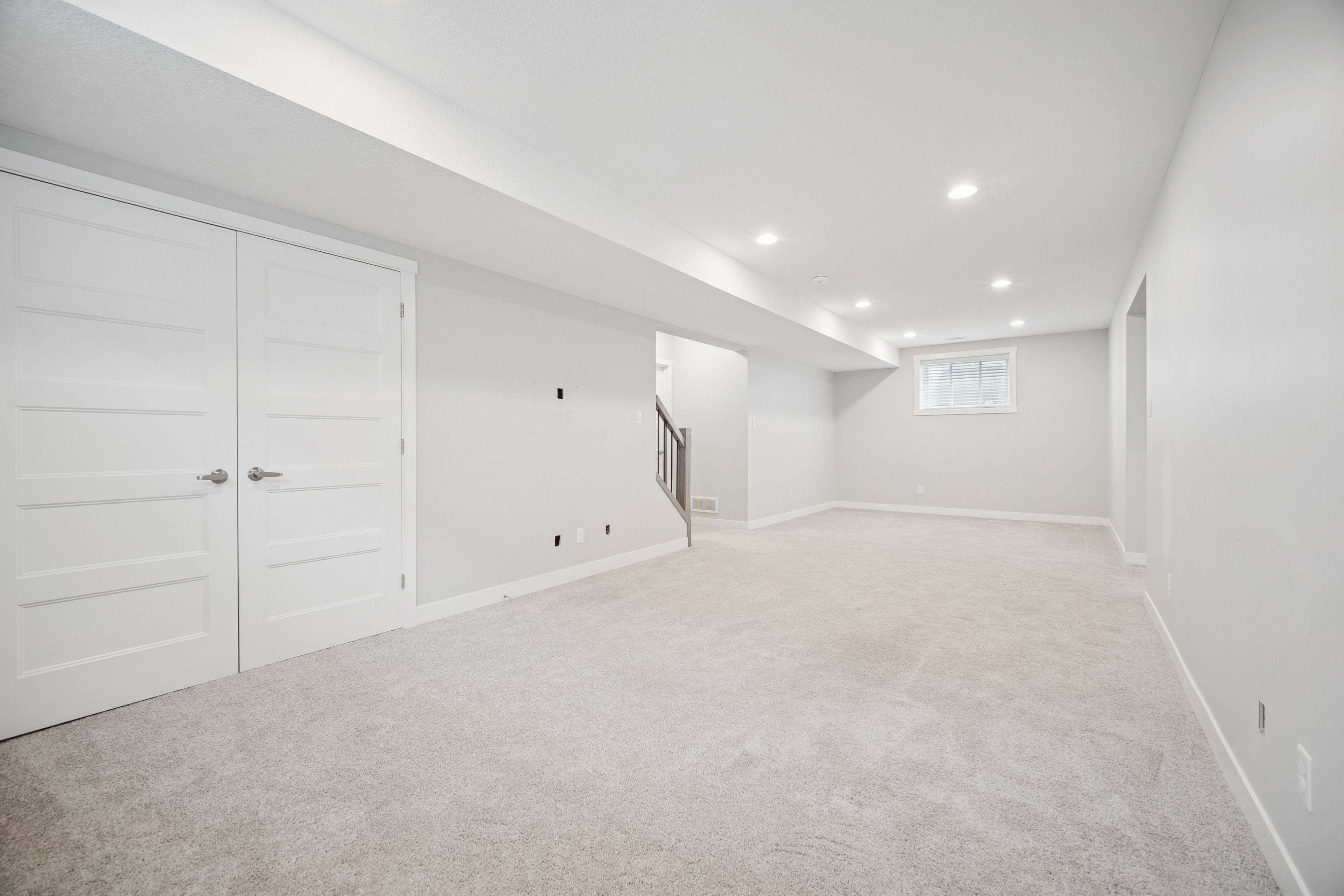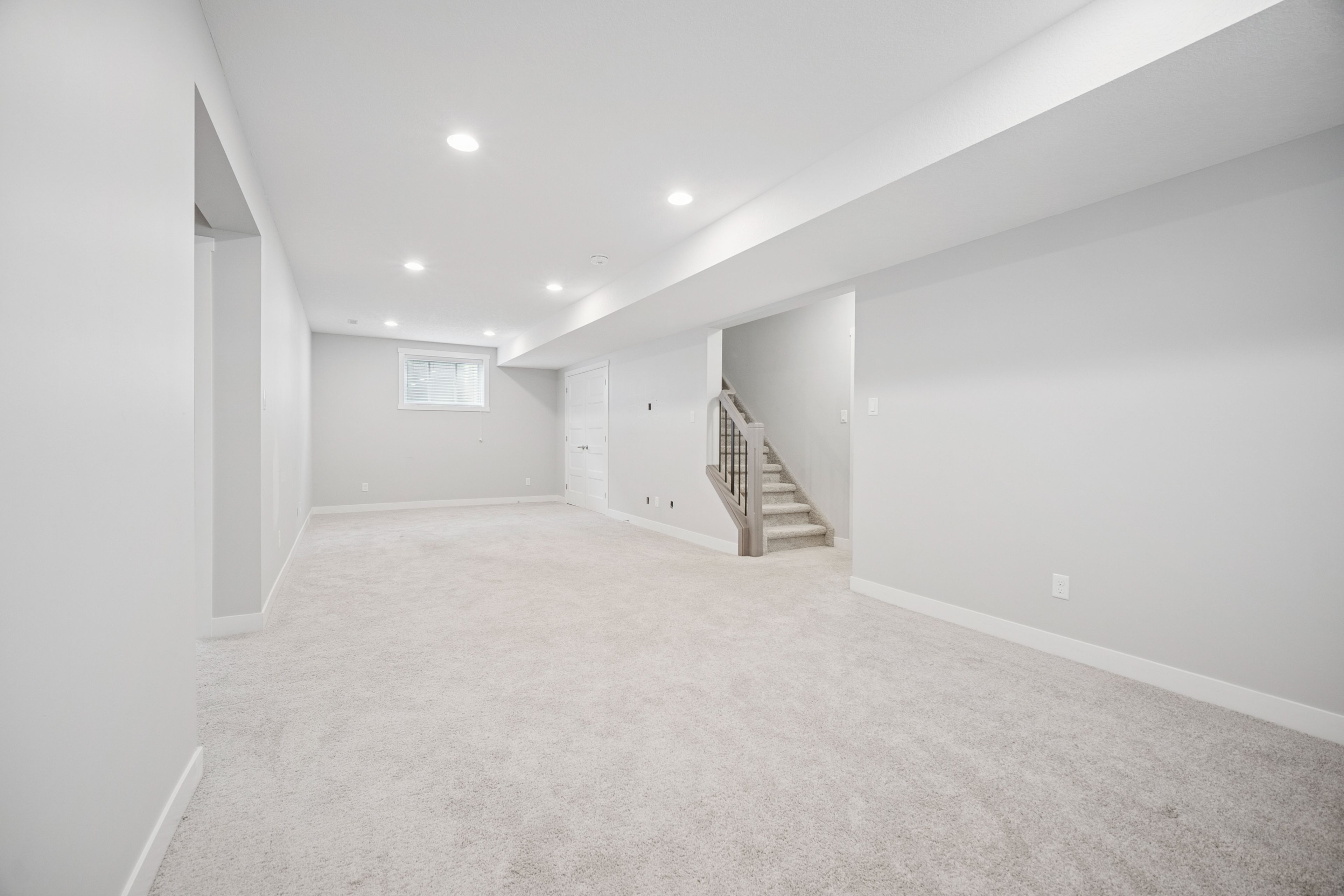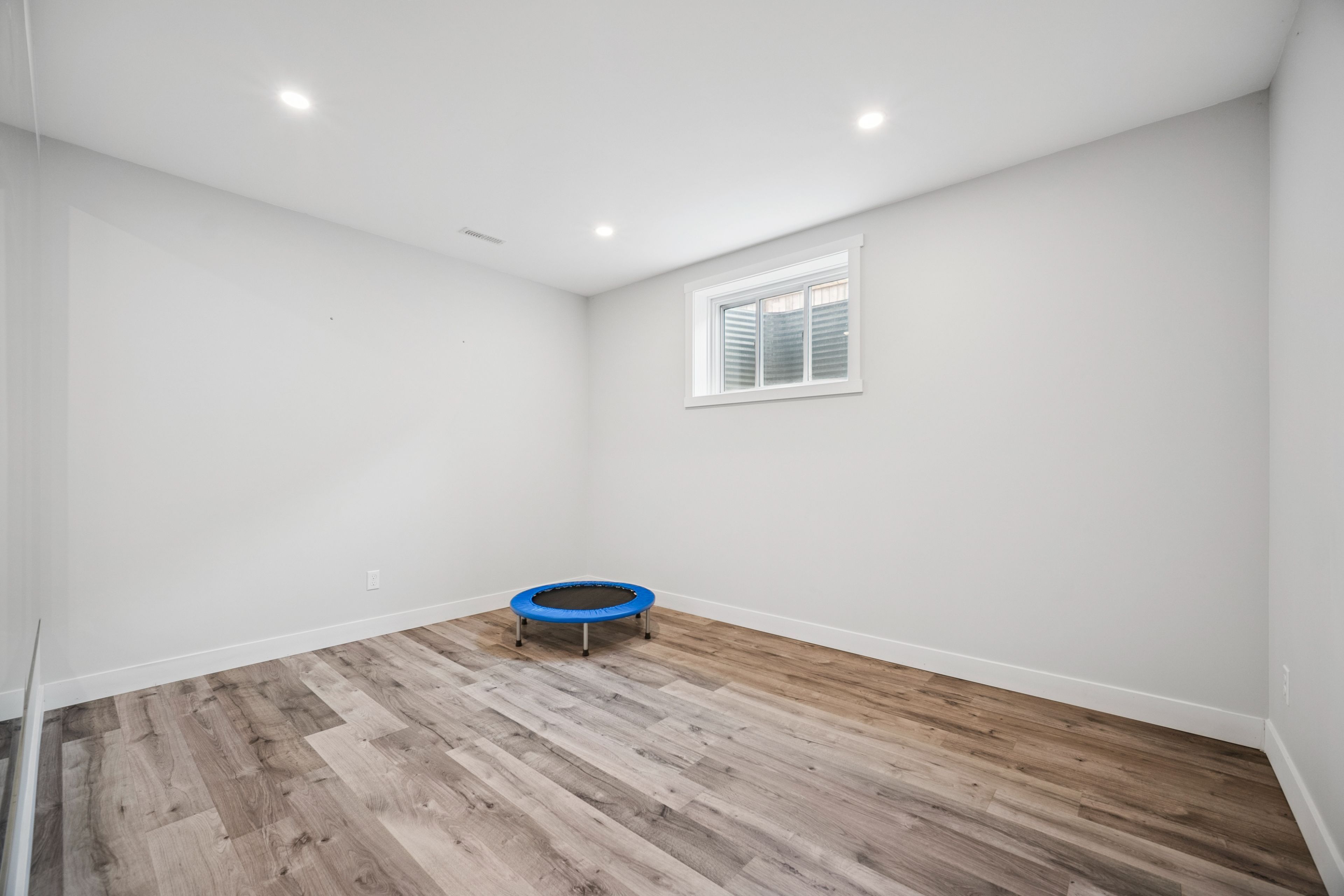 • Finished basement includes rec room, extra bedroom, and storage space.