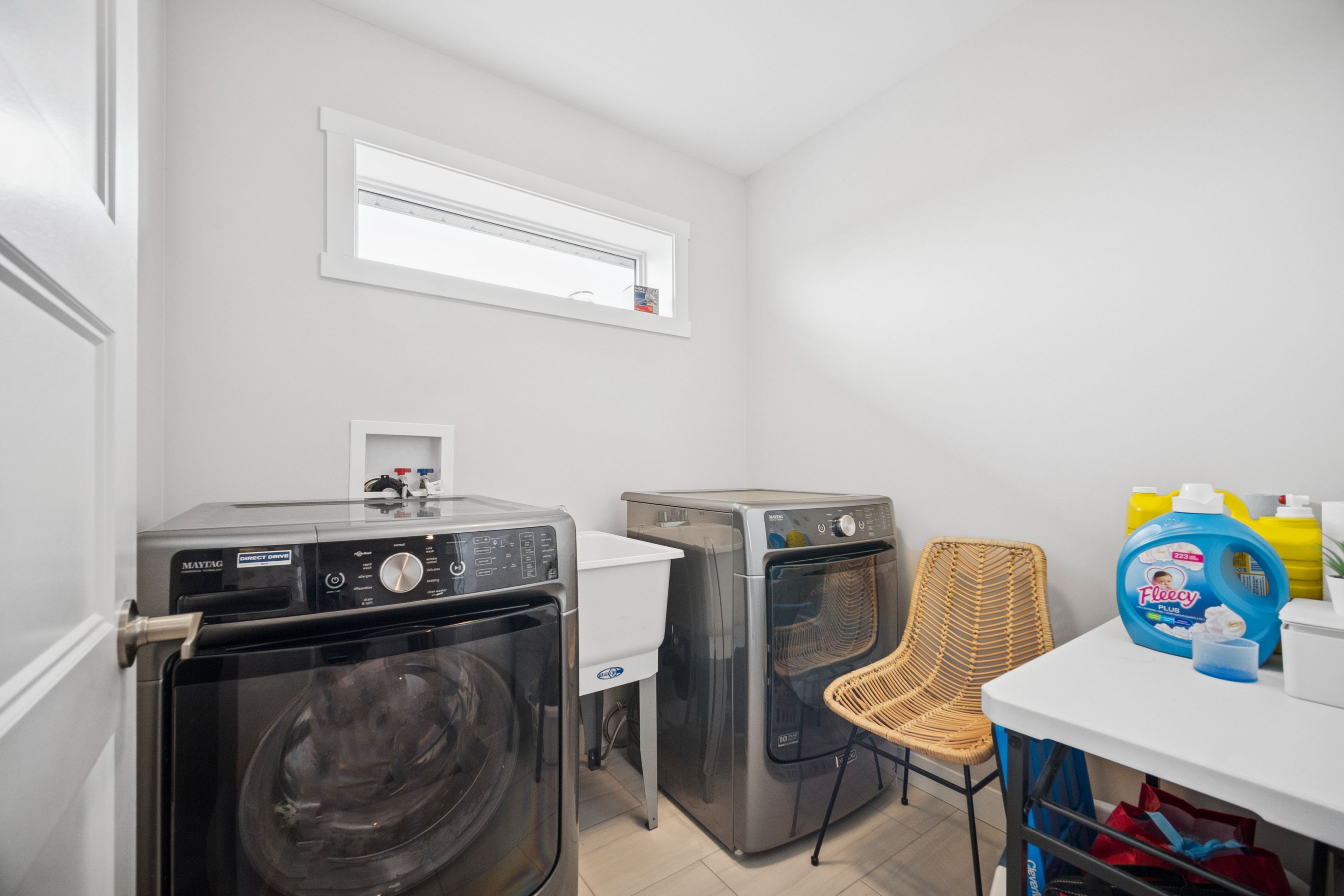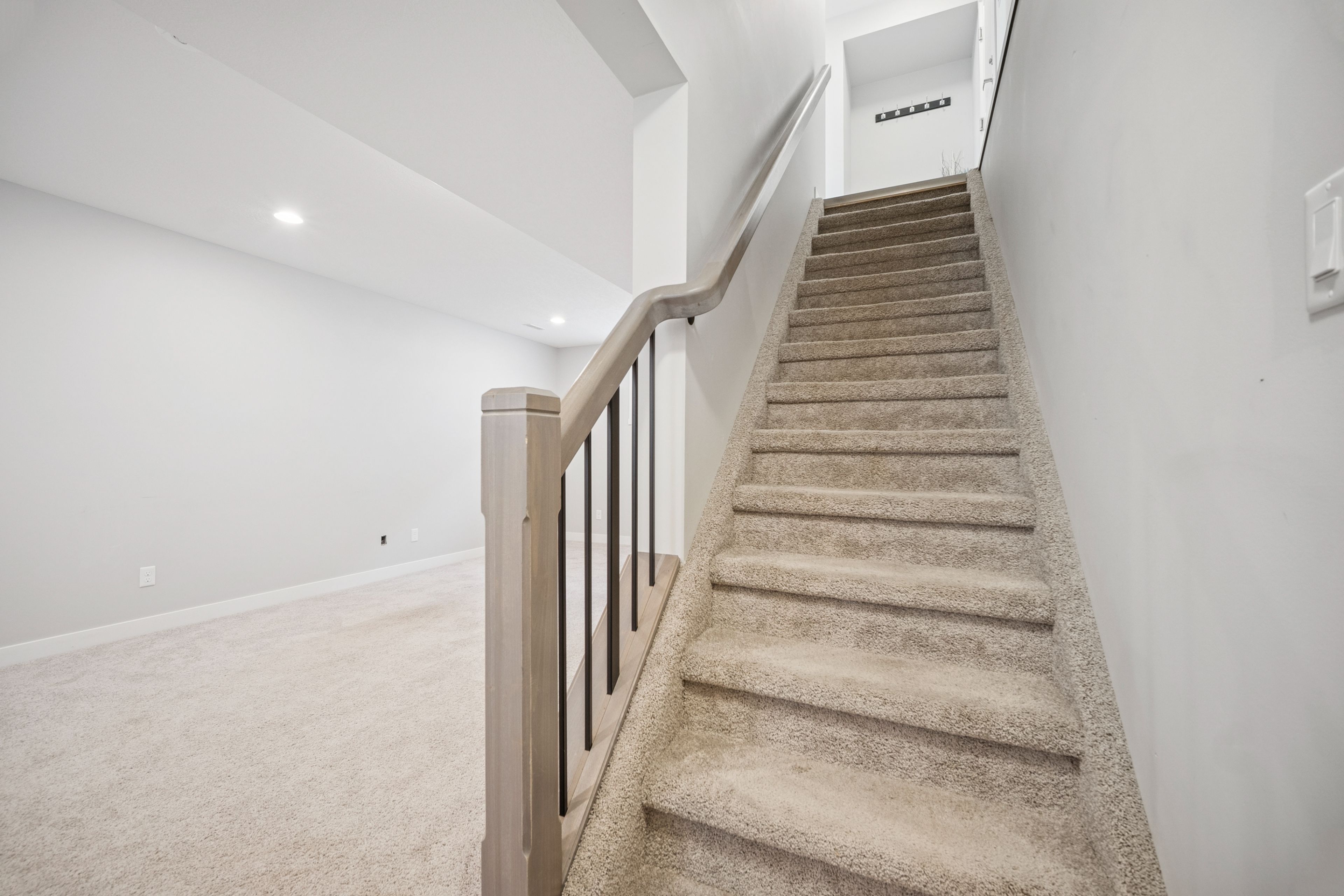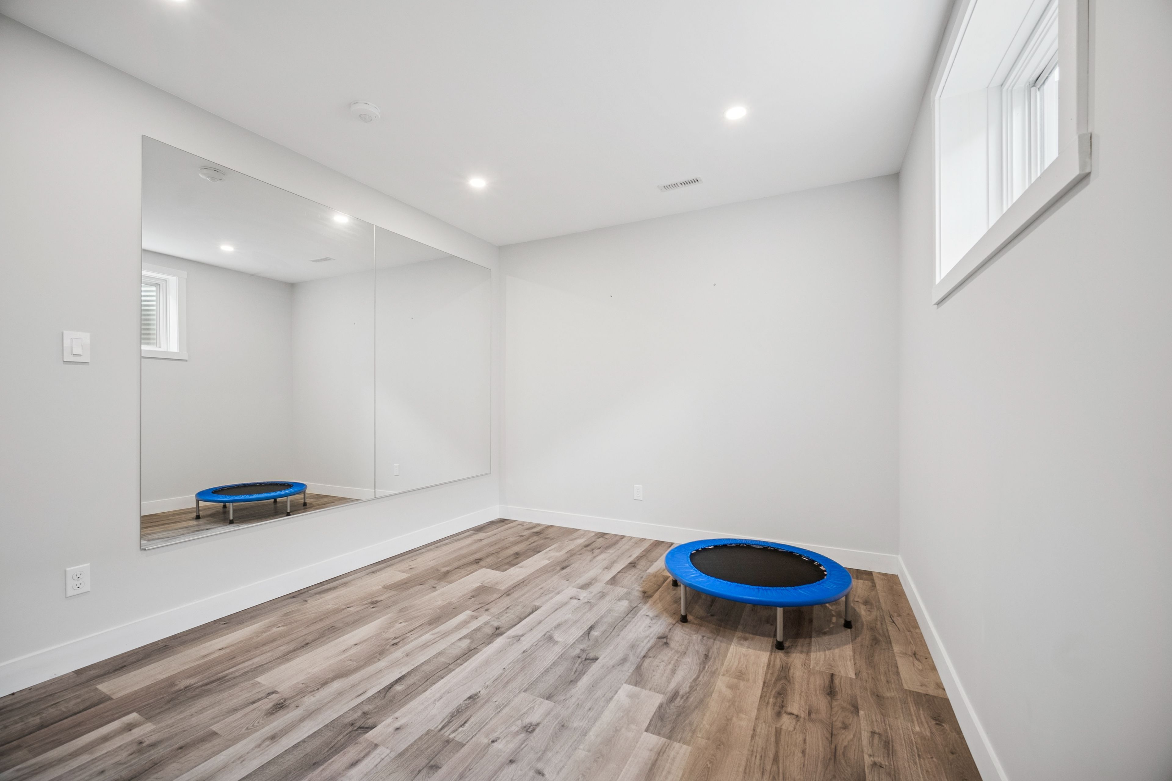 • Finished basement includes rec room, extra bedroom, and storage space.