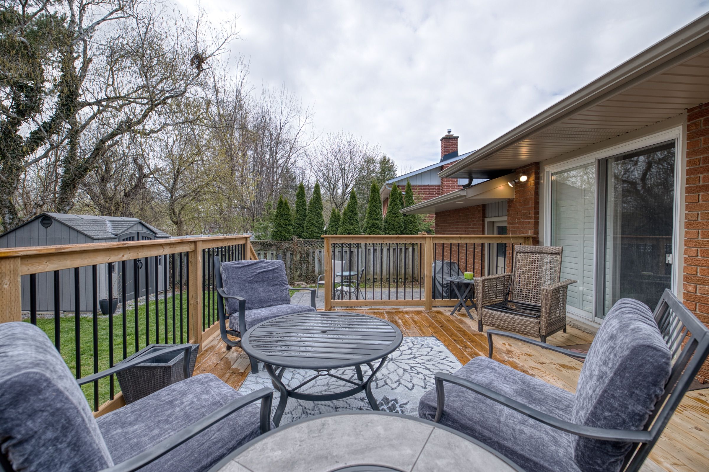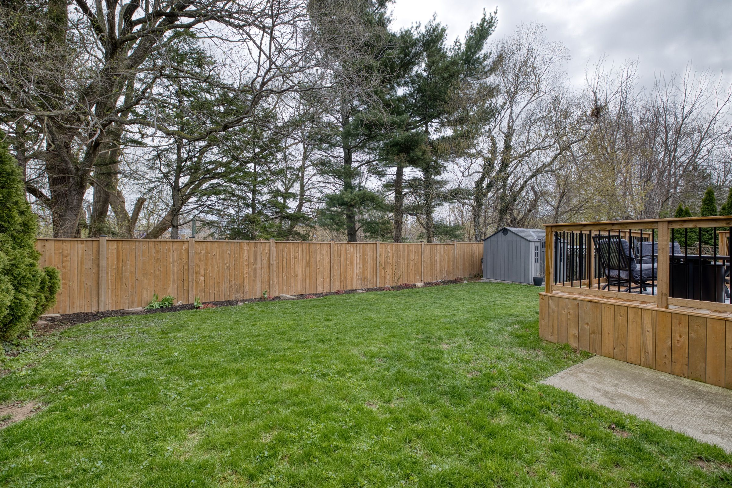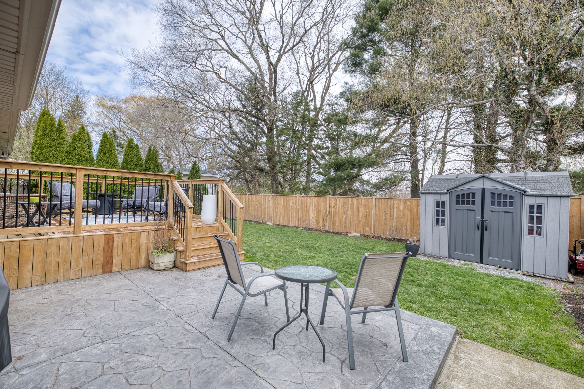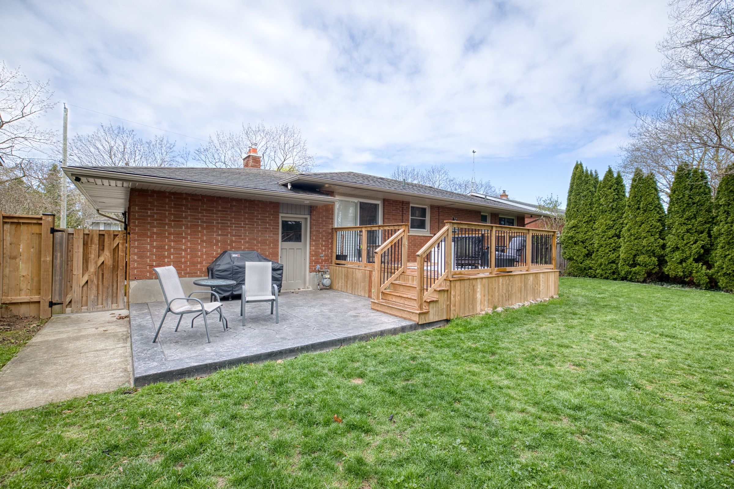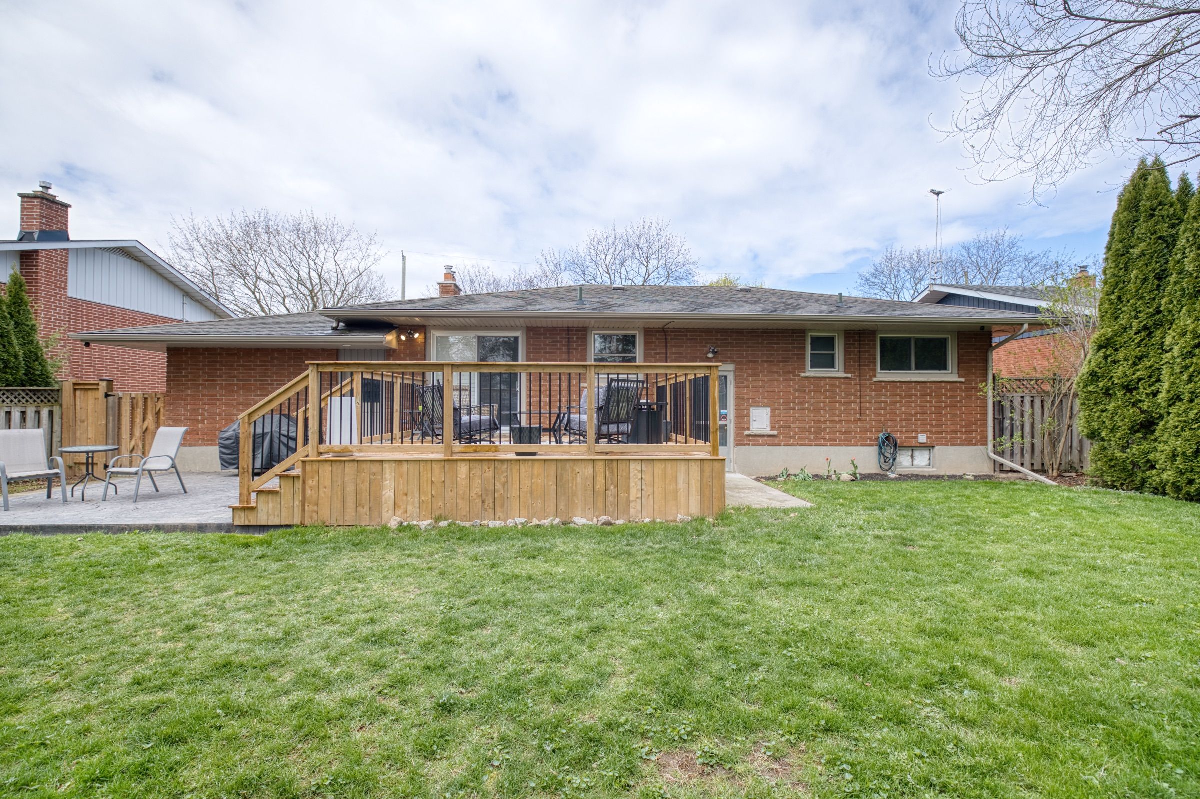 • Large backyard features a new wooden deck and concrete patio for outdoor enjoyment.