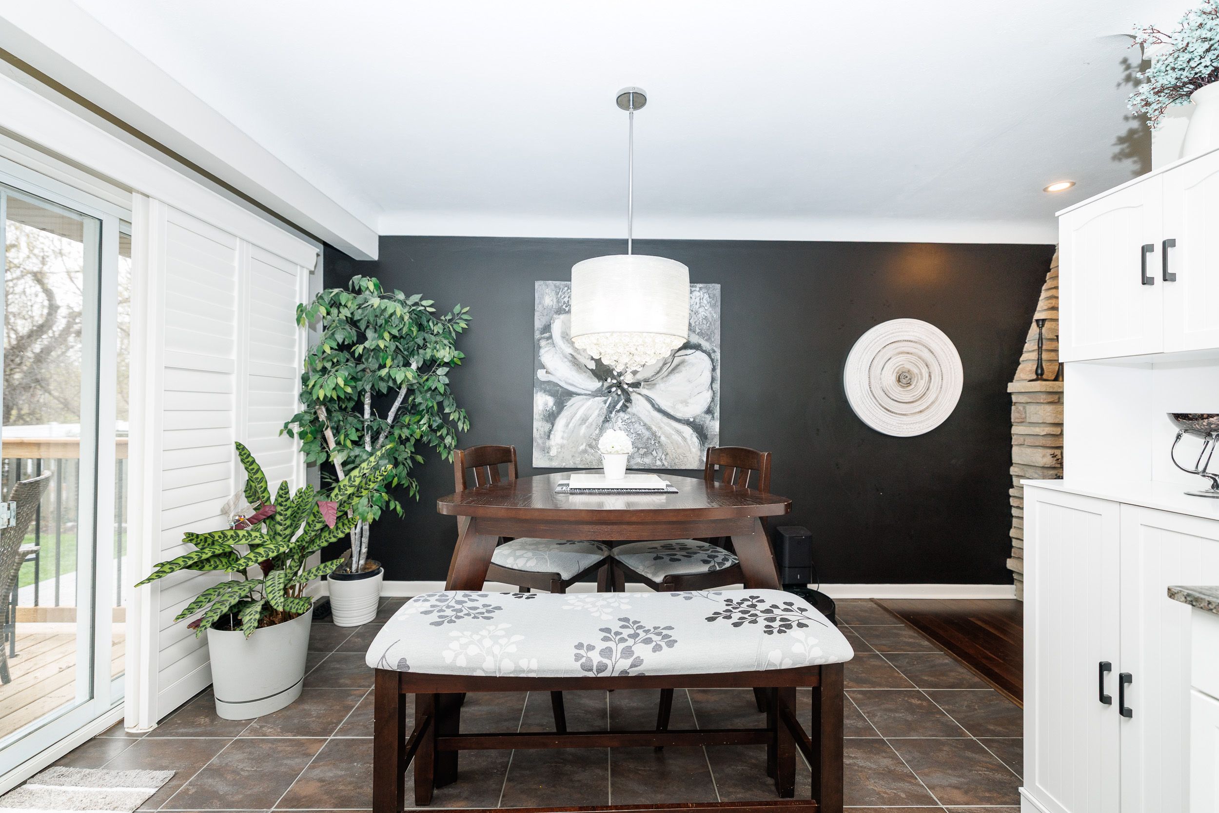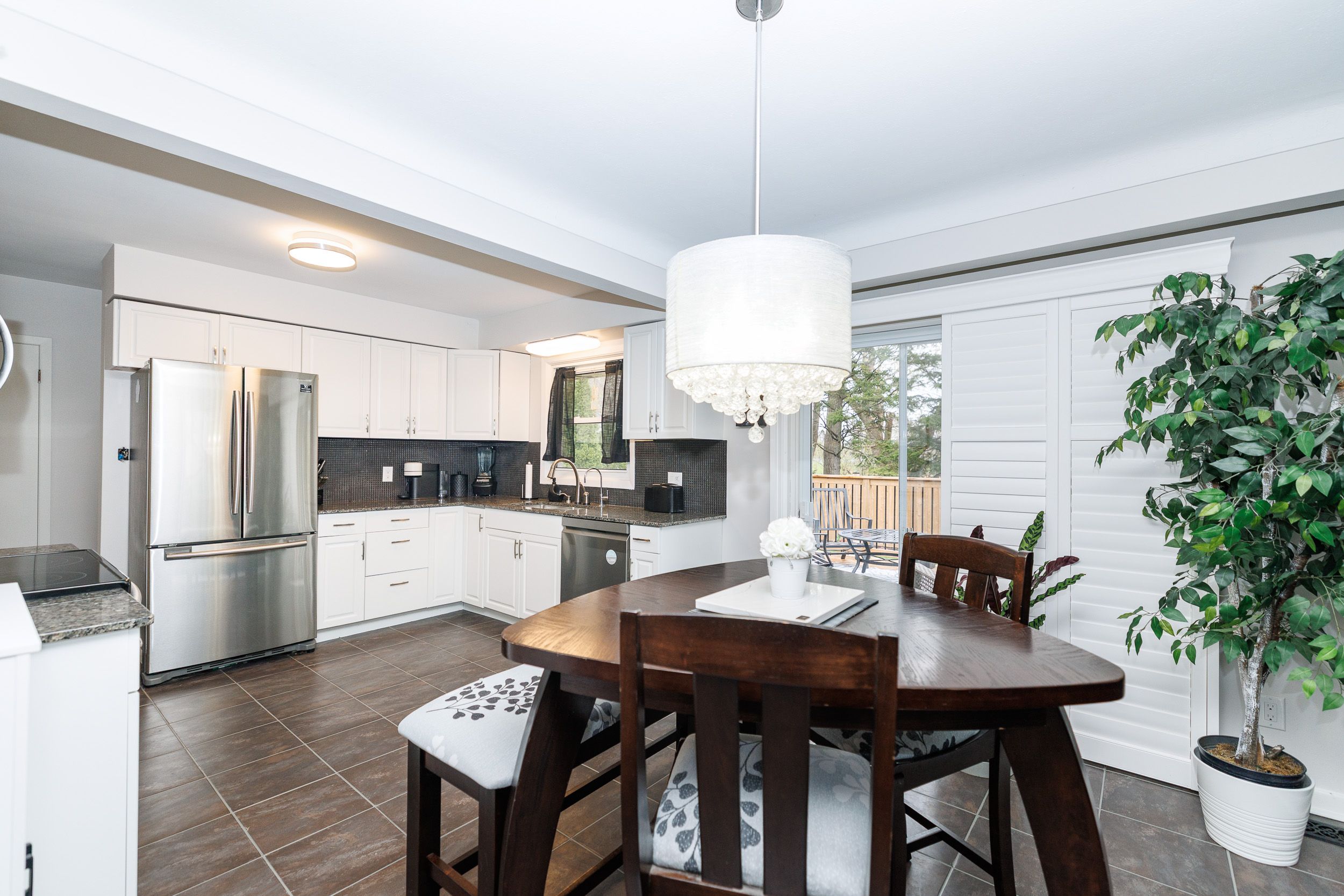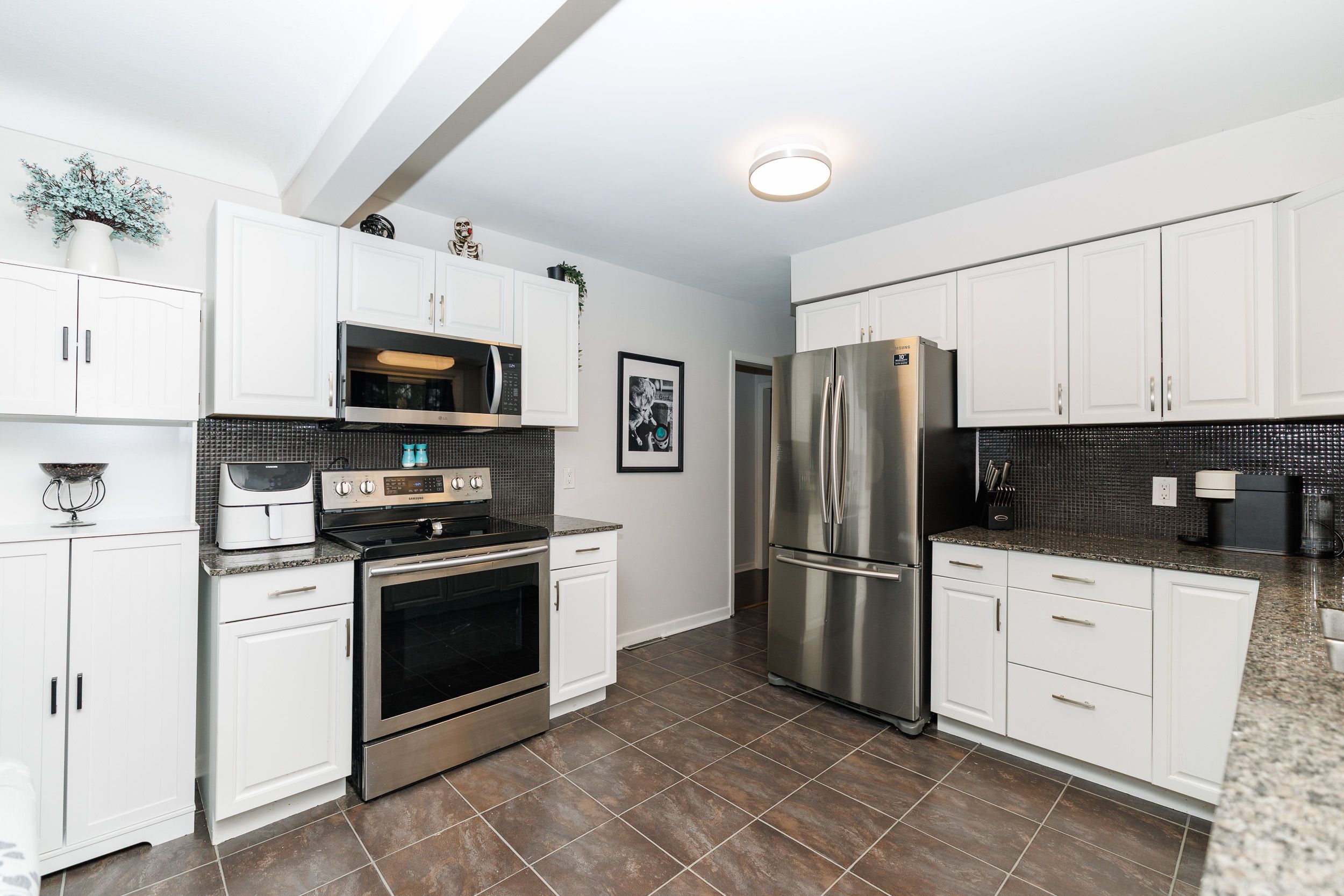 • Spacious eat-in kitchen equipped with stainless steel appliances and tile flooring.