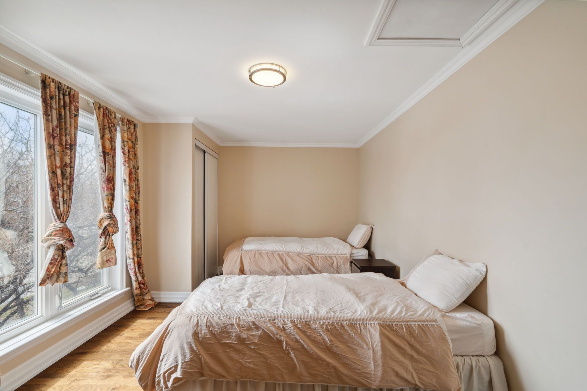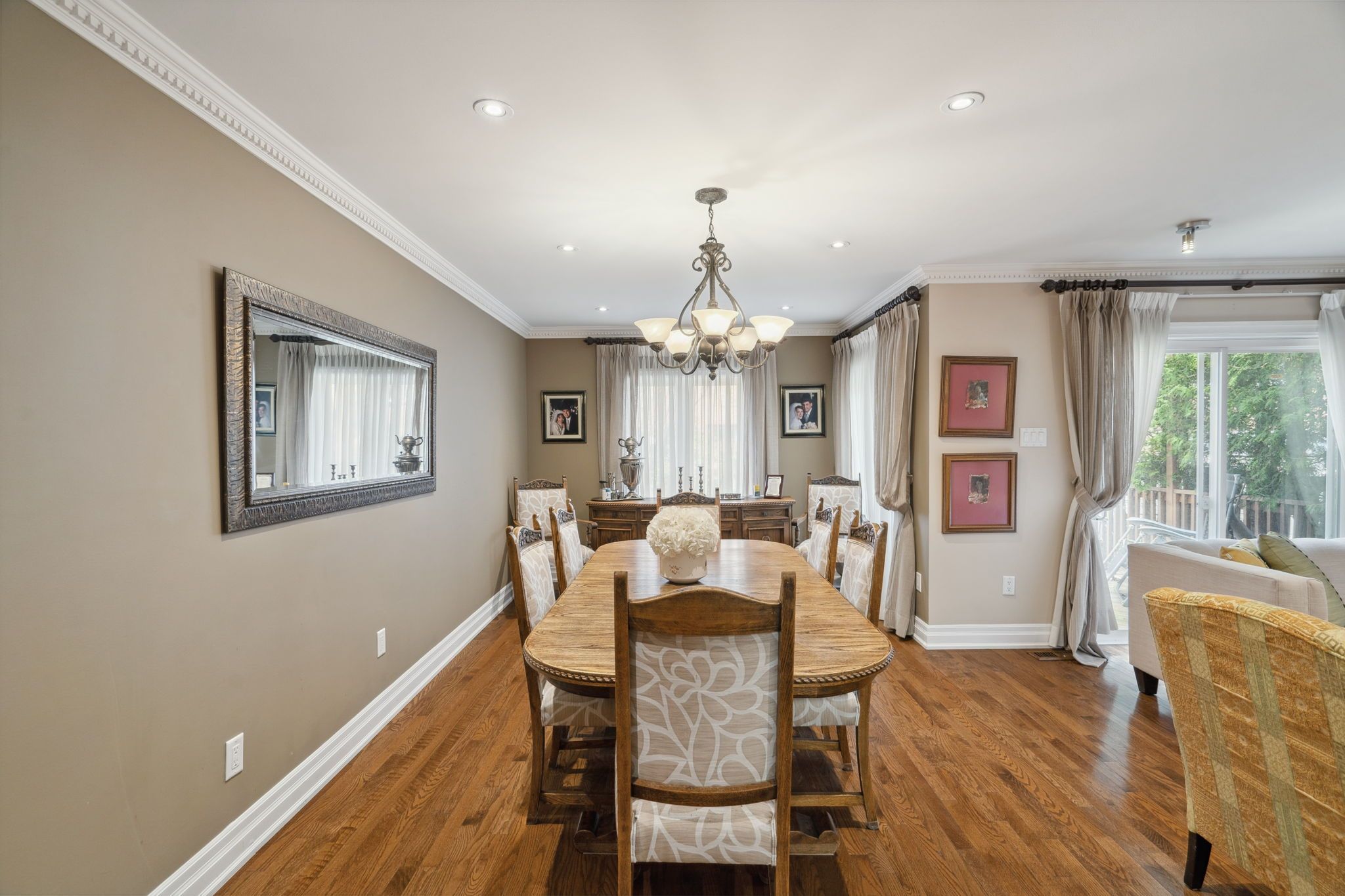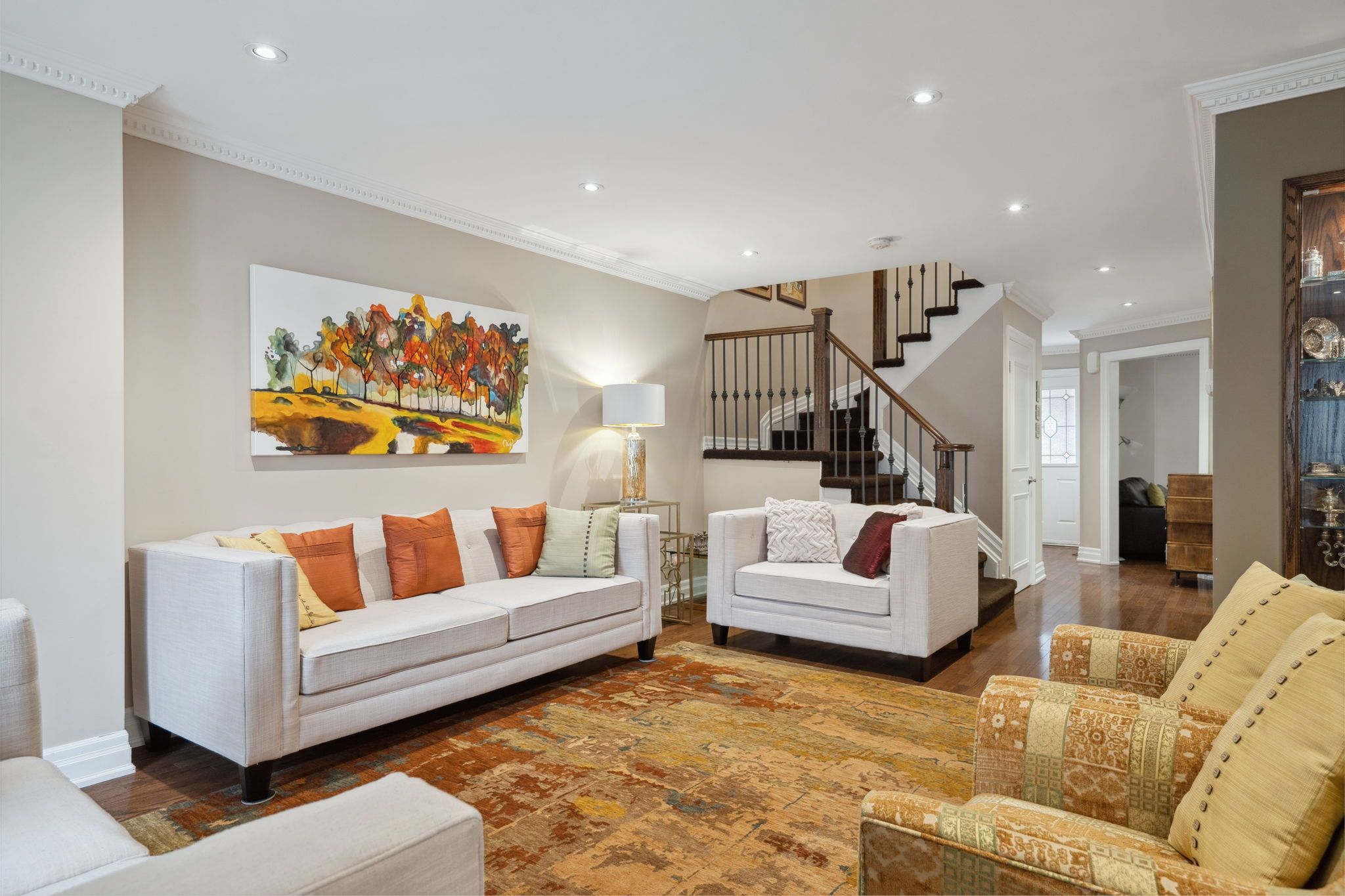 • Spacious living area with hardwood floors and modern pot lights.
