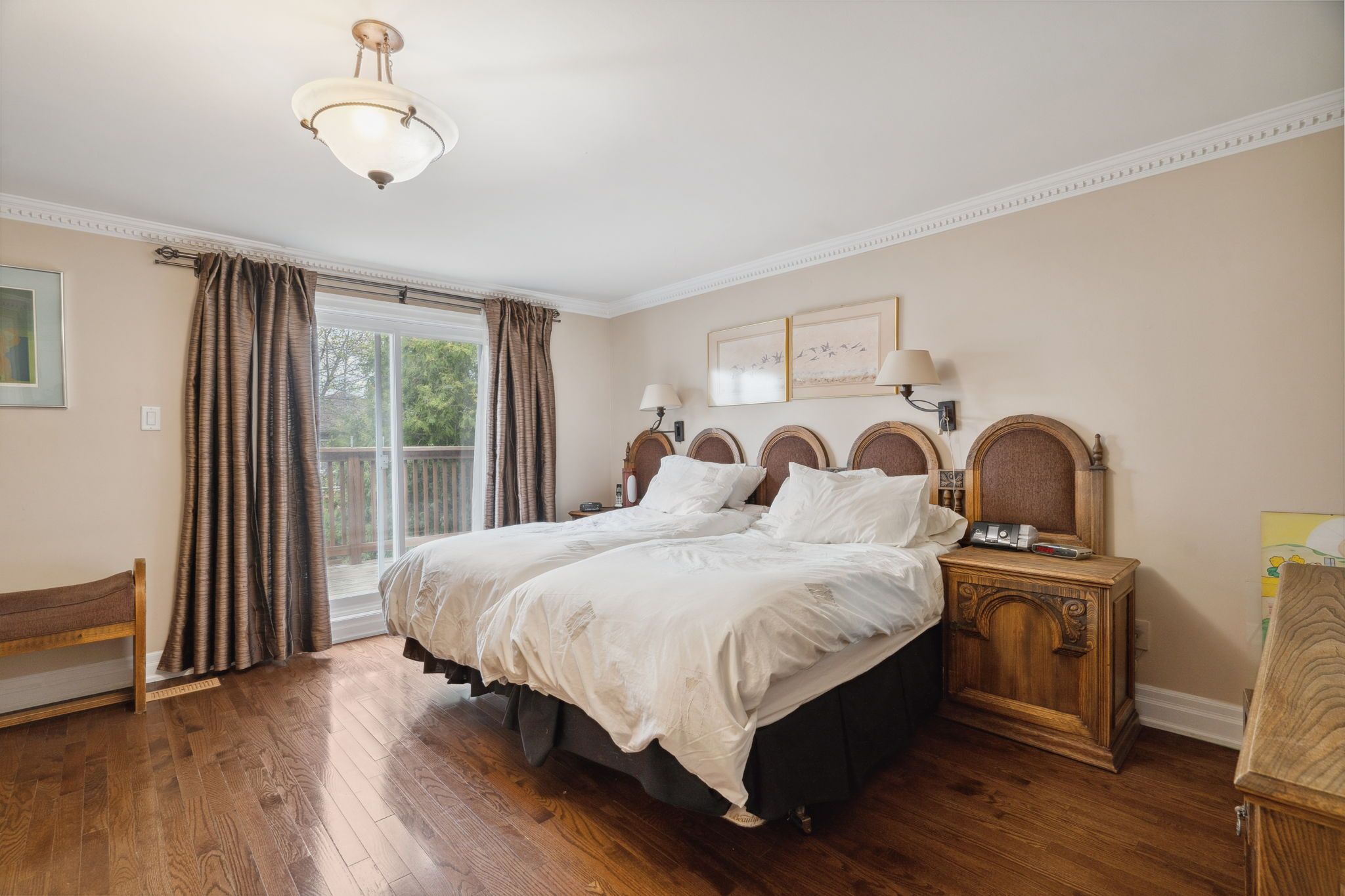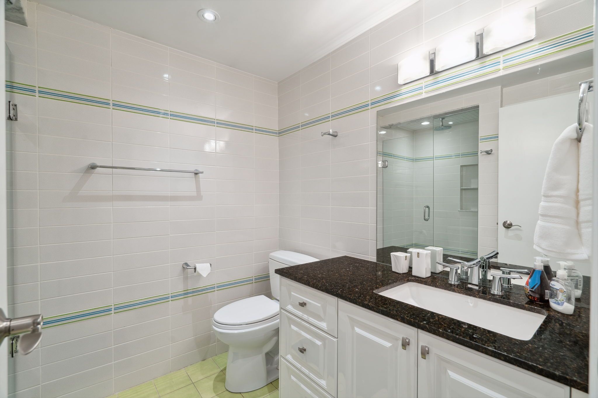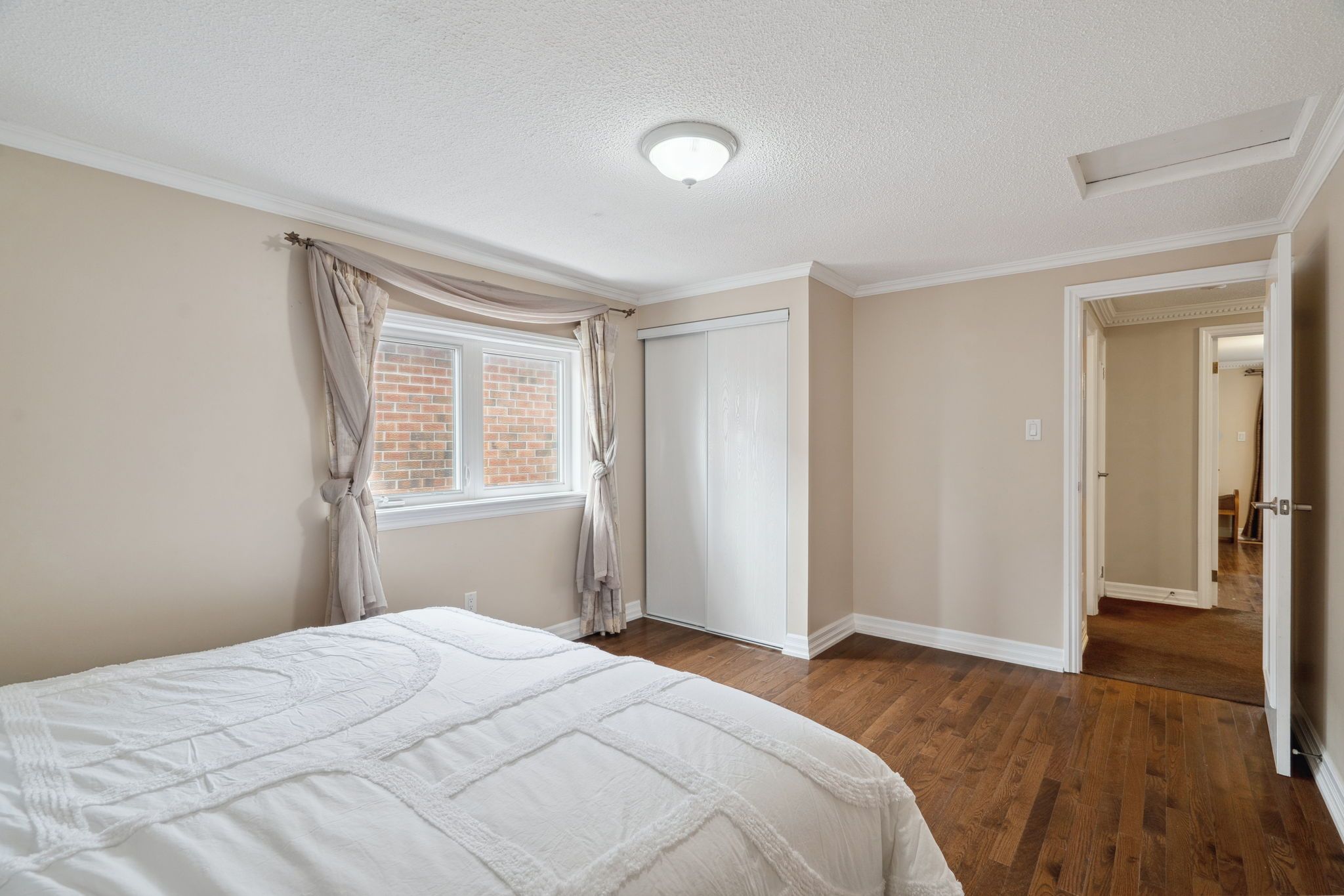 • Spacious living area with hardwood floors and modern pot lights.