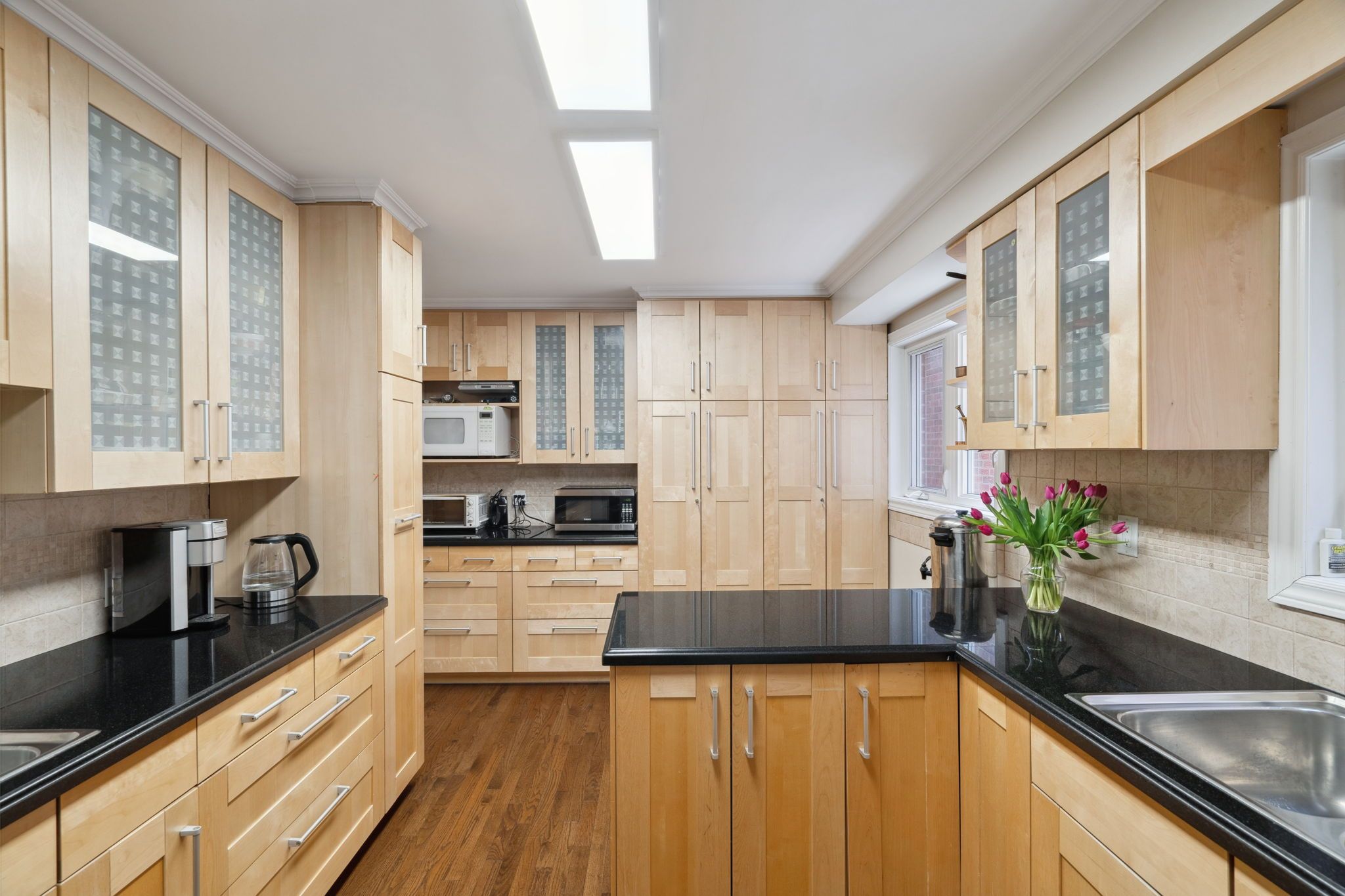 • Beautiful kosher kitchen featuring stainless steel appliances and granite countertops.
