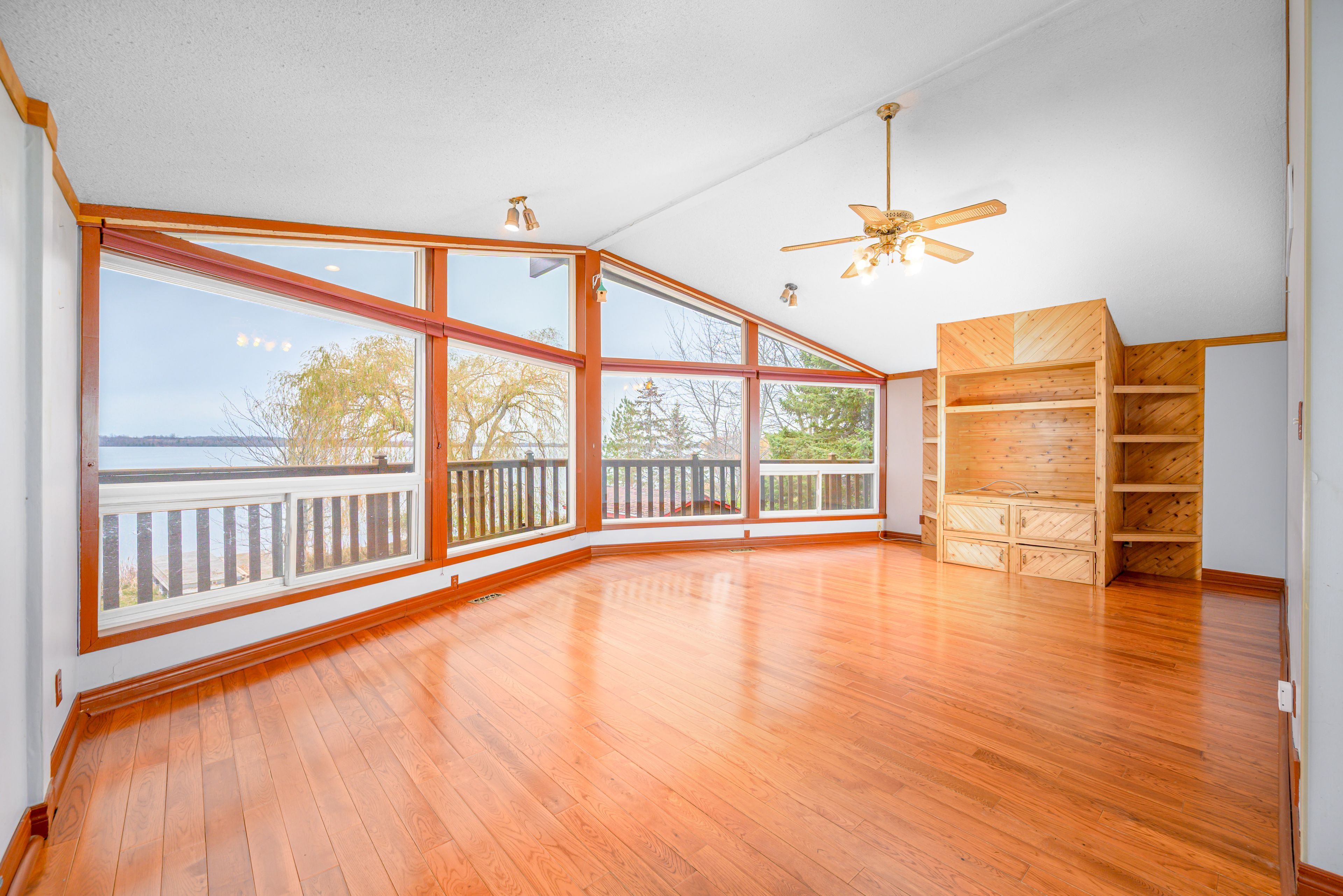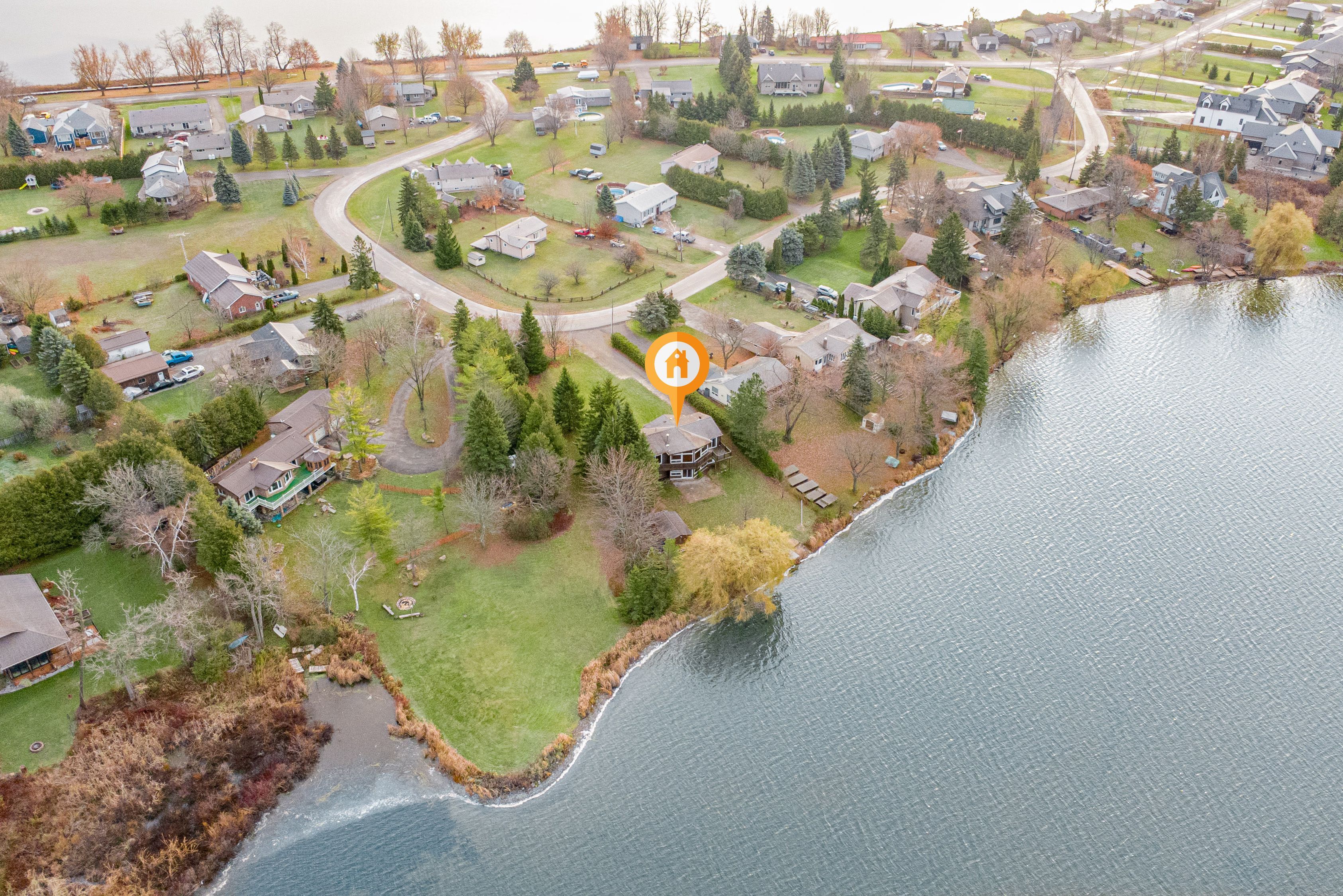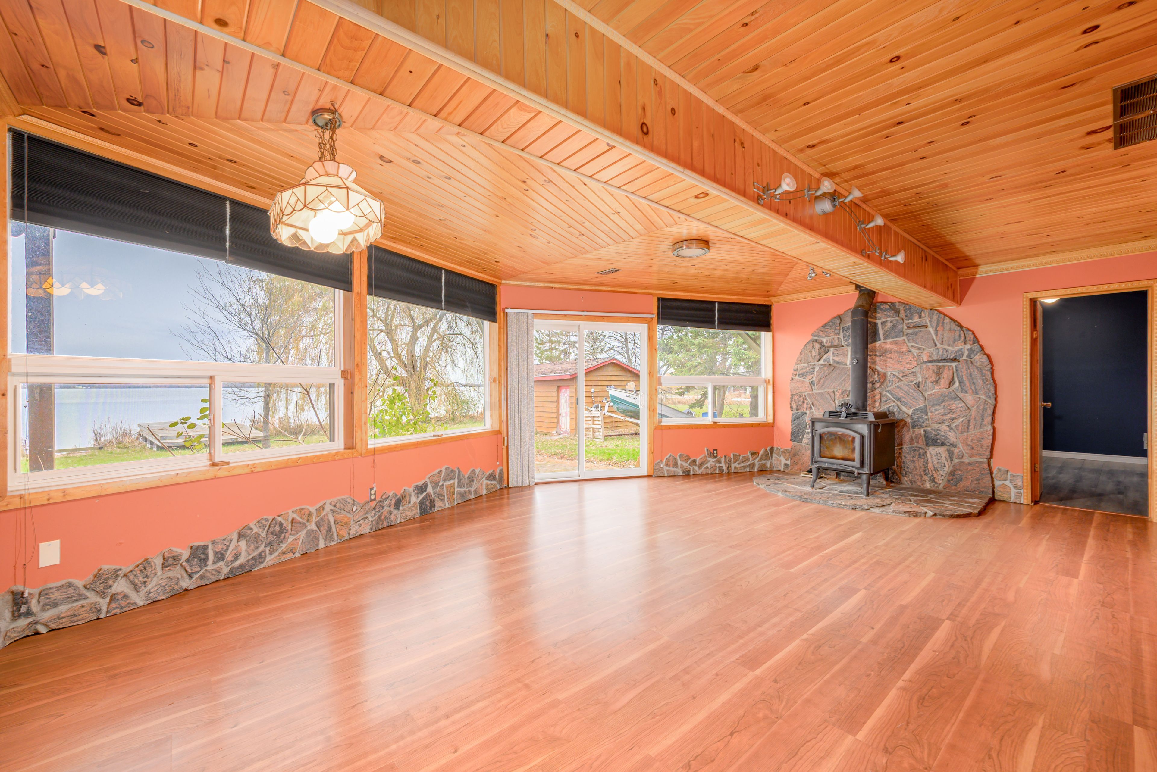 • Custom built bungalow with cathedral ceilings and large lakeside windows.
