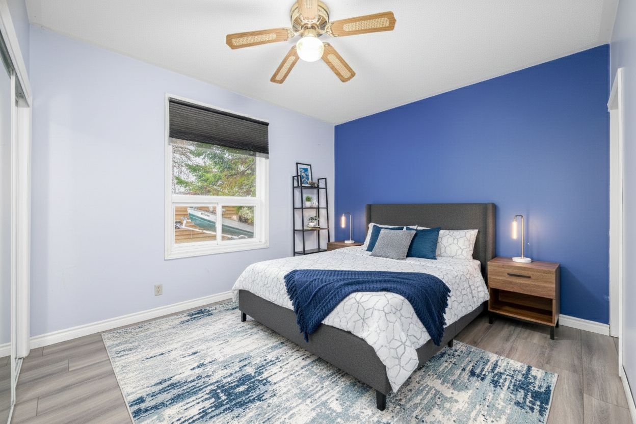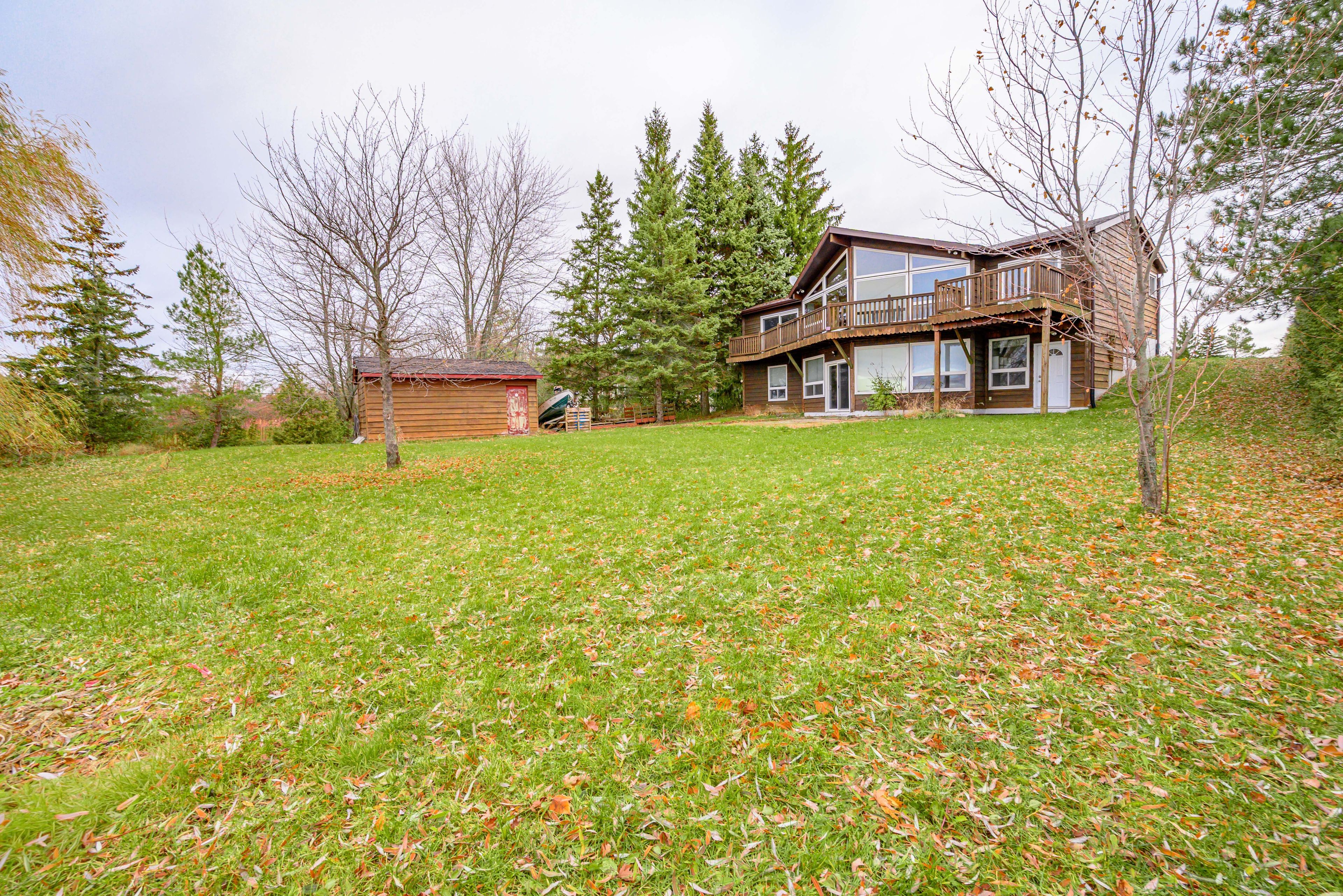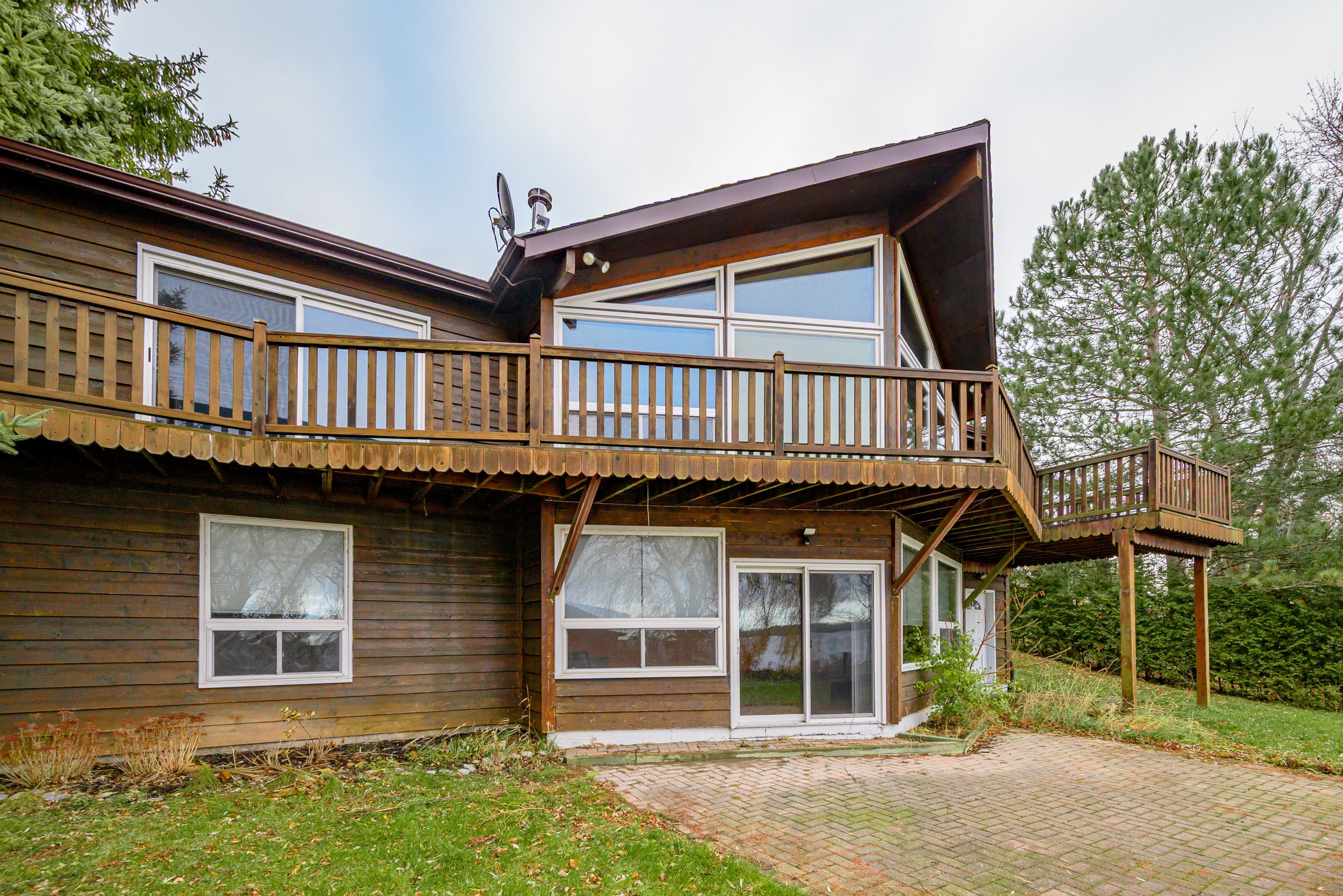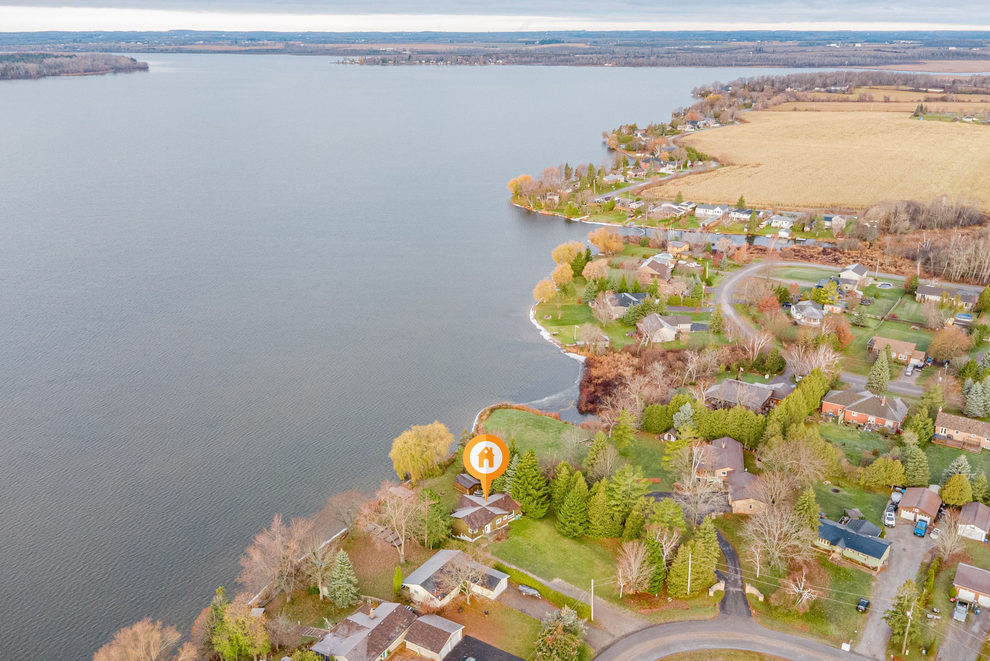 • Custom built bungalow with cathedral ceilings and large lakeside windows.