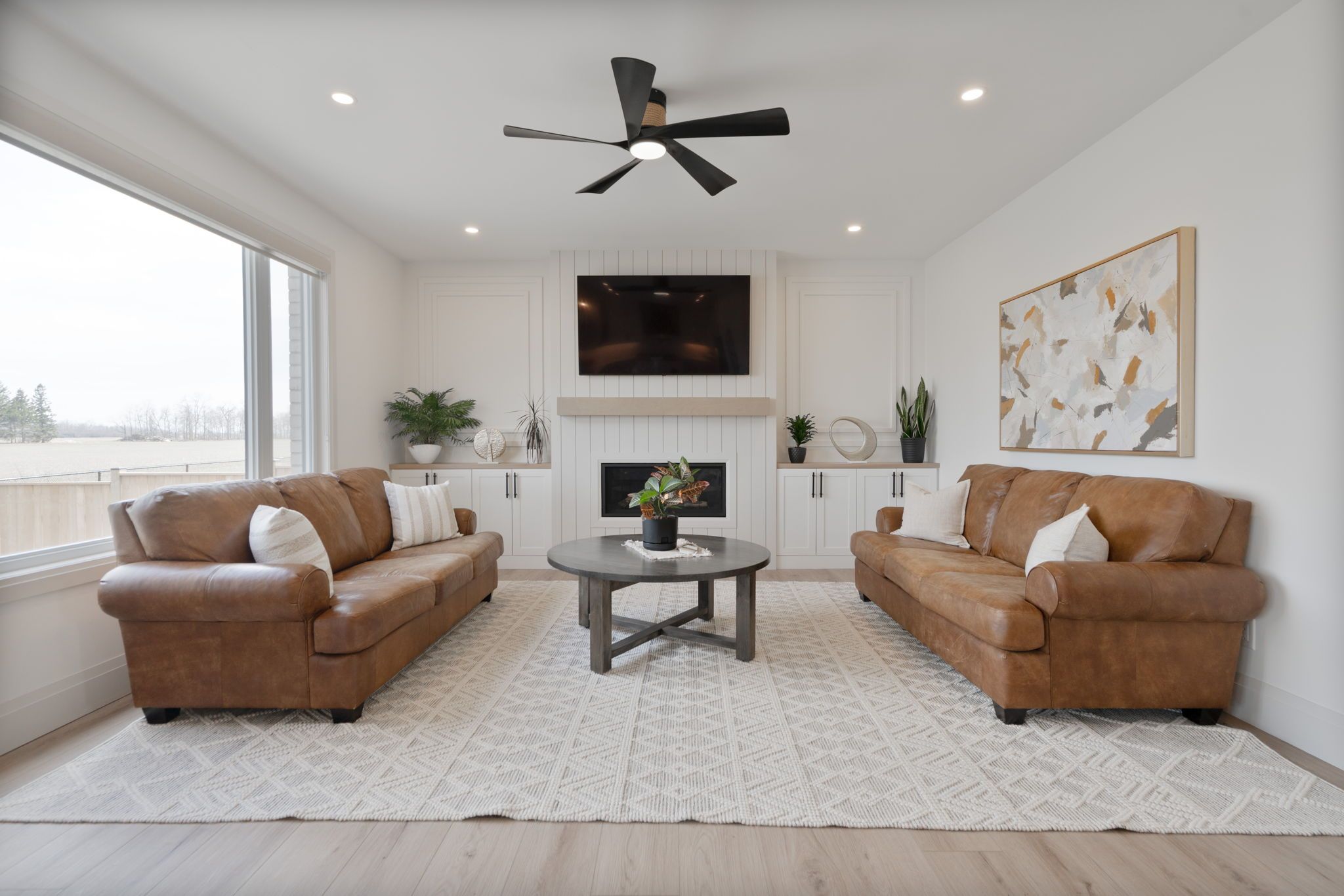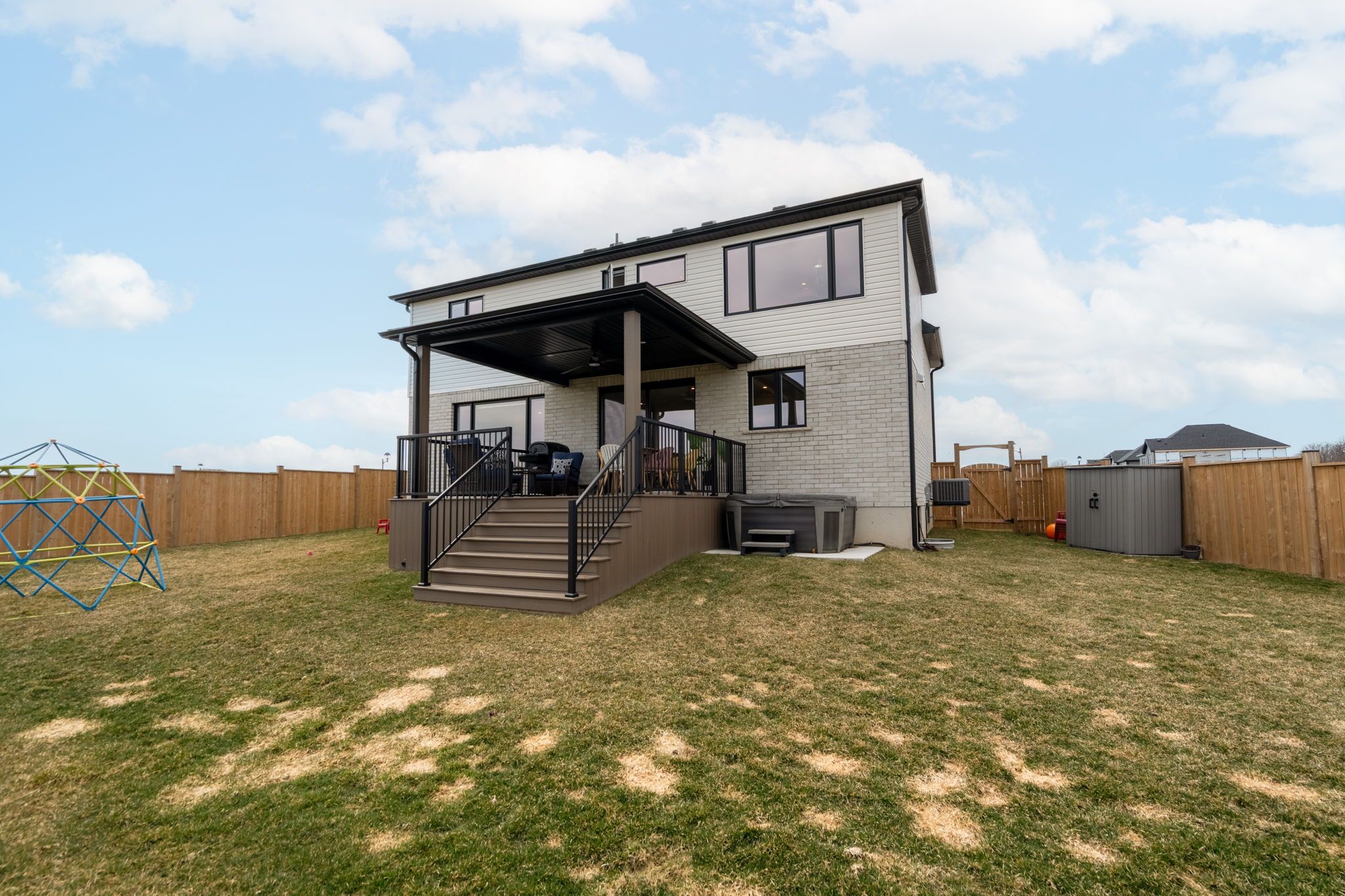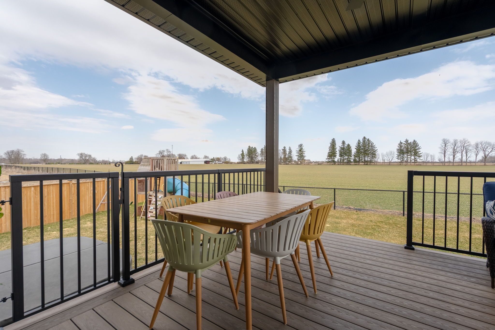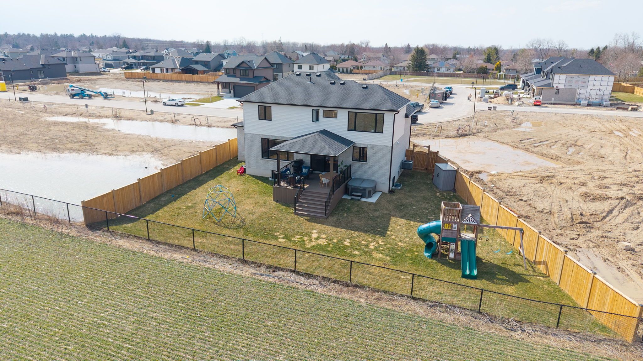 Welcome to 24 postma crescent in ailsa craig-an impressive 5-bedroom, 4-bathroom home loaded with high-end upgrades and backing onto open farmland on a premium pie-shaped lot. The main floor features 9' ceilings, oversized windows, 8' doors, and a stunning office with 14' ceilings, custom wainscotting, built-ins, and motorized window coverings. The custom kitchen is a true showpiece with ceiling-height cabinetry, a stained maple island, custom hood vent, kitchenaid appliances including a gas stove, pot filler, and a fully finished walk-in pantry with quartz counters and appliance garage. The living room offers a 42" linear gas fireplace with custom shiplap detail, and accent wall. Functional design continues with a fully customized mudroom and laundry room featuring floor-to-ceiling cabinetry, sink, and quartz folding space. Upstairs, enjoy spacious bedrooms with blackout blinds and a luxurious primary suite complete with a custom walk-in closet and ensuite with heated tile floors and a tiled shower. The finished basement includes a fifth bedroom with walk-in closet, cold cellar, and bar rough-in. Additional highlights include upgraded vinyl flooring, premium paint, custom window coverings, heated bathroom floors, ecobee thermostat, sump pump alarm, and an extra-deep 26' heated, insulated garage. Outside, relax on the covered composite deck with bbq gas line in a fully fenced yard. A perfect blend of luxury, function, and privacy in a growing community.