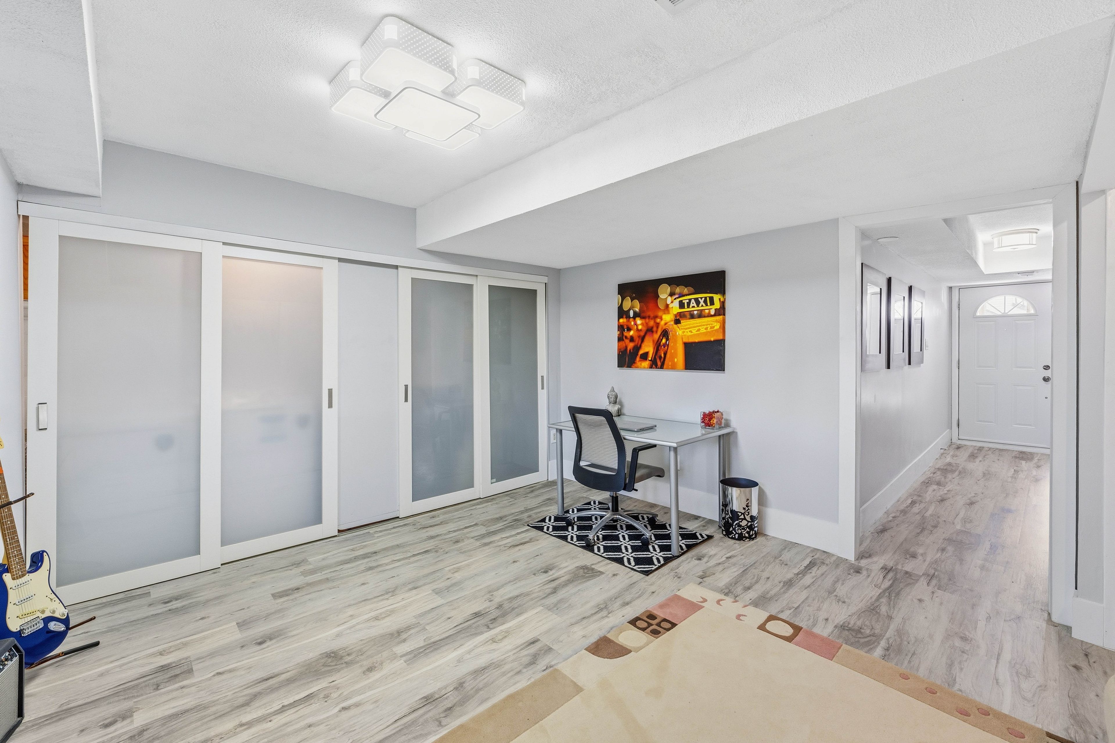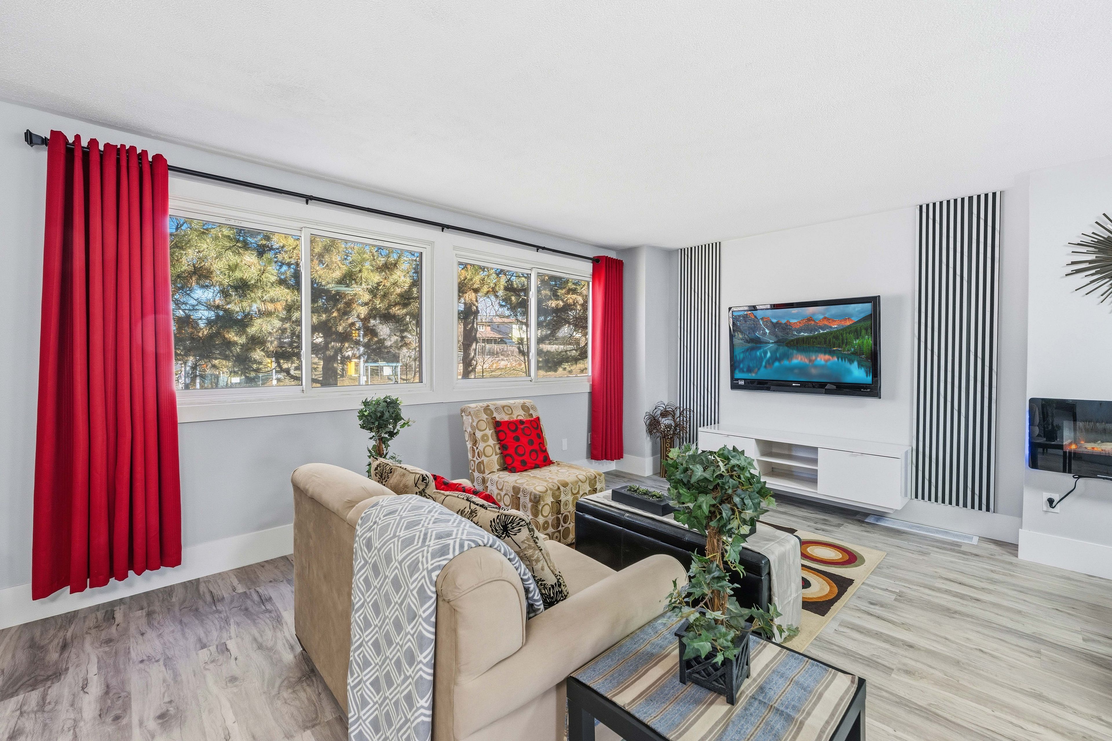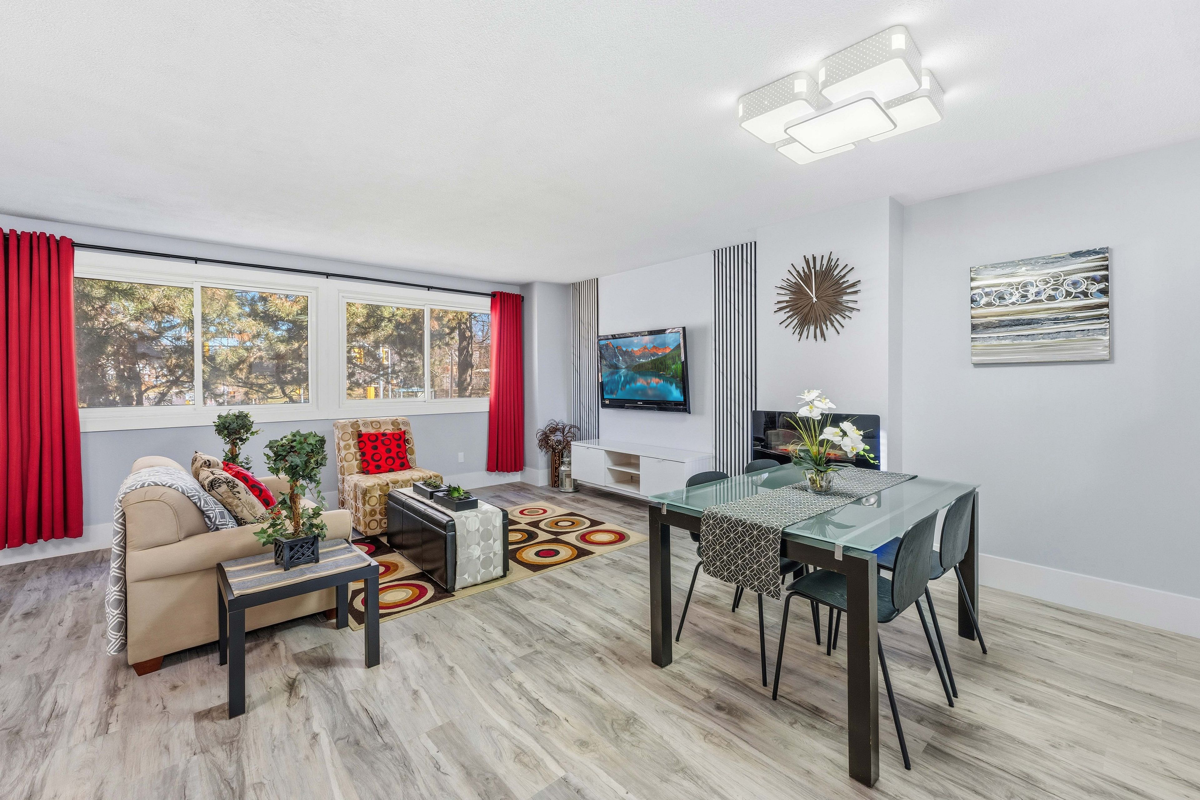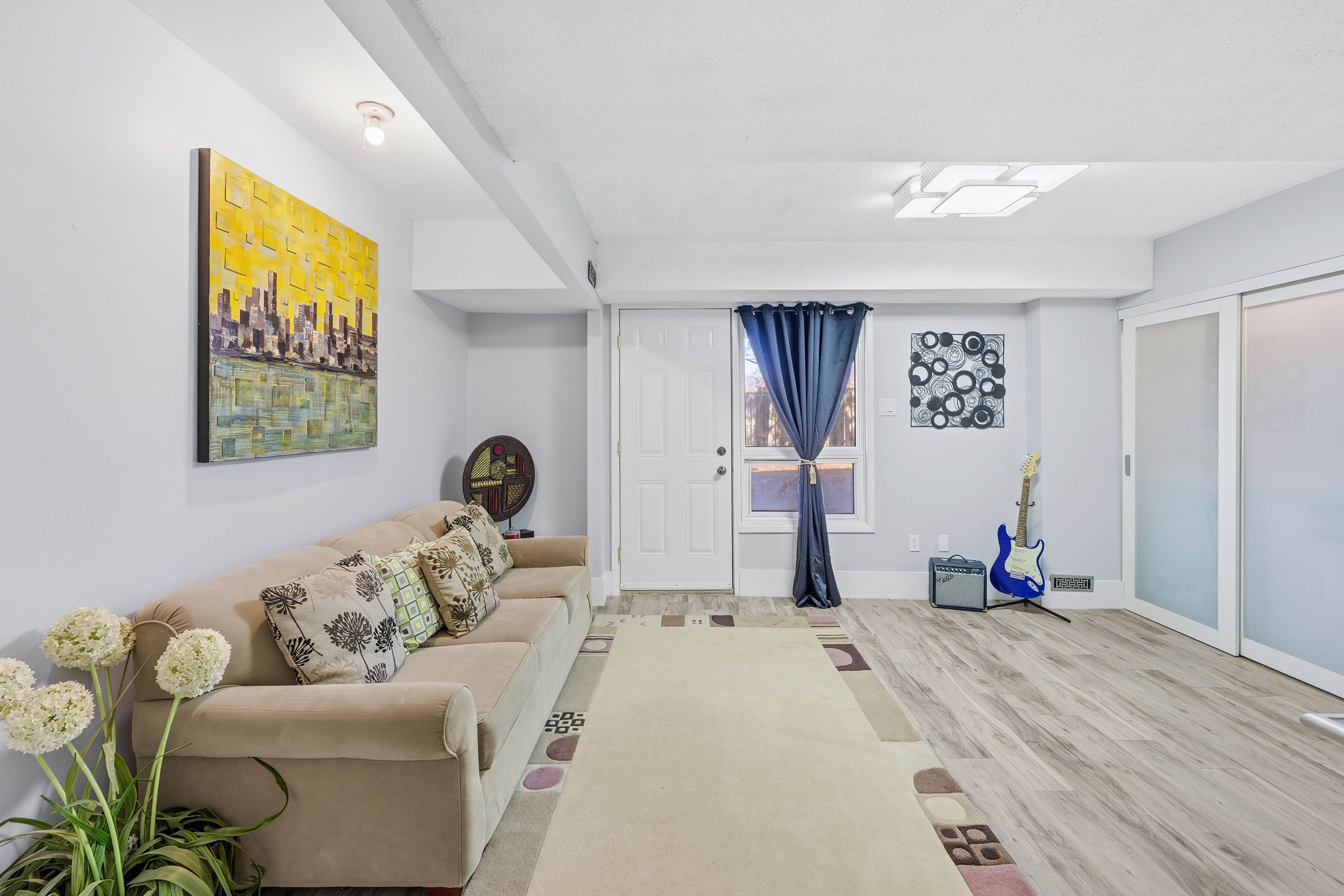 • Bright open-concept layout with a modern kitchen and quartz counters.