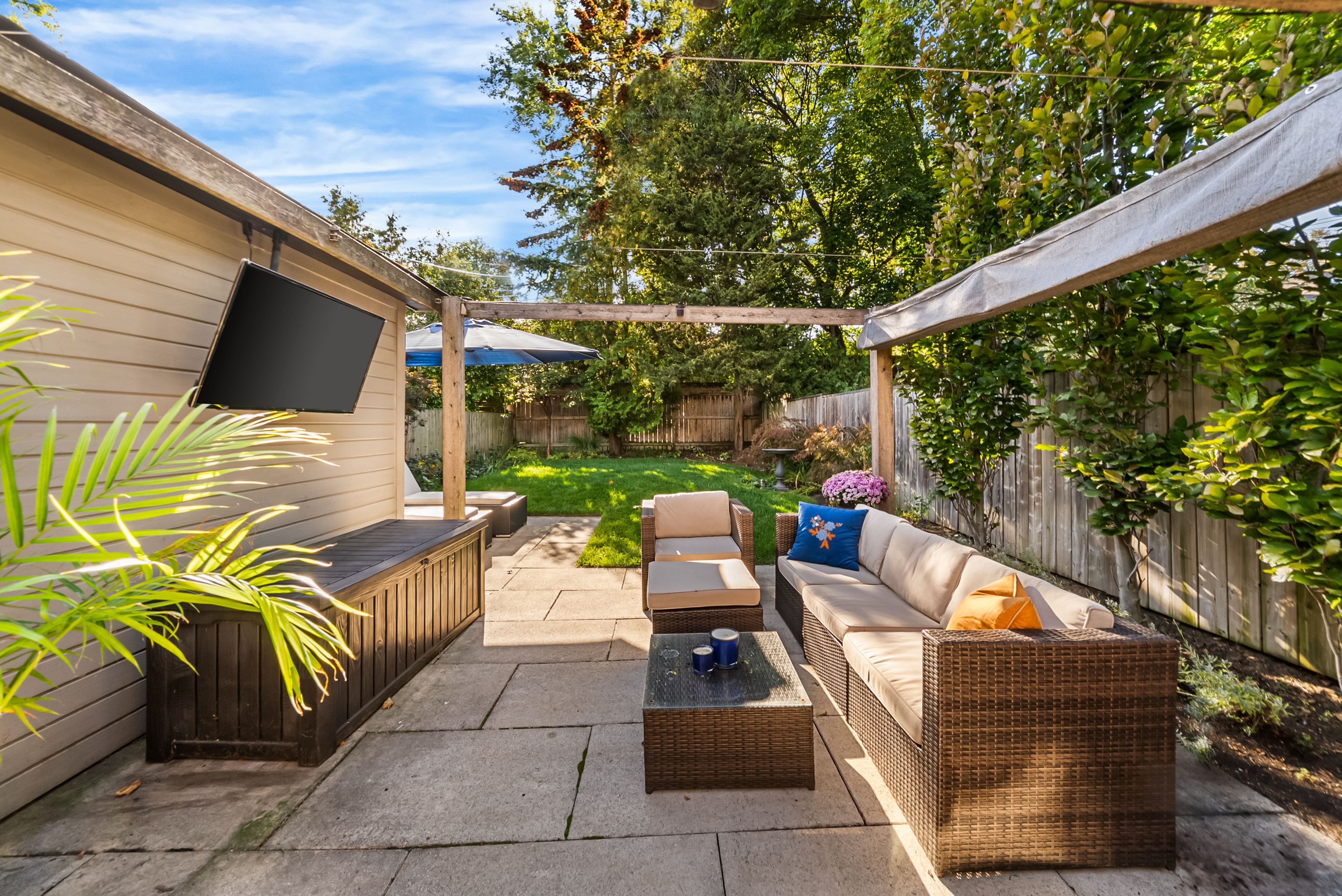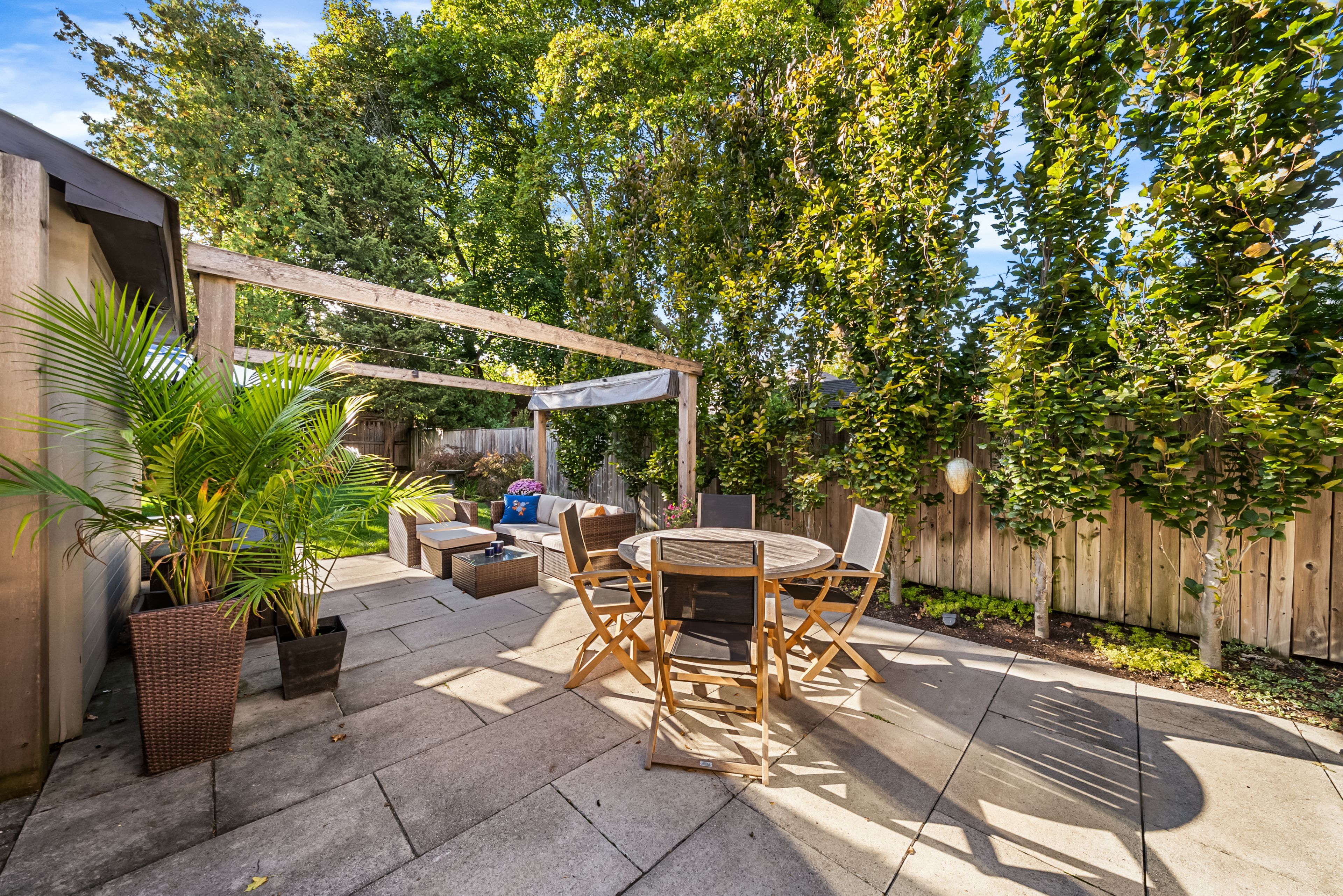 • Landscaped backyard oasis with stone patio, perfect for outdoor gatherings.