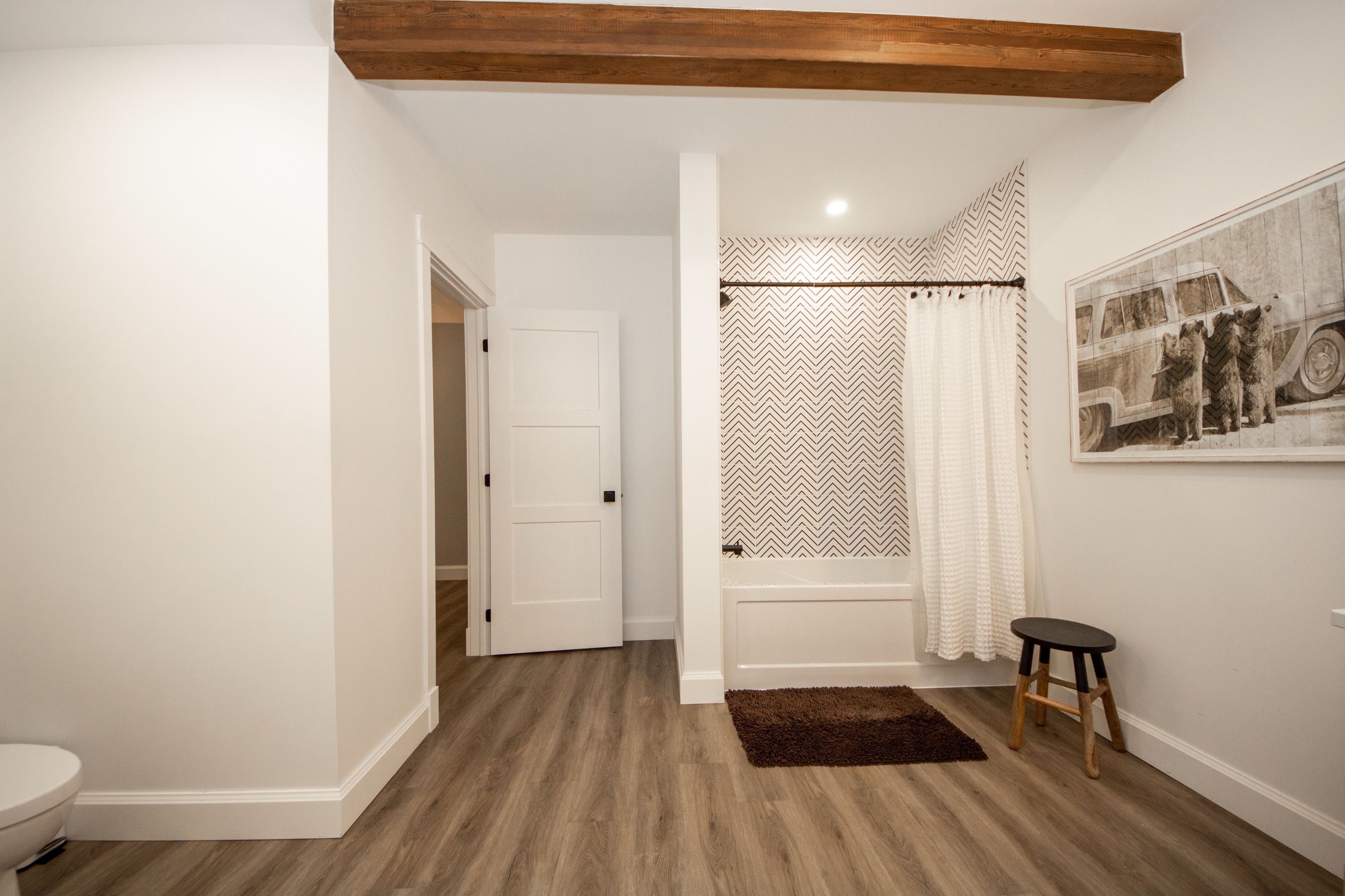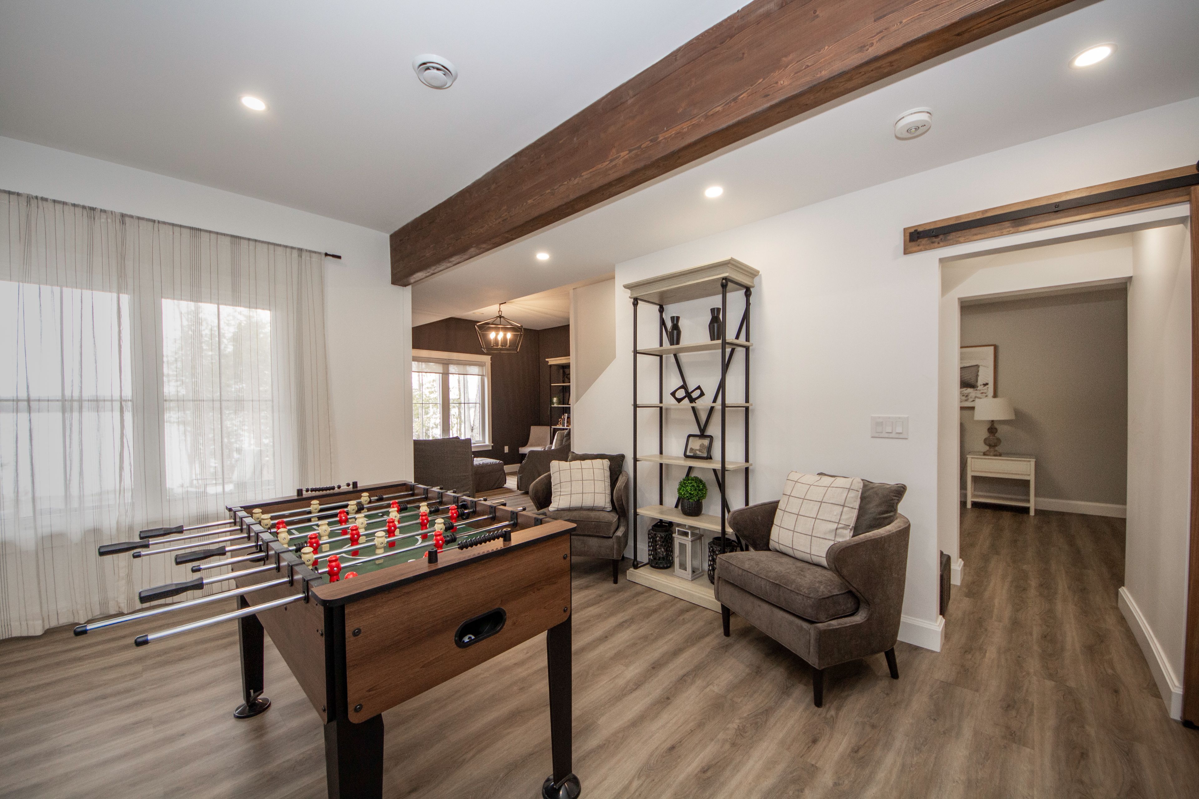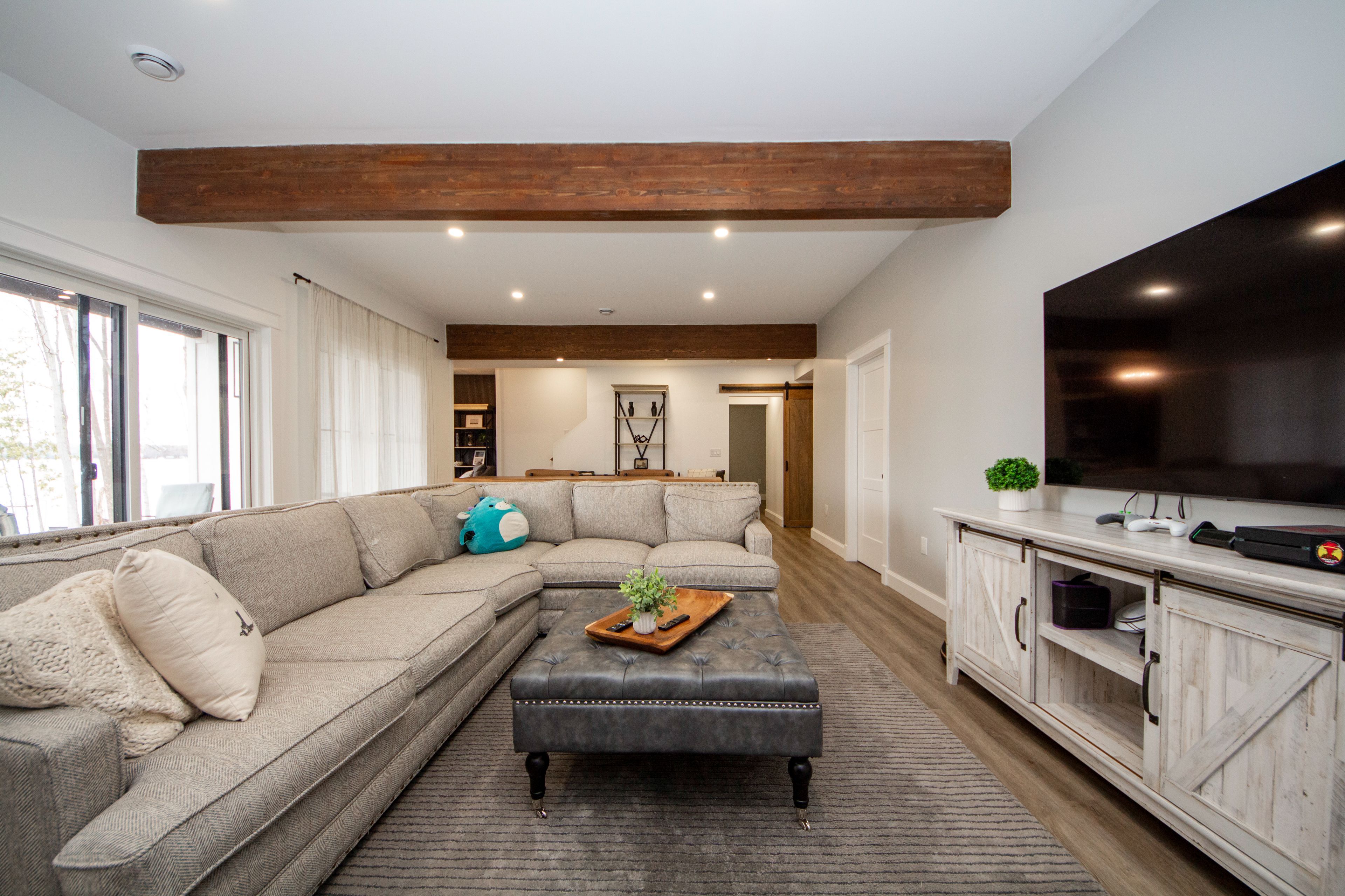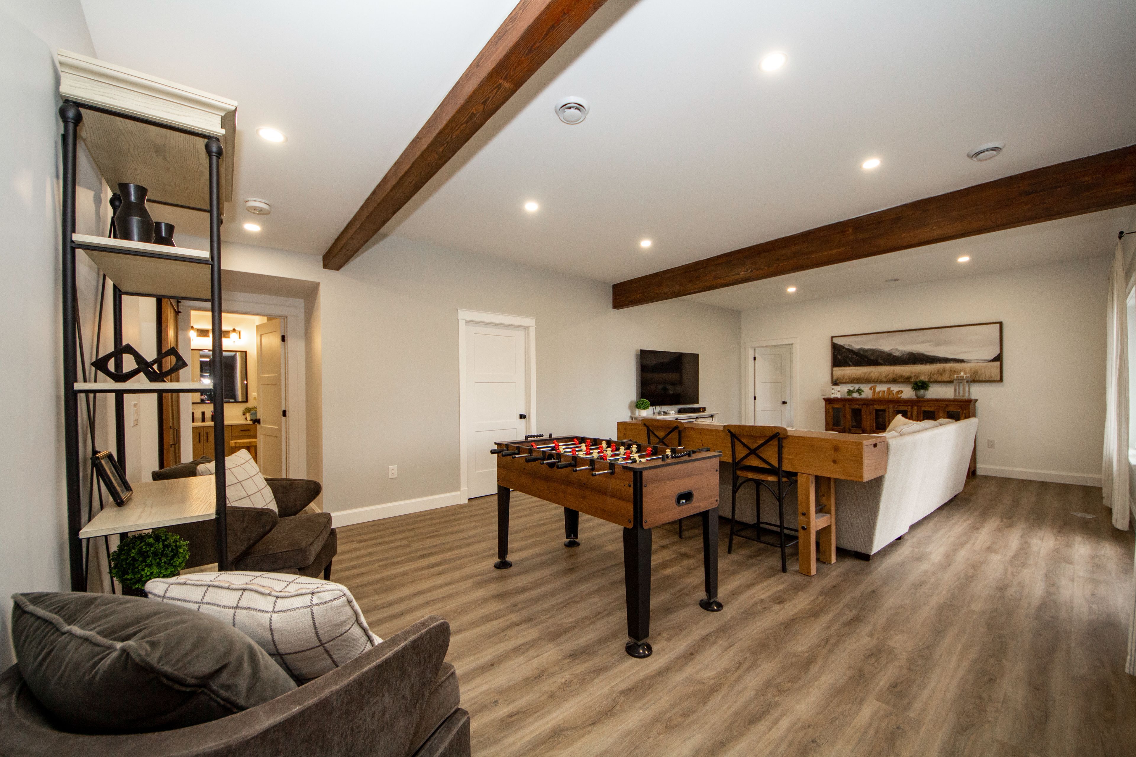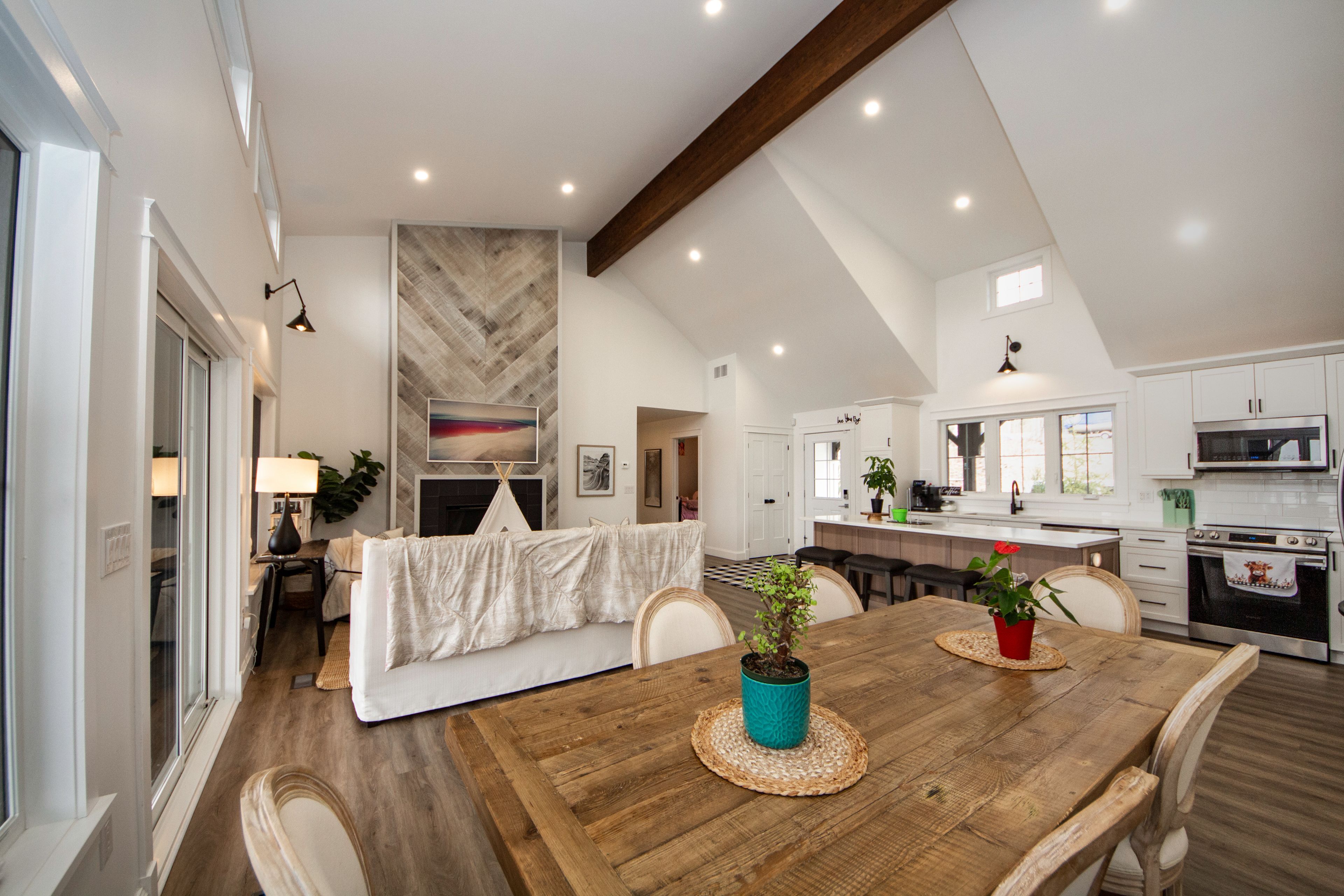 • Vaulted ceilings and exposed wood beams add charm and character.