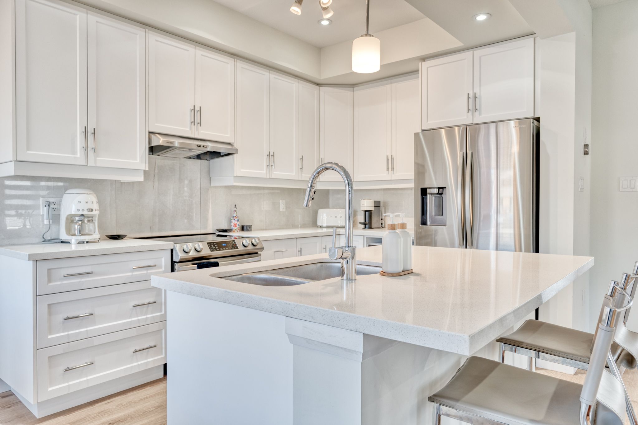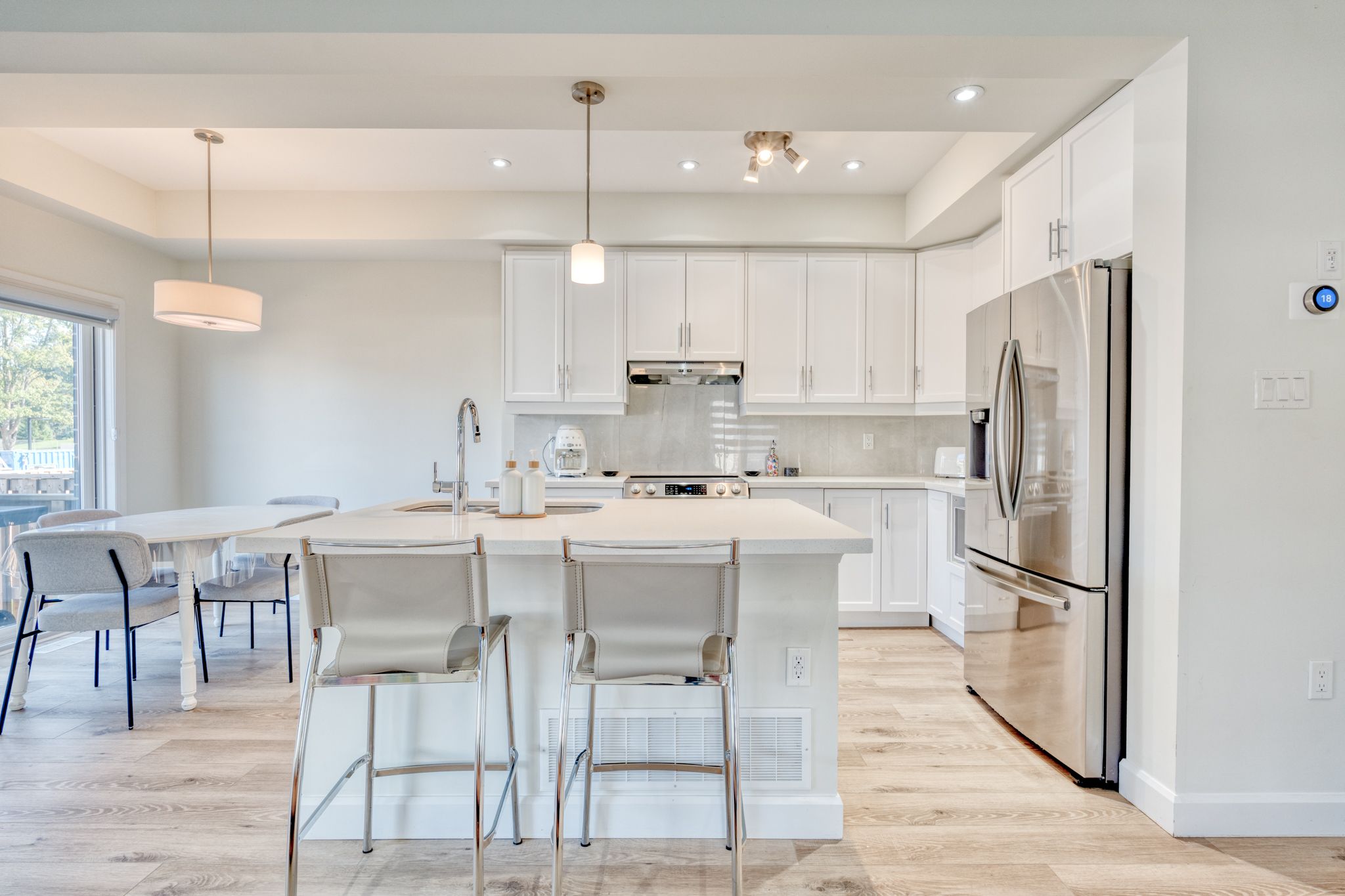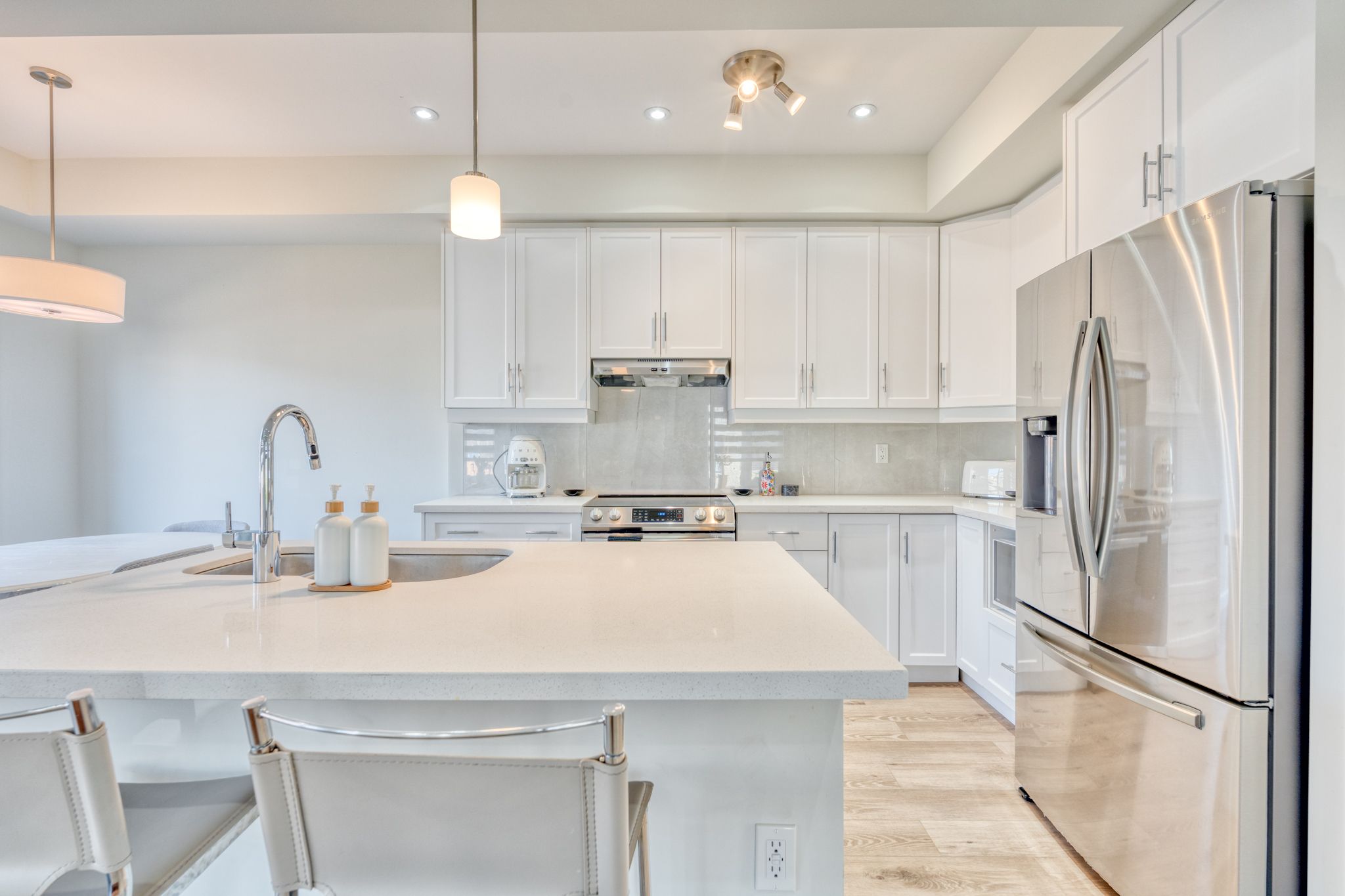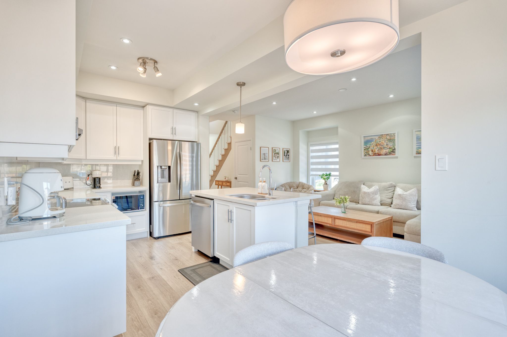 • Open-concept kitchen with quartz countertops and stainless steel appliances.