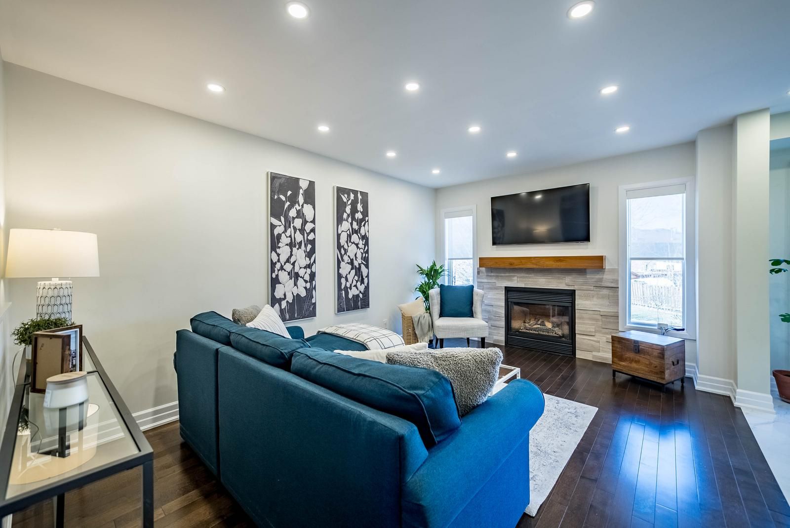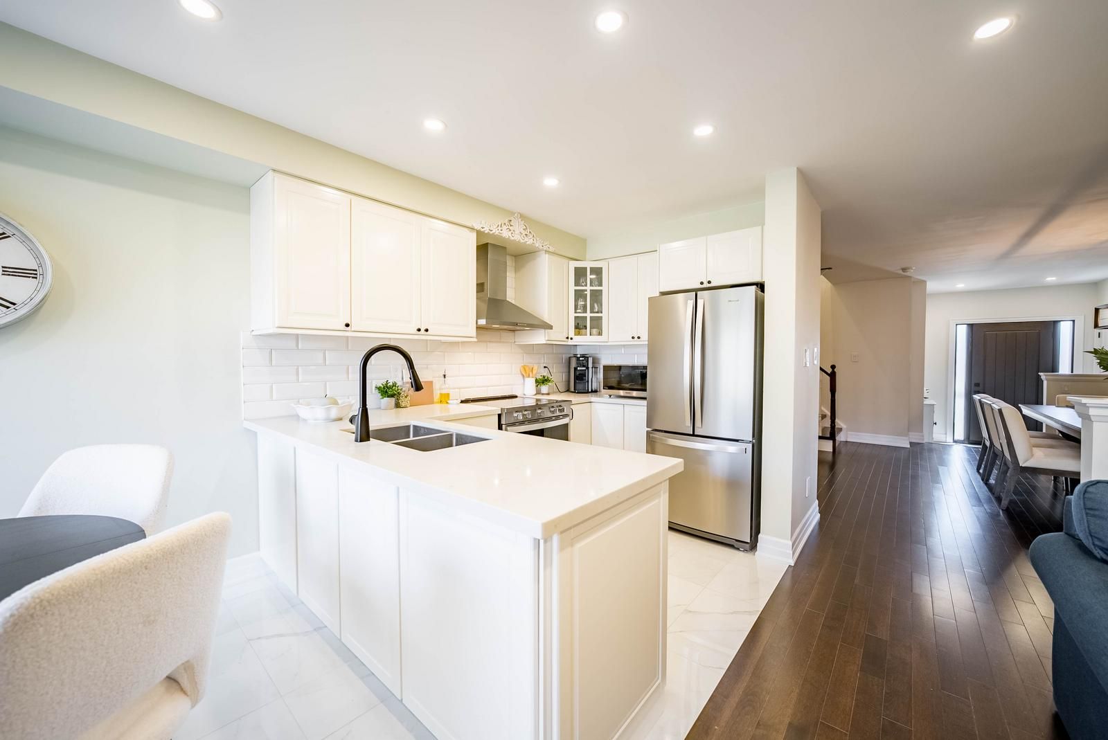 24 willoway is a beautifully renovated freehold townhome in a highly sought-after, family-friendly neighbourhood. The main level has solid birch hardwood flooring, smooth ceilings, modern lighting, and pot lights throughout. A formal dining area flows into the inviting family room, anchored by a gas fireplace with a stone surround and flanked by large windows that fill the space with natural light. The kitchen has bright cabinetry with custom hardware, stainless steel appliances, quartz countertops, and a tiled backsplash. An eat-in area offers seamless access to the backyard through sliding doors, ideal for both everyday living and entertaining. Upstairs, three generously sizebedrooms, all finished with the same birch hardwood flooring, and pot lighting throughout. The primary suite offers a comfortable retreat, complete with a spacious walk-in closet featuring custom organizers and a beautifully renovated 4-piece ensuite with a glass shower, custom vanity, and modern finishes. All bathrooms have been tastefully updated, and new interior doors and hardware. The finished basement provides exceptional additional living space, perfect for a recreation room, home office, gym, or play area. A newly updated 3-piece bathroom with a seamless glass shower enhances the functionality of this level. Ample storage options further add to the home's practicality. A rare 133-foot deep backyard - is an outstanding feature that sets this property apart. With a lower deck for entertaining, expansive green space for children and pets, and professionally completed grading and retaining wall. Located close to parks, trails, and within walking distance to top-rated schools including st. Brigid catholic school and harry bowes public school. Enjoy easy access to main street's shops, restaurants, and everyday amenities, as well as the nearby stouffville go station for convenient commuting.