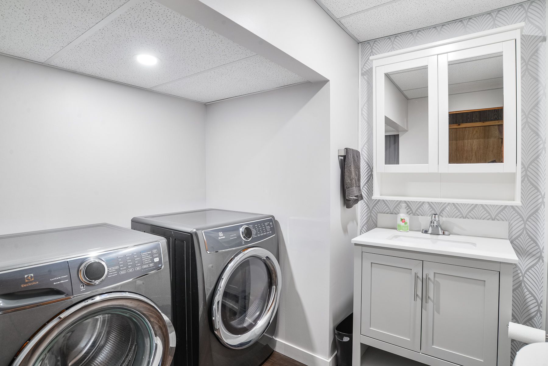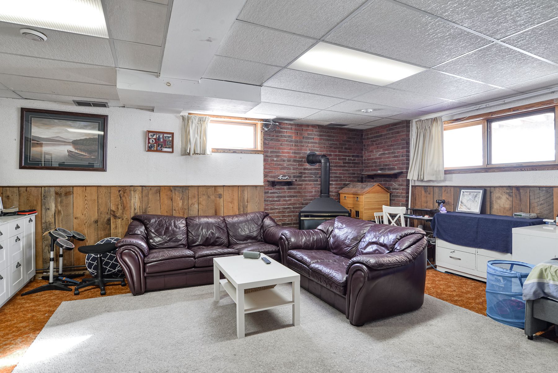 • Spacious lower level with rec room, gas fireplace, and two storage areas.