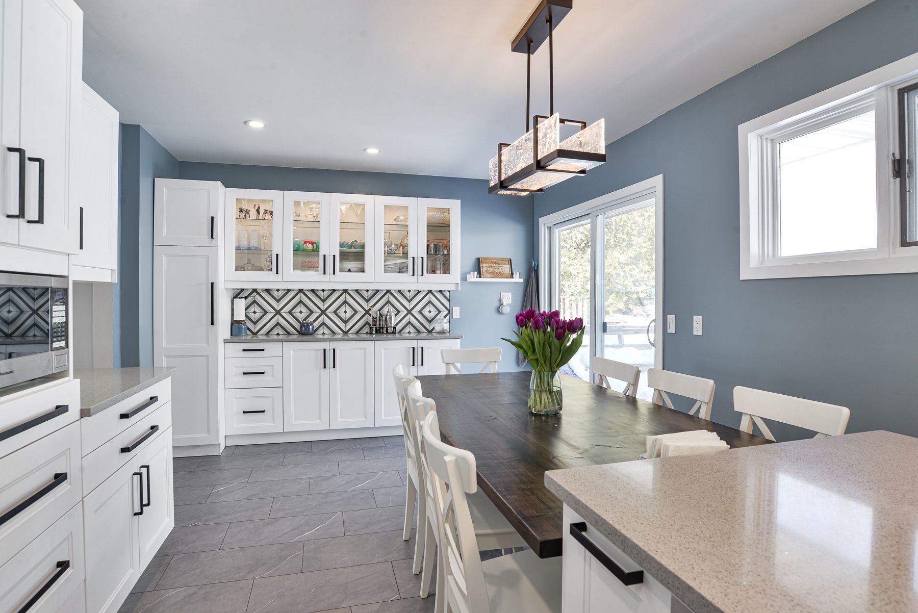 • Updated eat-in kitchen with walk-out to the back deck and pergola.