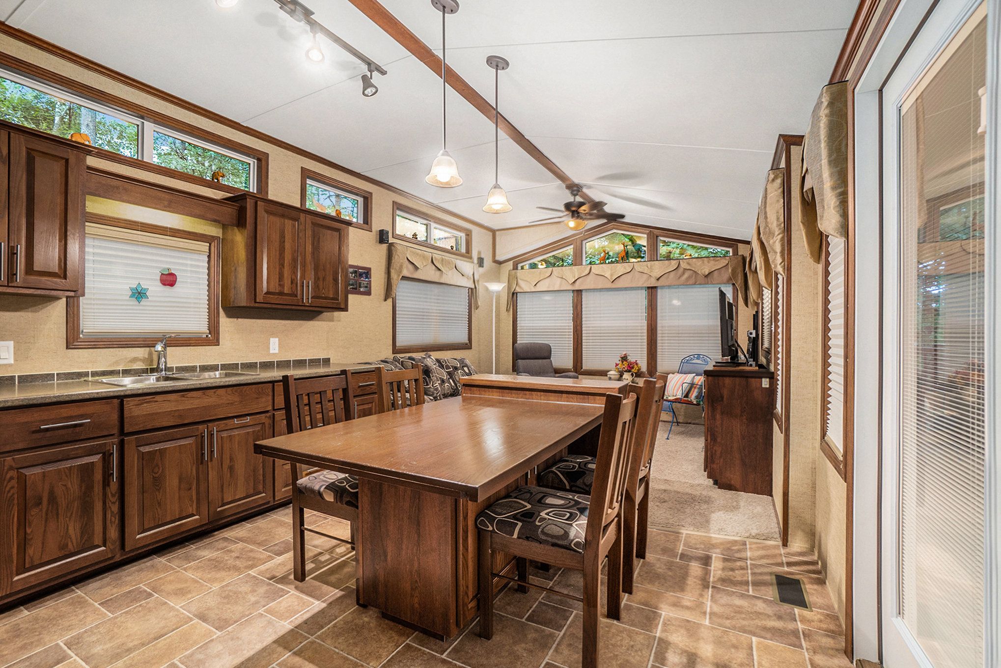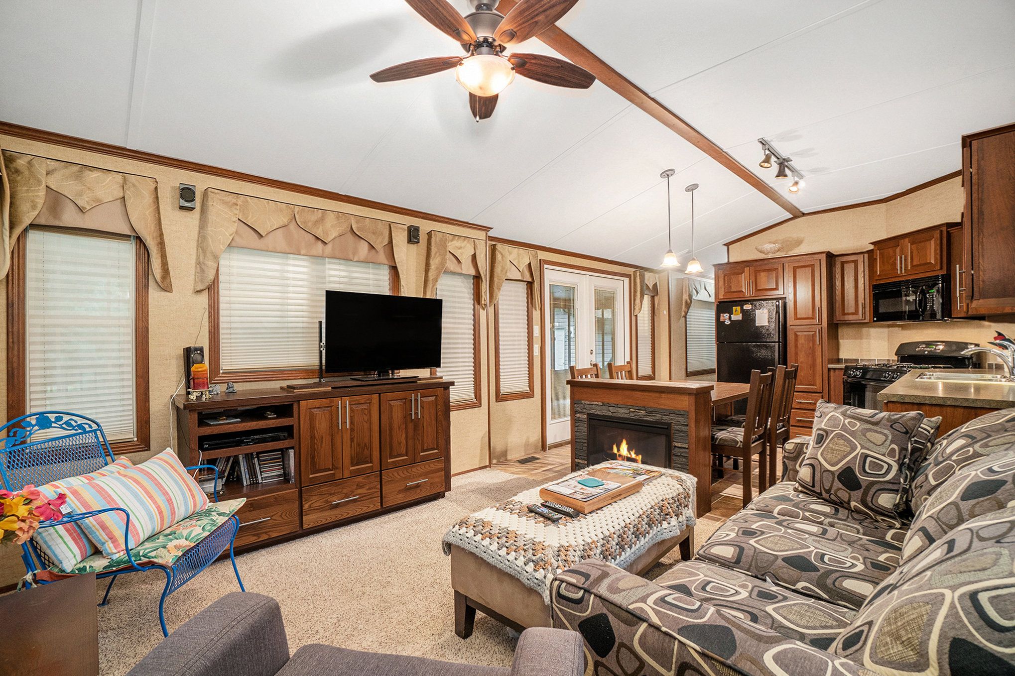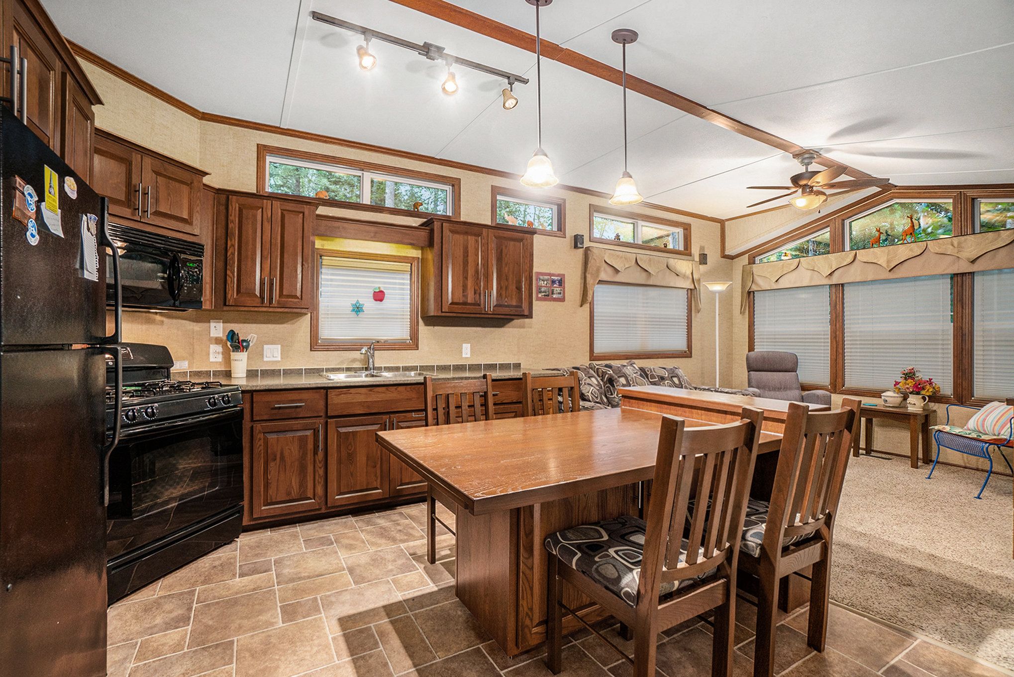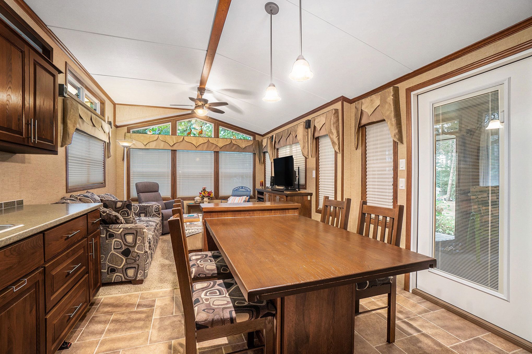 • Spacious trailer with wood cabinetry and vaulted ceilings for a comfortable stay.