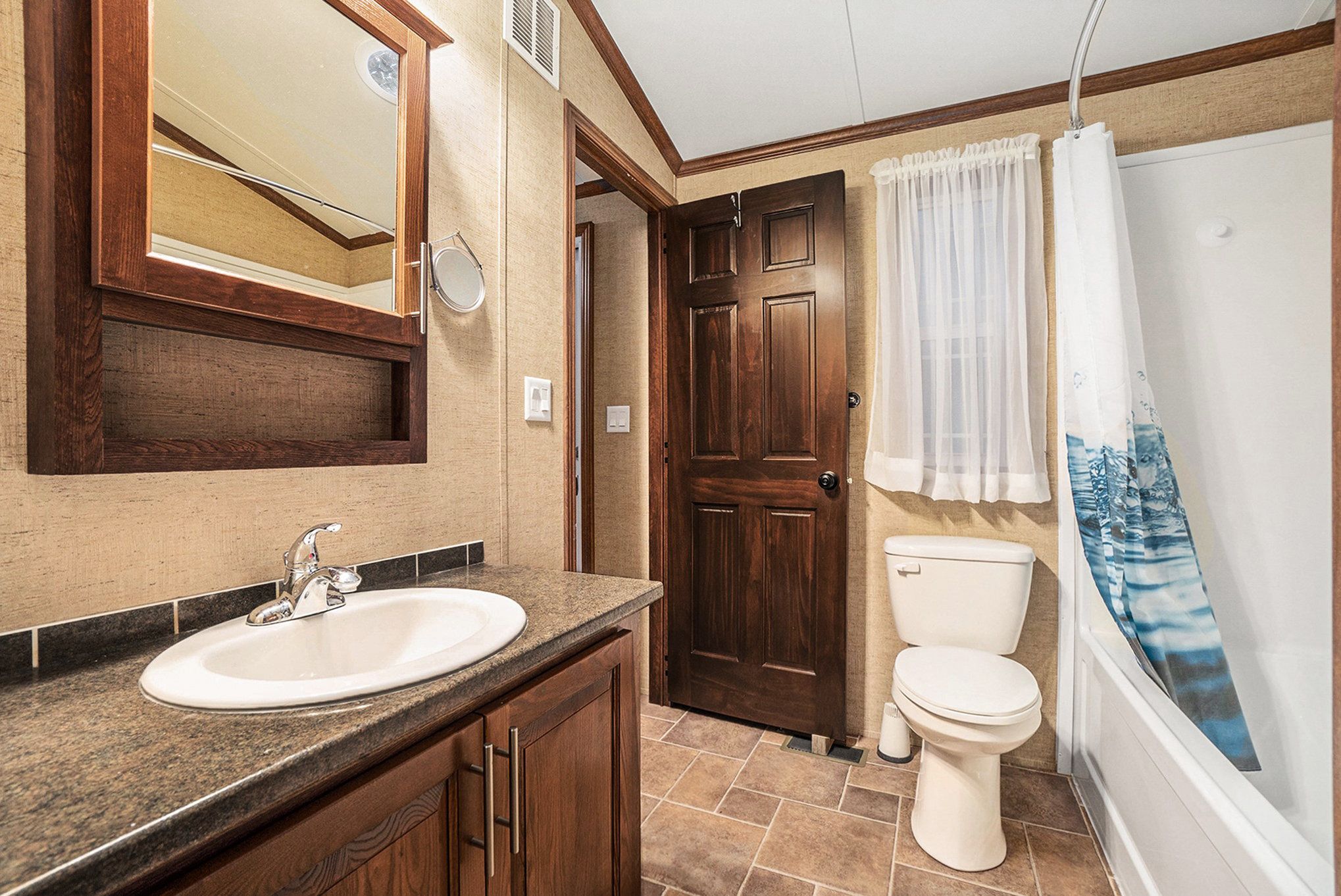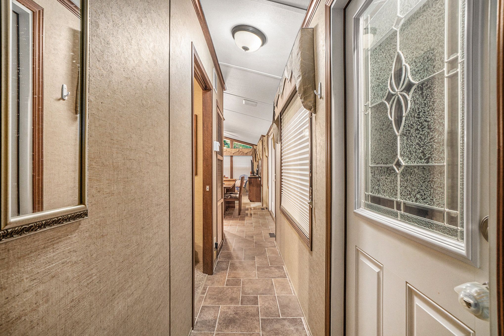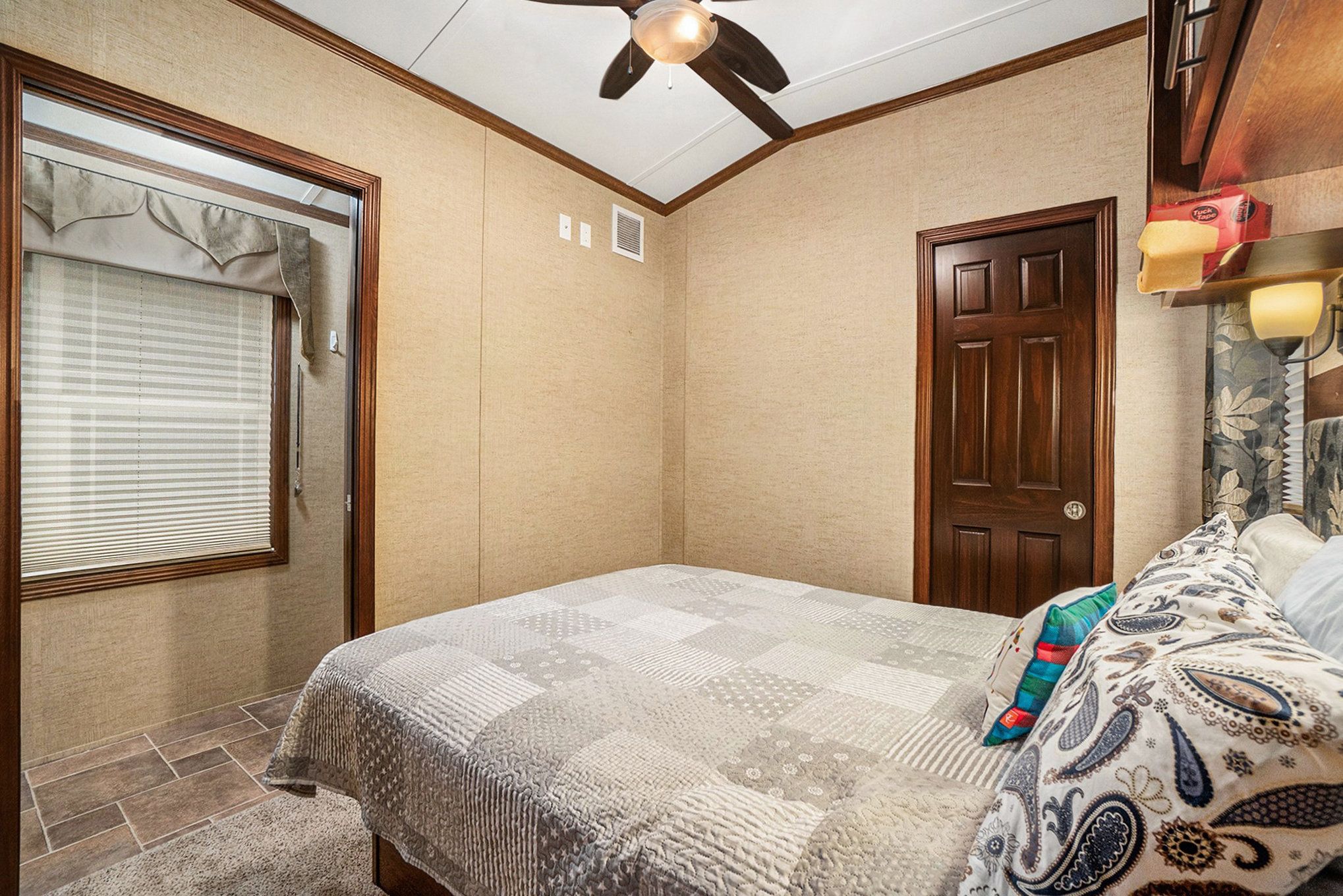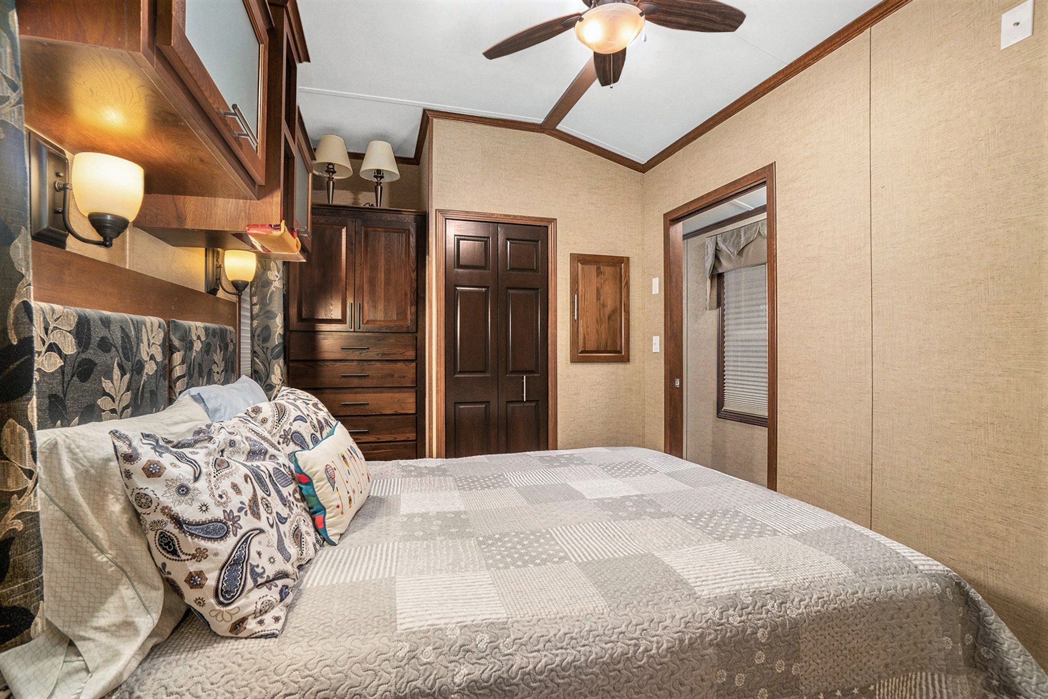 • Spacious trailer with wood cabinetry and vaulted ceilings for a comfortable stay.