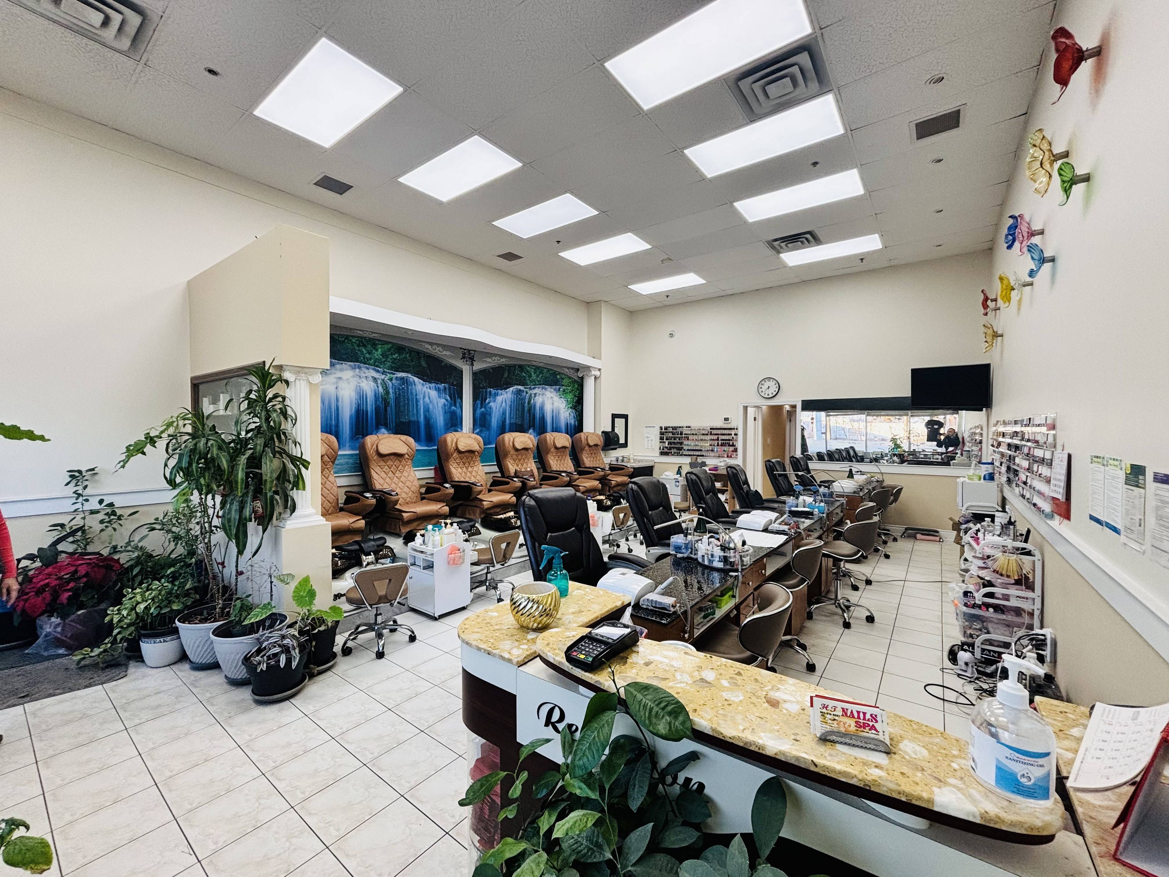 Turnkey nail salon for sale in a prime location within a high-traffic plaza, offering ample parking and anchored by major retailers including a supermarket, dollarama, lcbo, wendy's, tim hortons, td bank, and a variety of other retail stores, ensuring strong and consistent foot traffic throughout the day. The salon features 6 manicure tables, 6 pedicure chairs, 3 private waxing/eyelash rooms, a staff room, a washroom, and a laundry area. Attractive lease at $3,800/month, including tmi, hst, and water - ideal for an owner-operator or investor seeking a stable, established business in a highly desirable commercial hub.