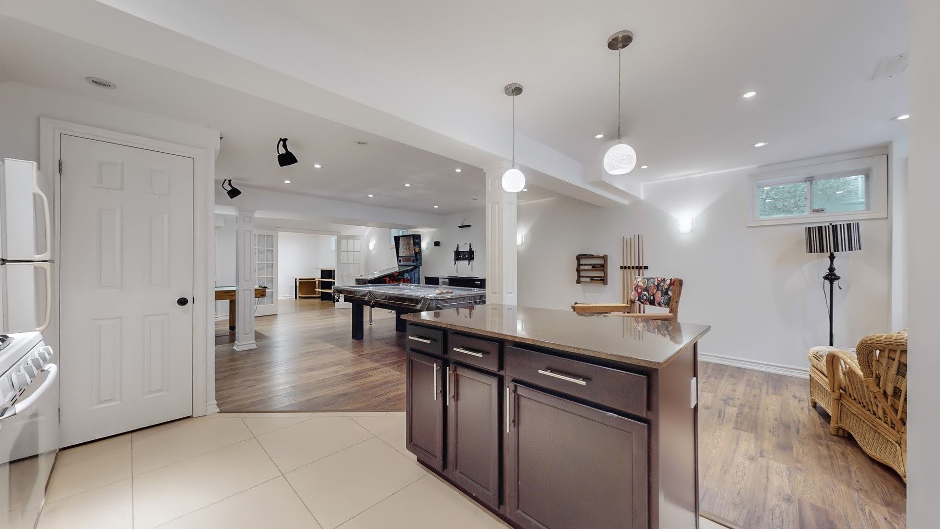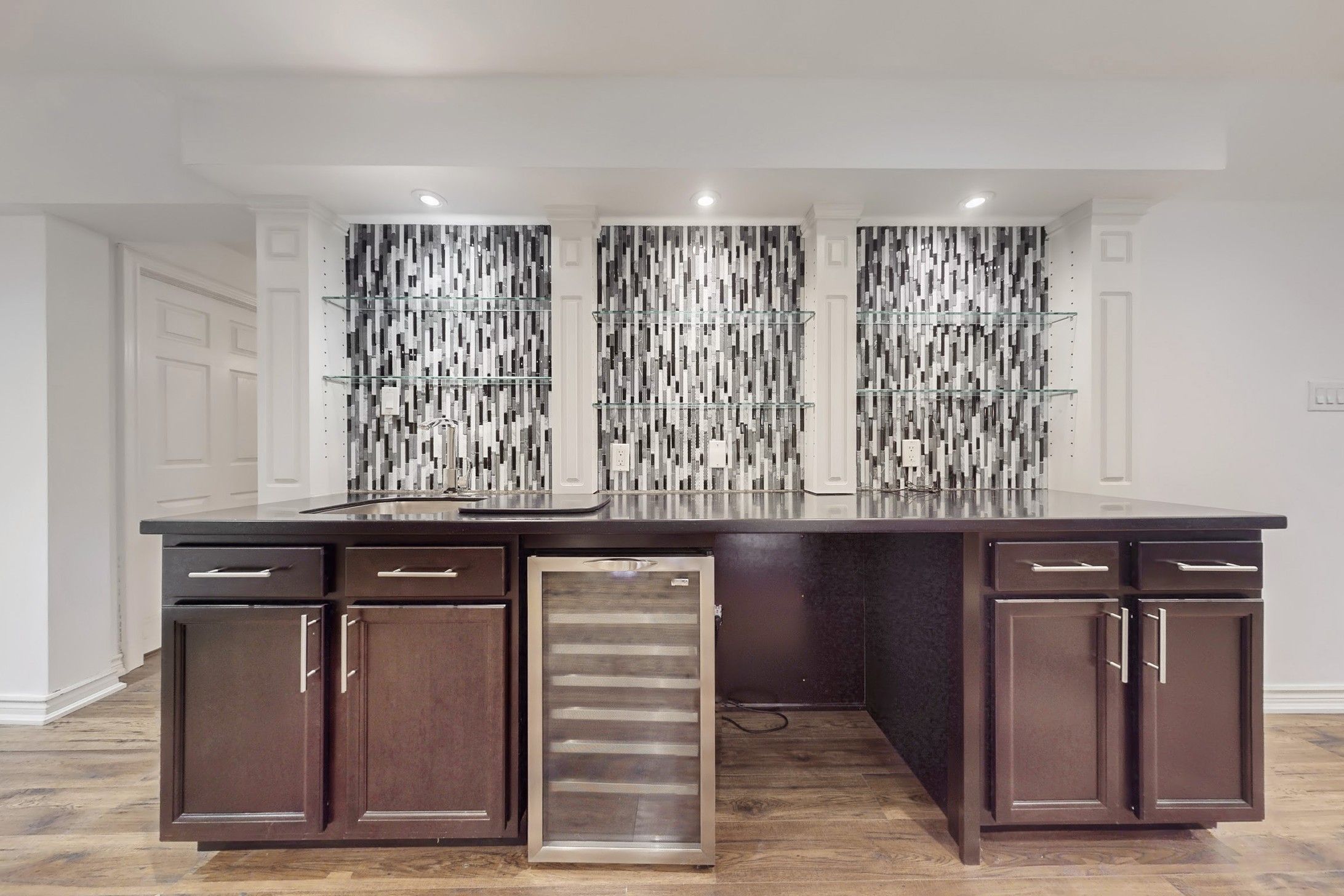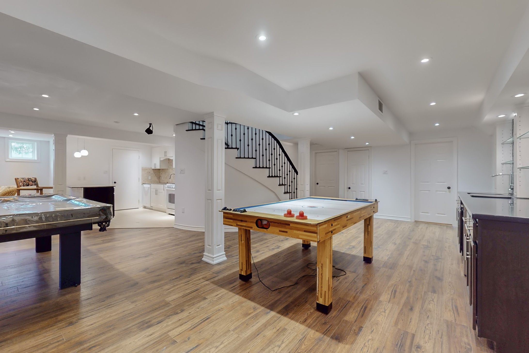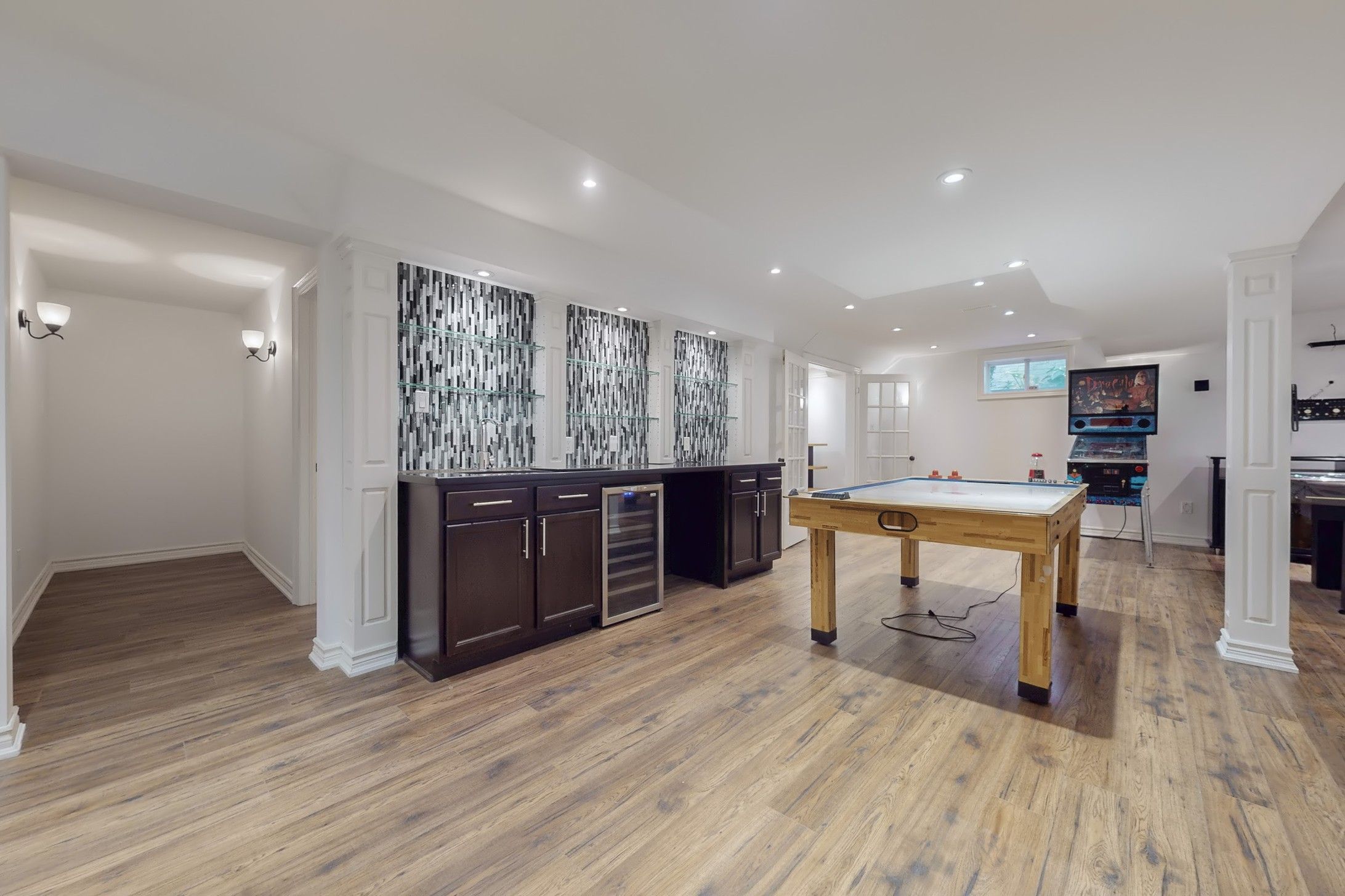 • Fully finished basement with wet bar, additional bedrooms, and office space.