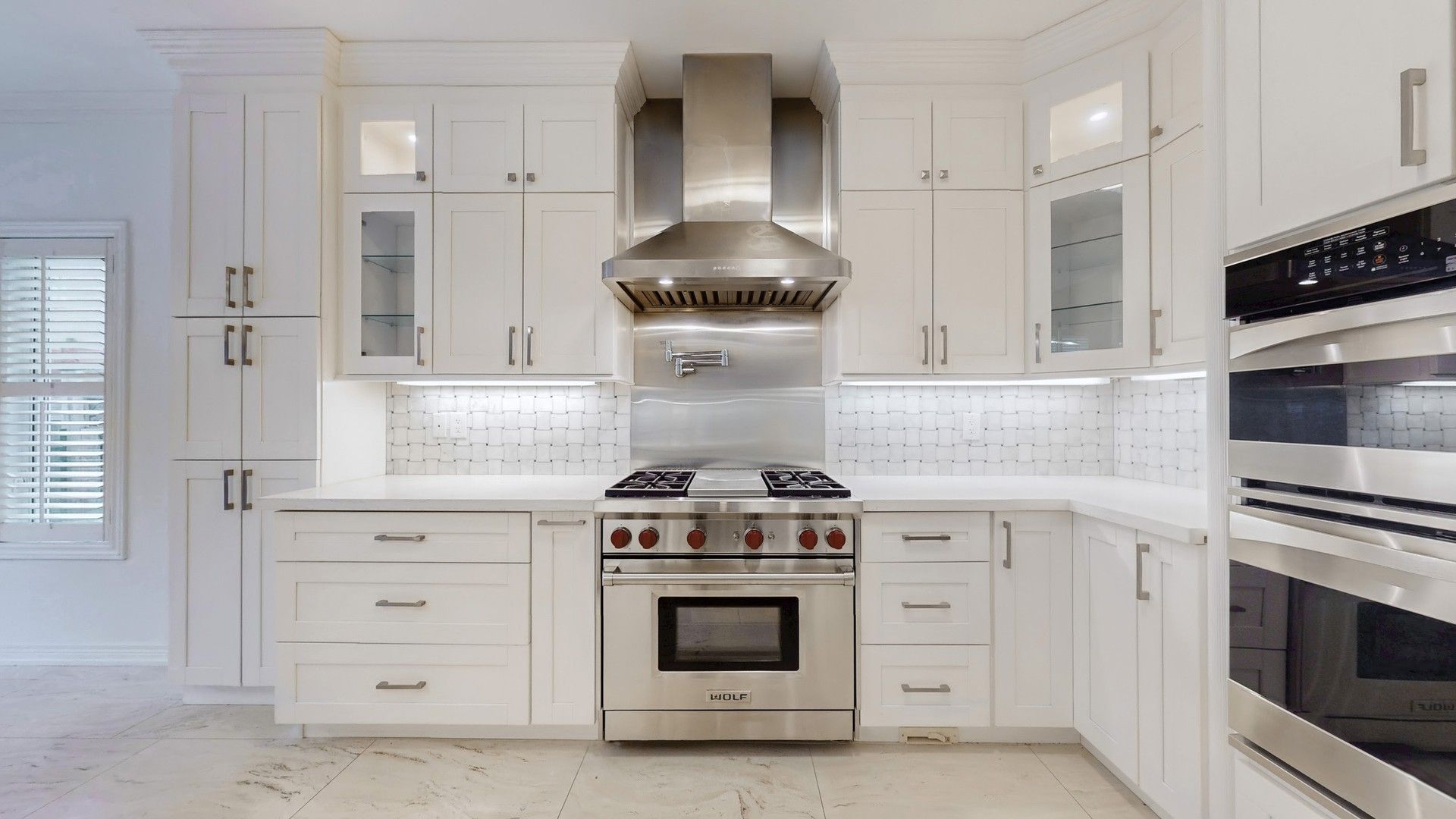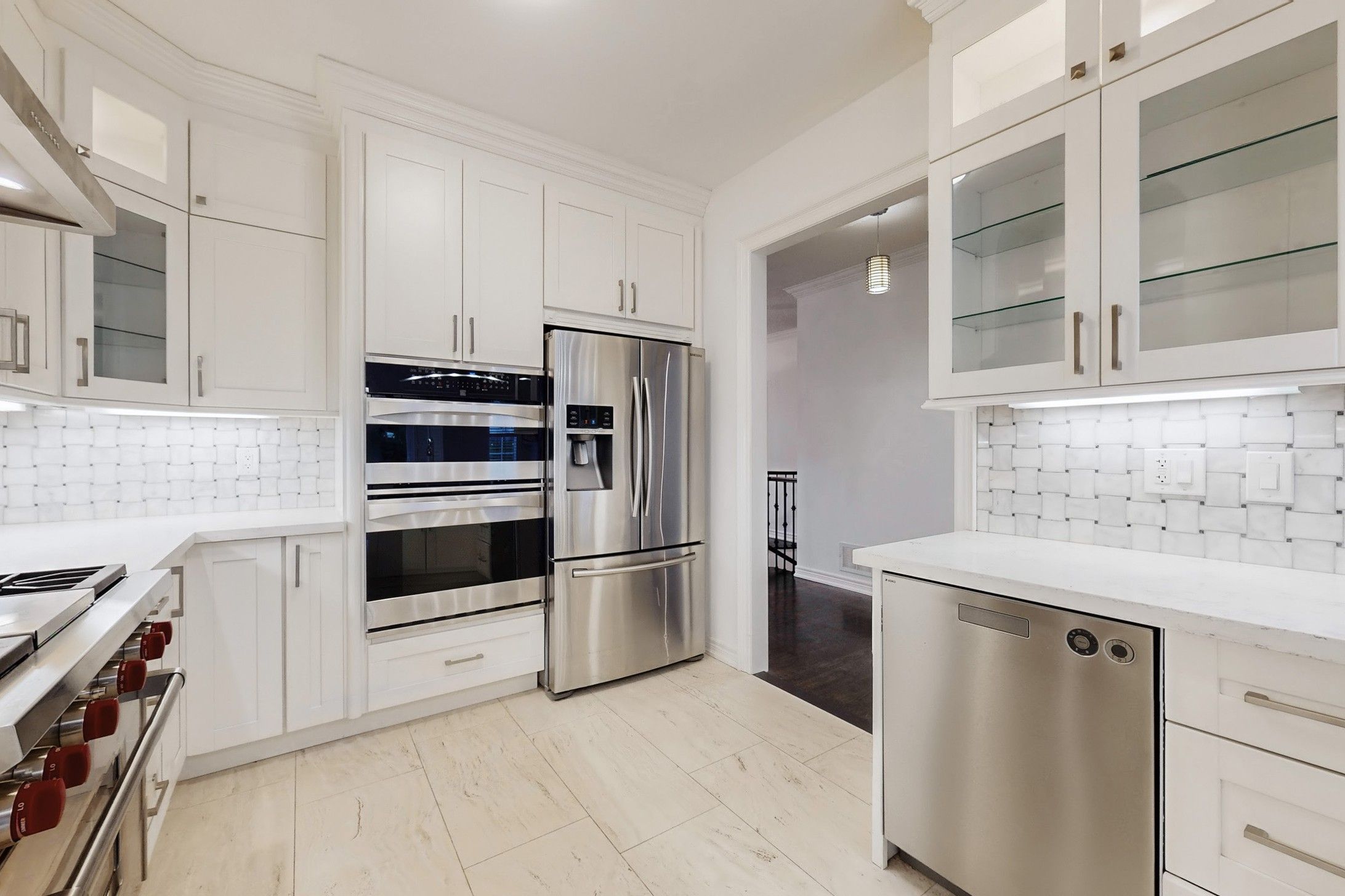 • Custom chef's kitchen with quartz countertops and stainless steel appliances.