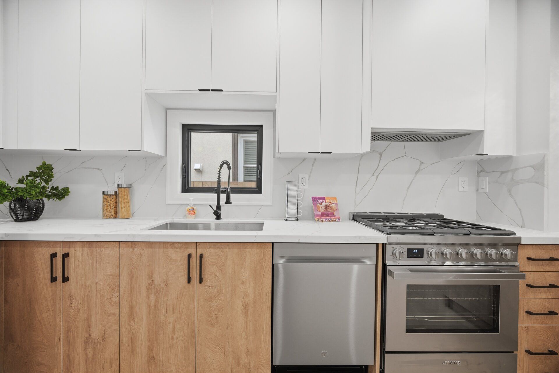 • Modern kitchen with stainless steel appliances and stylish design.